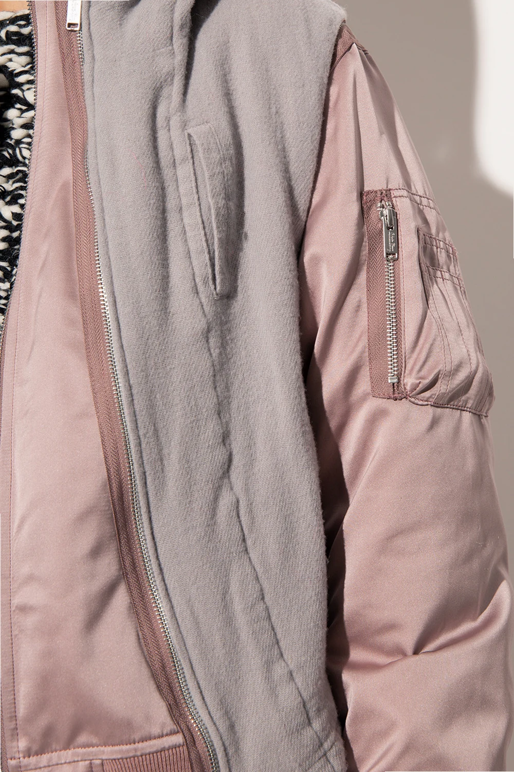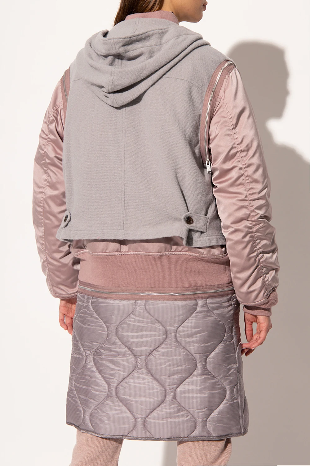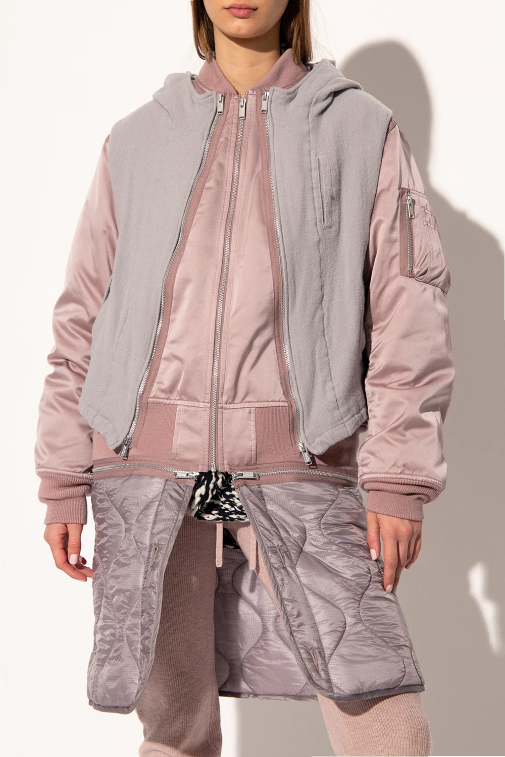 Pink and grey jacket with a hood from Undercover. Fastened with a zipper, this style features three slip pockets, one zipped pocket, distinctive stitching details and zippers, and long sleeves with elasticated cuffs.