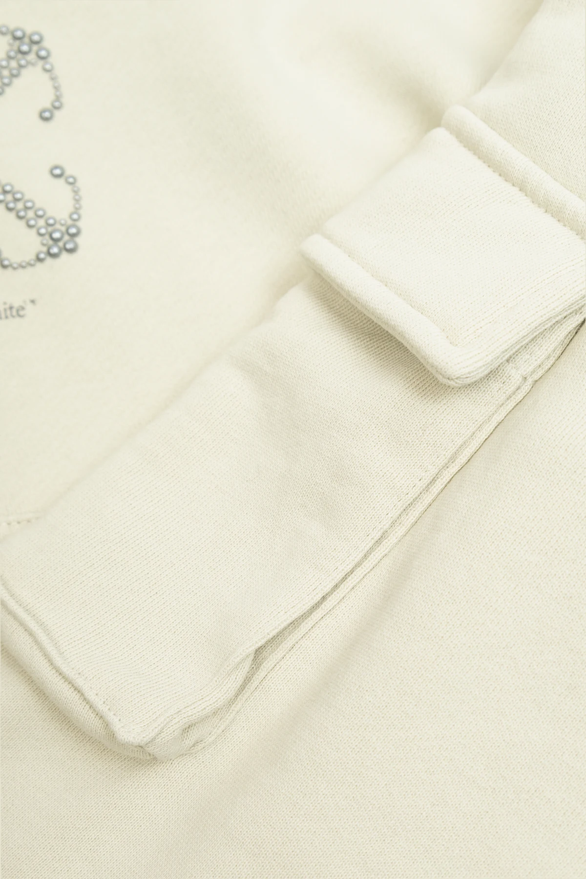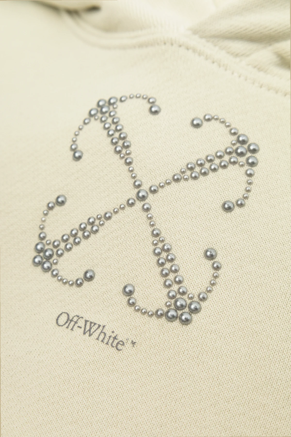 Introducing the Cotton Hoodie by the illustrious brand Off-White™, a masterpiece of contemporary fashion. This hoodie is crafted from the finest cotton, enveloping you in luxurious comfort. Its light beige hue is accentuated by a metallic studded design on the chest, embodying the brand\'s distinctive logo. Below the design, the subtle inscription \"Off-White\" adds a touch of sophistication. Functionality meets style with a classic kangaroo pocket and additional velcro-fastened pockets on the sleeves, perfect for modern utility. An expansive hood enhances its casual allure, making it an ideal choice for both relaxed and refined occasions. Why Choose This Product? Exemplary craftsmanship from the renowned Off-White™ brand. Premium 100% cotton fabric ensures superior comfort. Distinctive metallic detailing for a luxurious touch. Functional design with multiple pockets for convenience. Perfect blend of minimalist style and modern elegance.