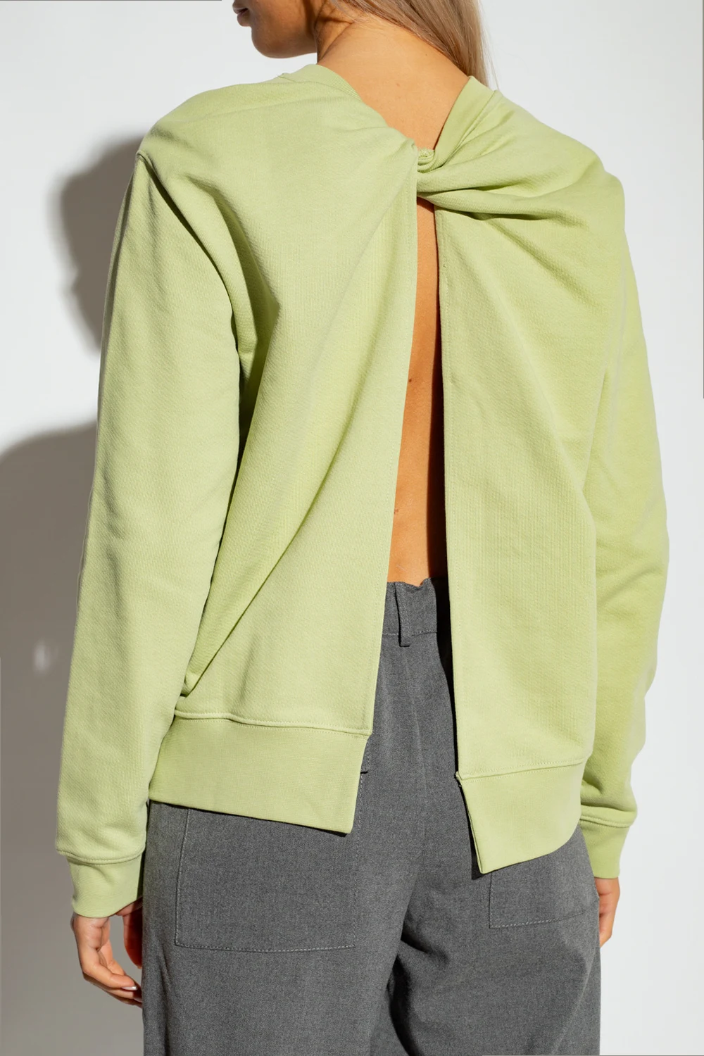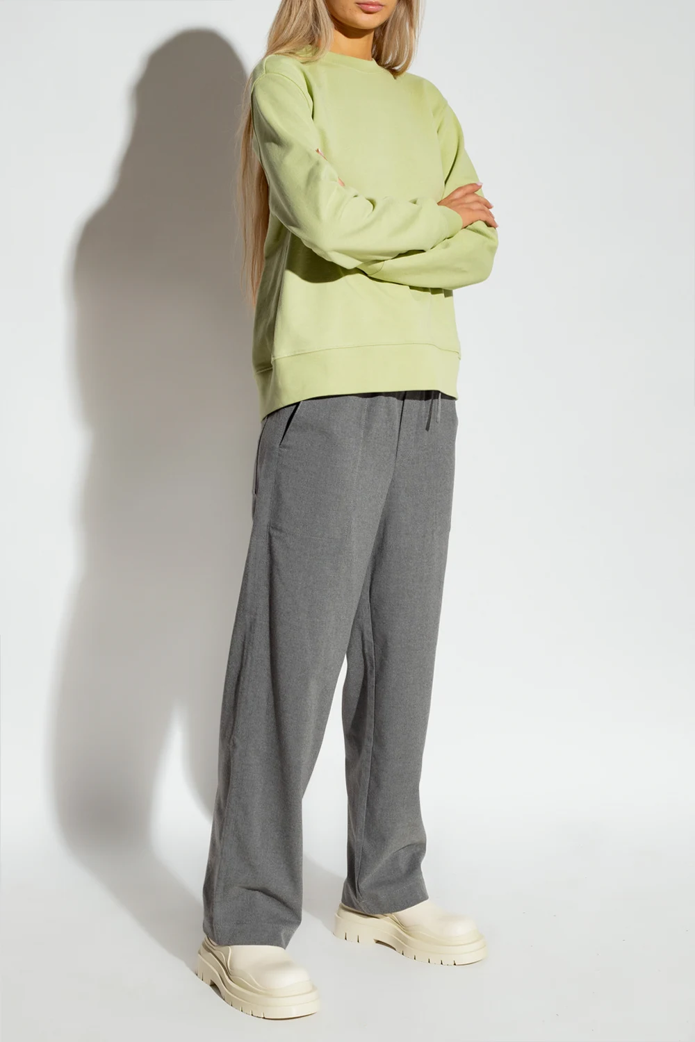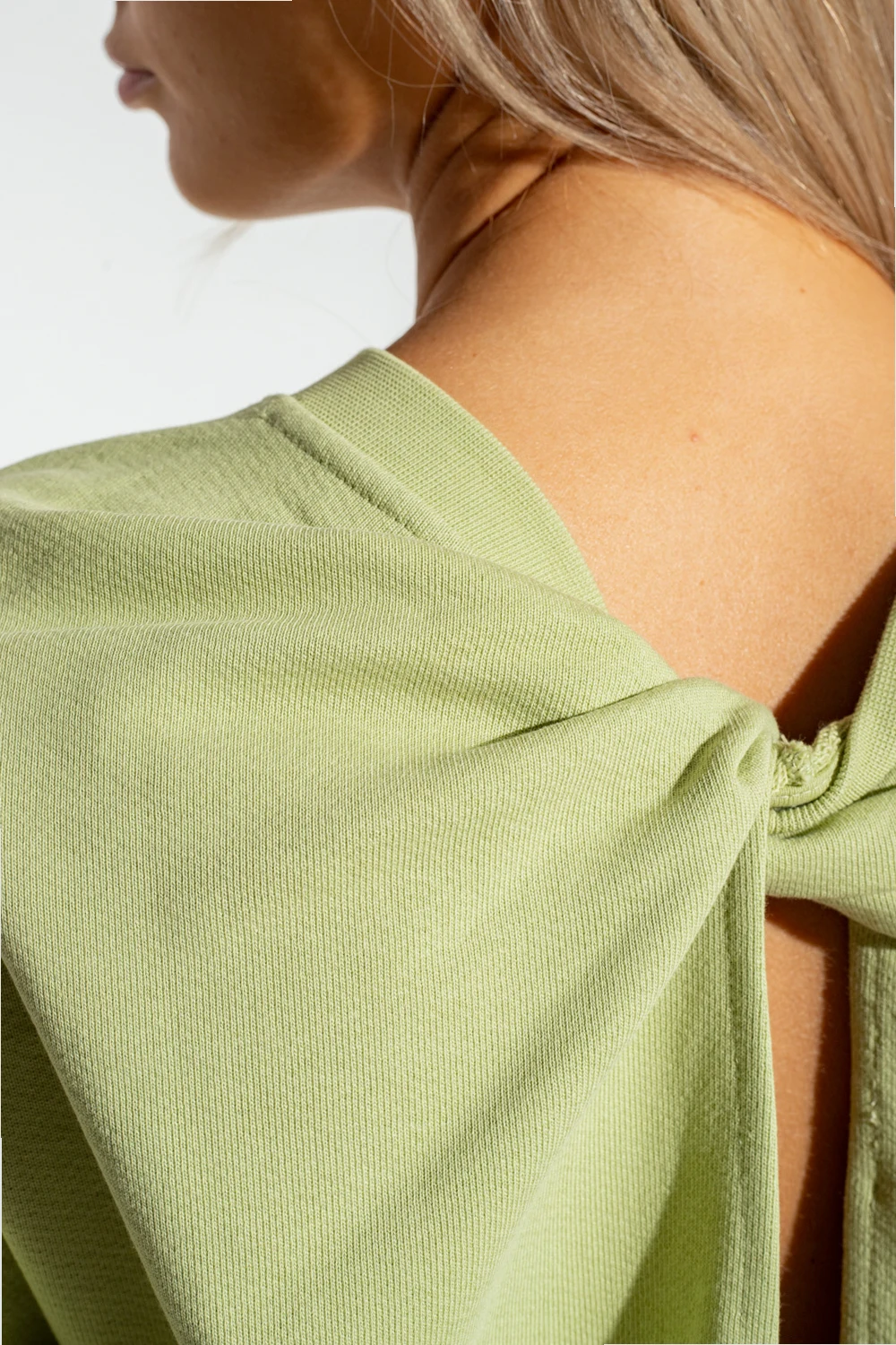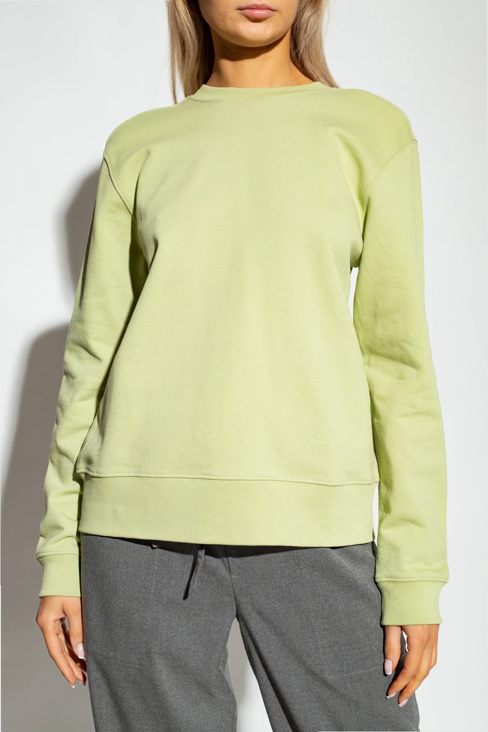 Light green crewneck sweatshirt from Proenza Schouler White Label. Crafted from cotton jersey, this style features a printed logo, a back slit, long sleeves and a ribbed bottom hem and cuffs.