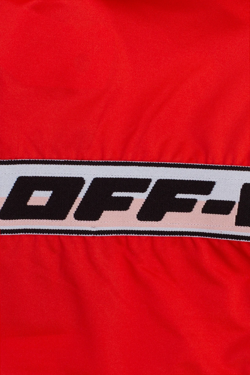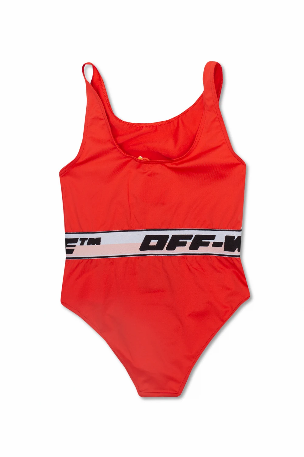 Red one-piece swimsuit from Off-White Kids. This round neck design is decorated with an elastic white and pink waistband embroidered with a black logo.