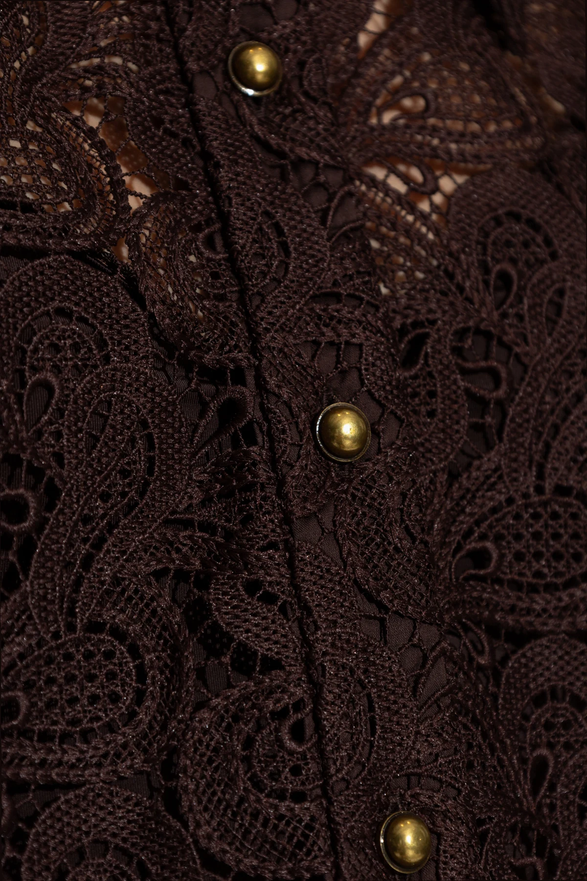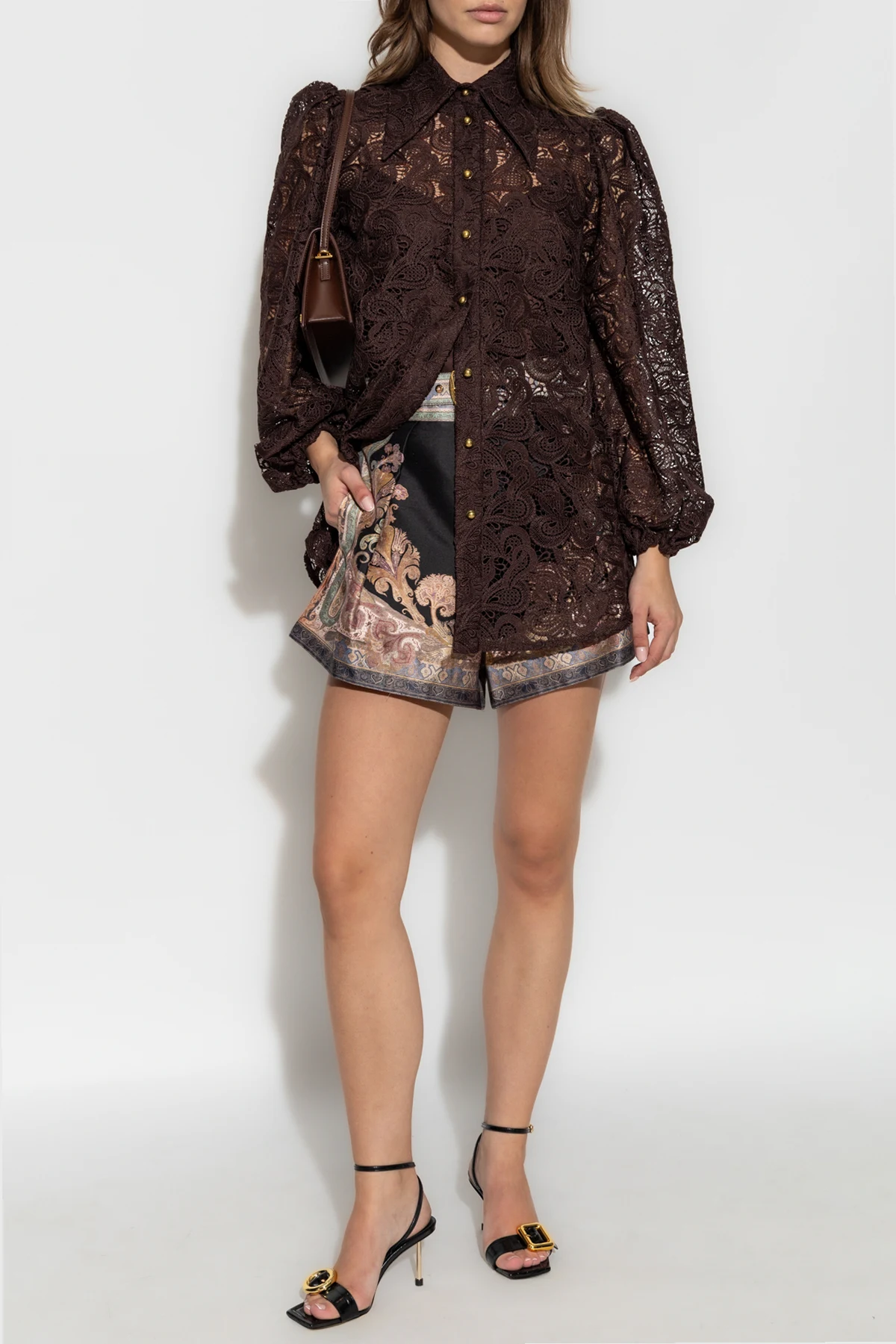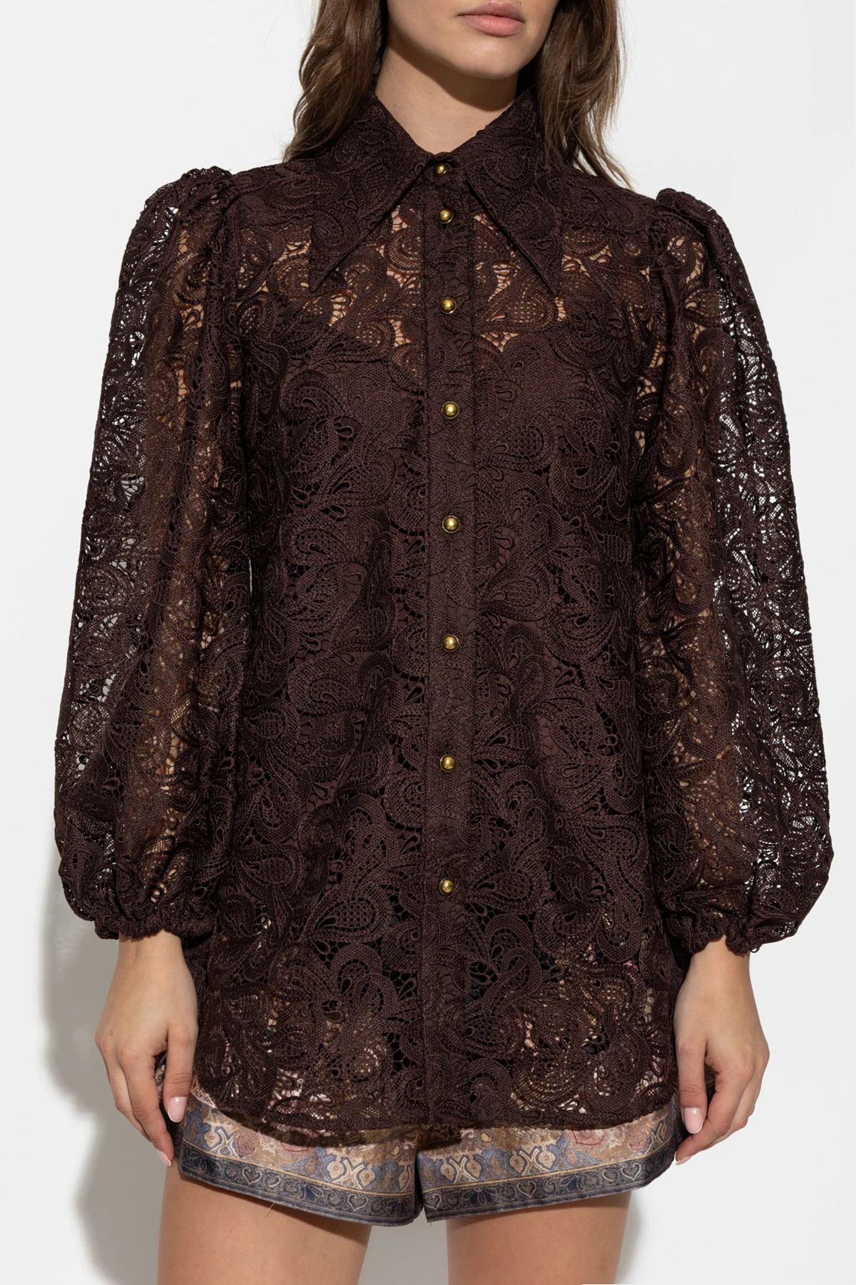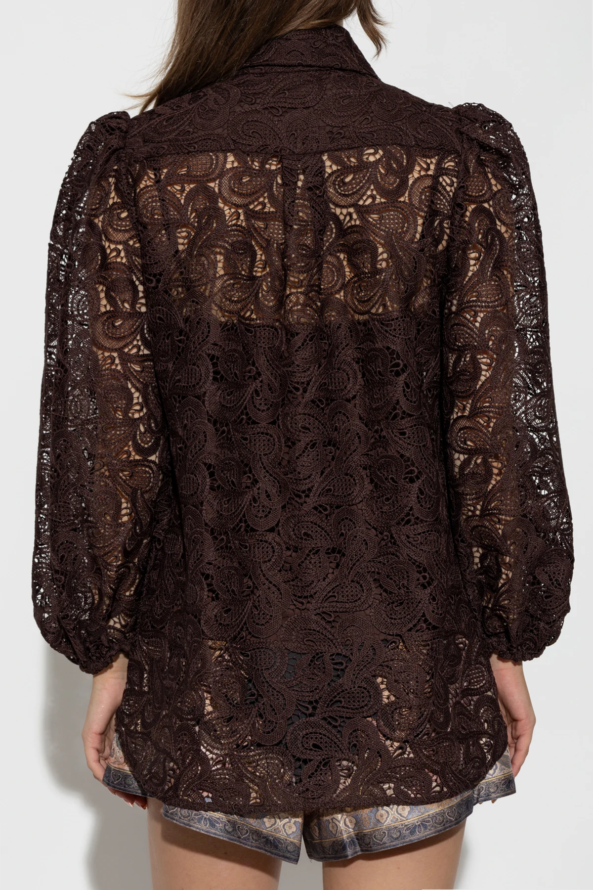 Indulge in the epitome of sophistication with our Zimmermann Lace Blouse, an exquisite piece from the exclusive collection by the renowned sisters Nicky and Simone Zimmermann. This enchanting blouse, presented in a rich dark brown hue, is meticulously crafted from intricate, lace-like fabric, showcasing a delicate, transparent quality that exudes elegance and subtlety. The blouse features long, billowing sleeves with elasticated cuffs, adding an air of drama to its silhouette. A row of petite, golden buttons adorns the front, providing a refined focal point. The classic, wide collar enhances its timeless appeal, while the sumptuous lace pattern, interwoven with botanical and geometric motifs, speaks to unparalleled craftsmanship. Designed with versatility in mind, this blouse pairs effortlessly with elegant shorts, making it suitable for both sophisticated and casual ensembles. Additionally, it includes two pockets with snap closures, ensuring practicality without compromising on style. Why Choose This Product? Exquisite Design: Intricate lace pattern with botanical and geometric motifs. Luxurious Material: Made from 100% polyester, offering a delicate, transparent finish. Elegant Details: Golden button front closure and wide collar for a timeless look. Versatile Styling: Perfectly pairs with both elegant and casual outfits. Functional Features: Includes two pockets with snap closures. Renowned Brand: Designed by Zimmermann, known for their artistic and feminine ready-to-wear collections.