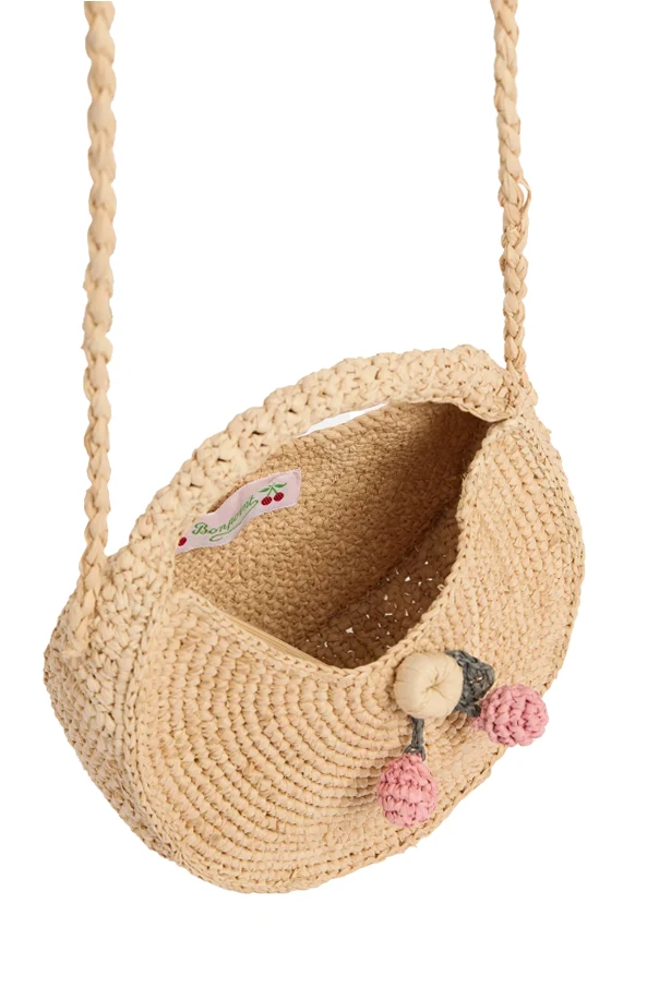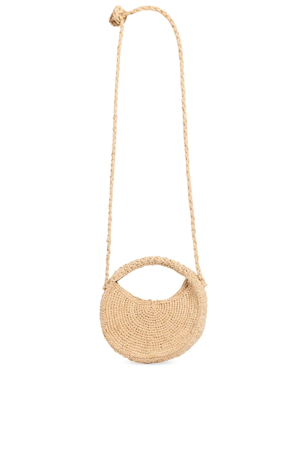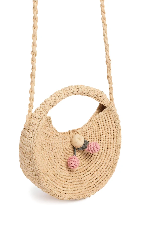 Introducing the Loulou Handbag by Bonpoint—a charming accessory designed to elevate any young wardrobe. This exquisite piece captivates with its beige hue and gracefully rounded, semicircular silhouette, elegantly fused with an integrated top handle reminiscent of a classic basket. Meticulously crafted from a straw-like material that evokes the breezy allure of raffia, the handbag is both lightweight and summer-inspired.