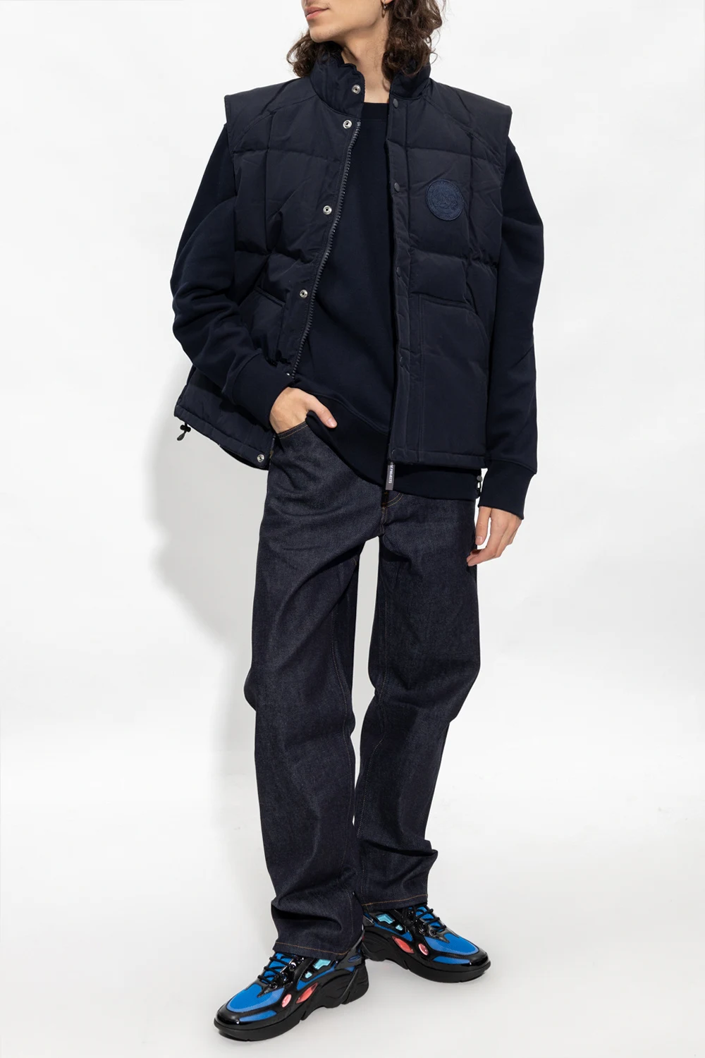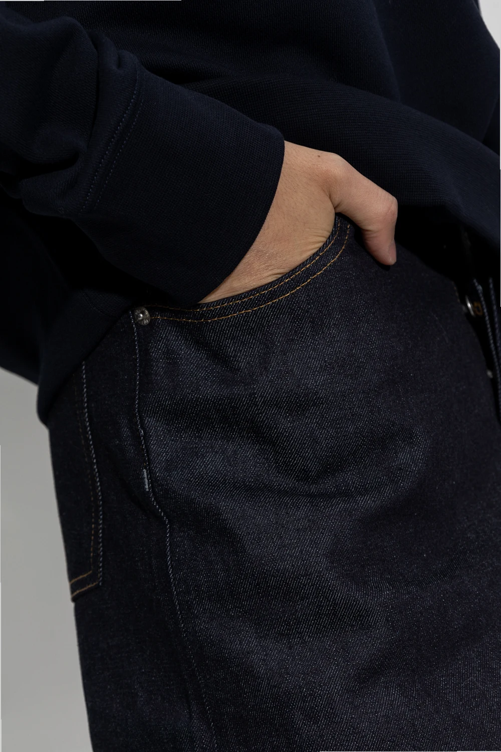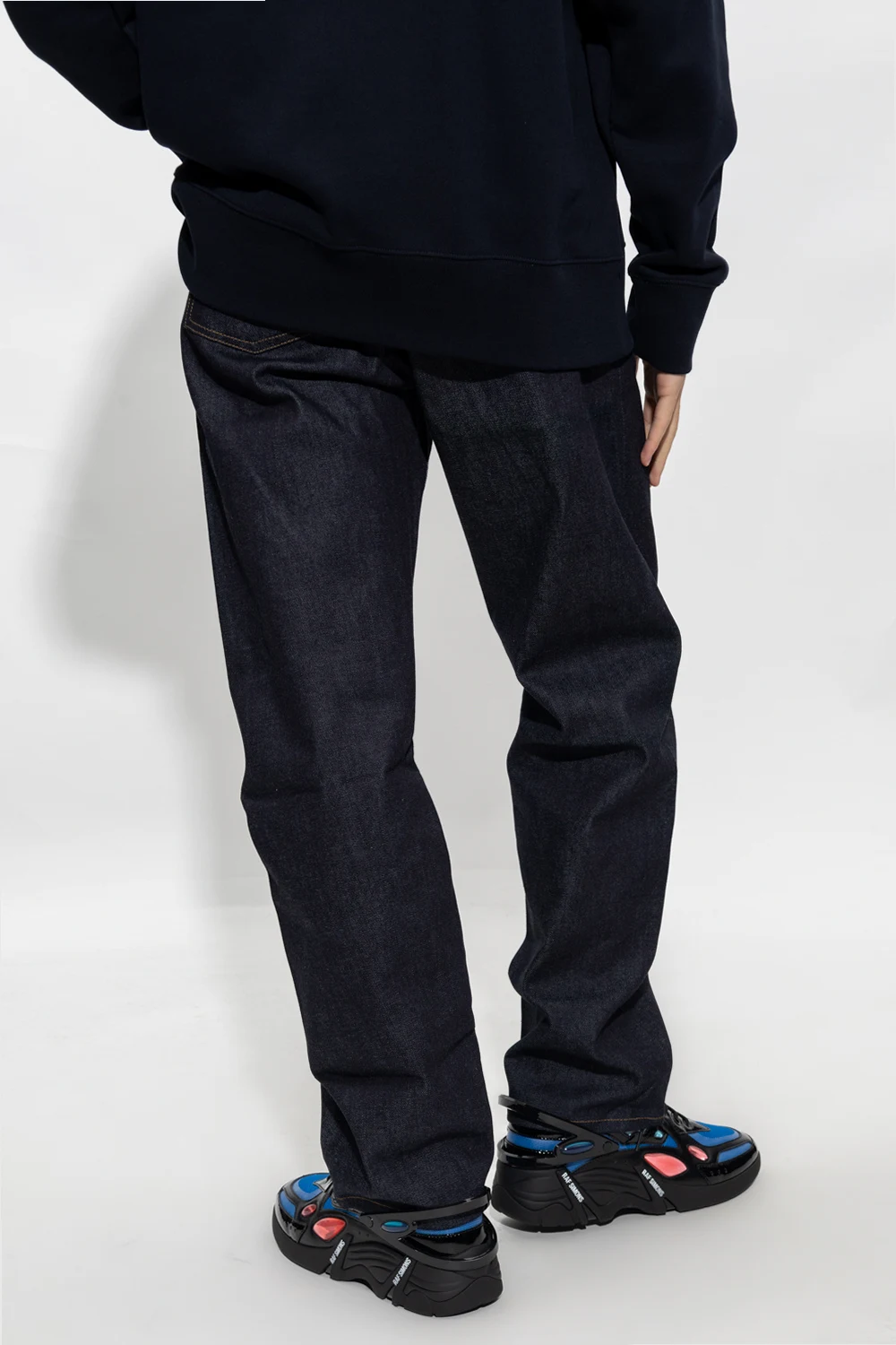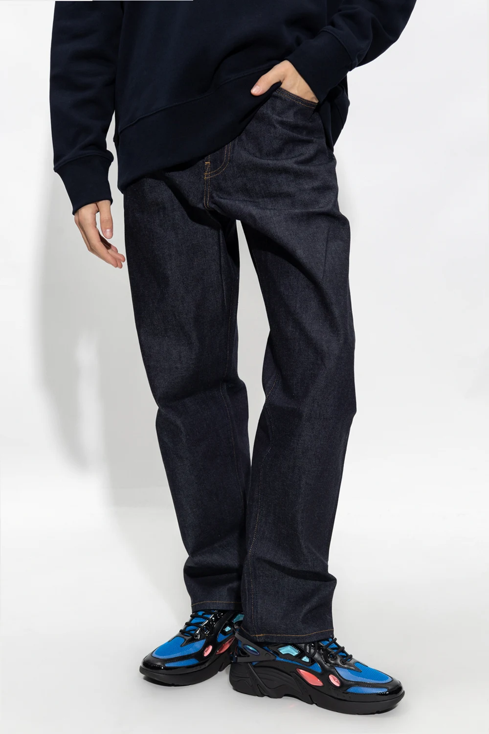 Navy blue jeans from Norse Projects. Falling with slightly tapered legs, this pair features a relaxed fit, button fastenings, beige stitching details and classic five pockets.