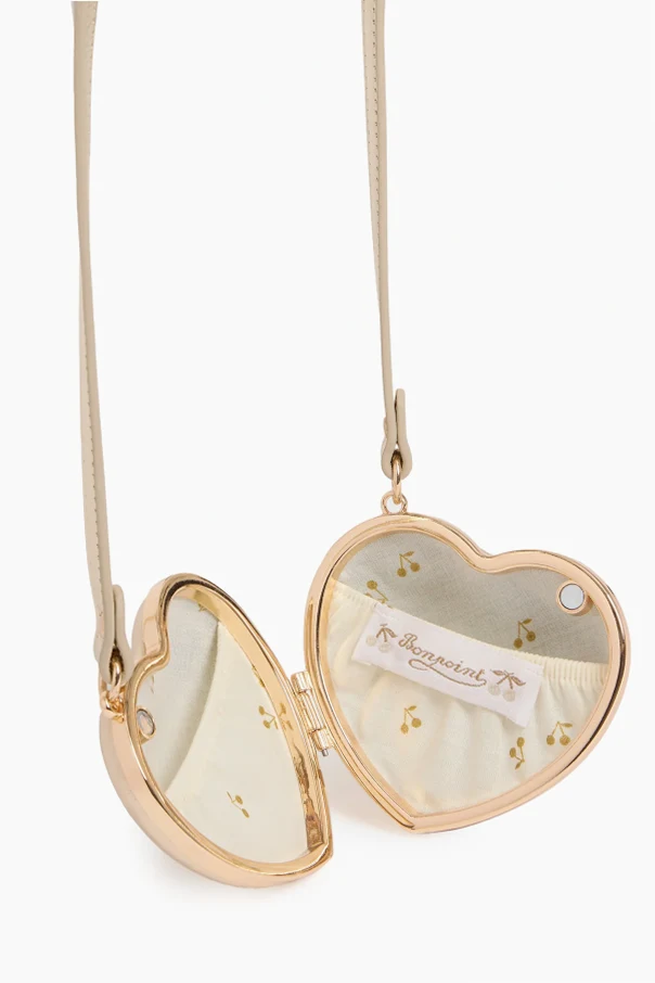 The standout heart silhouette is adorned with delicate, shimmering cherry motifs—Bonpoint’s iconic emblem—artfully arranged from sparkling embellishments for a touch of whimsical elegance. A slender, elongated strap in matching gold allows for versatile wear, either on the shoulder or crossbody, ensuring comfort and poise for any occasion.