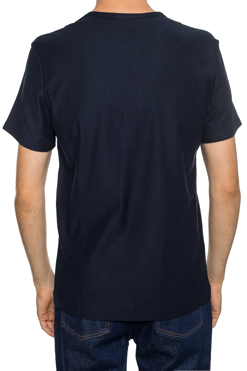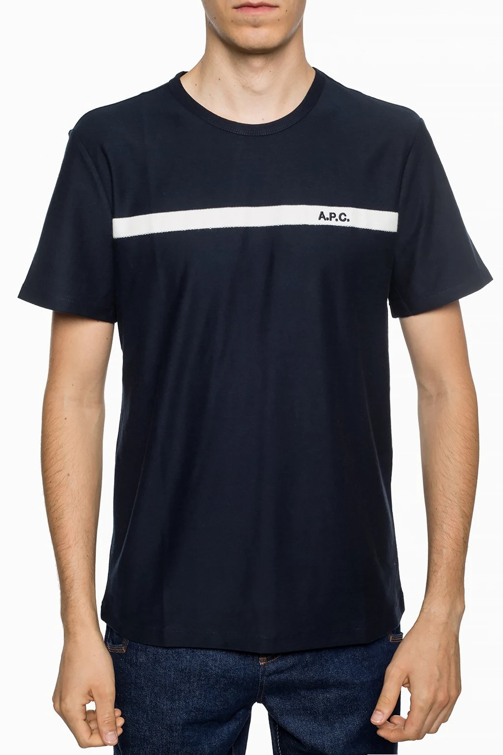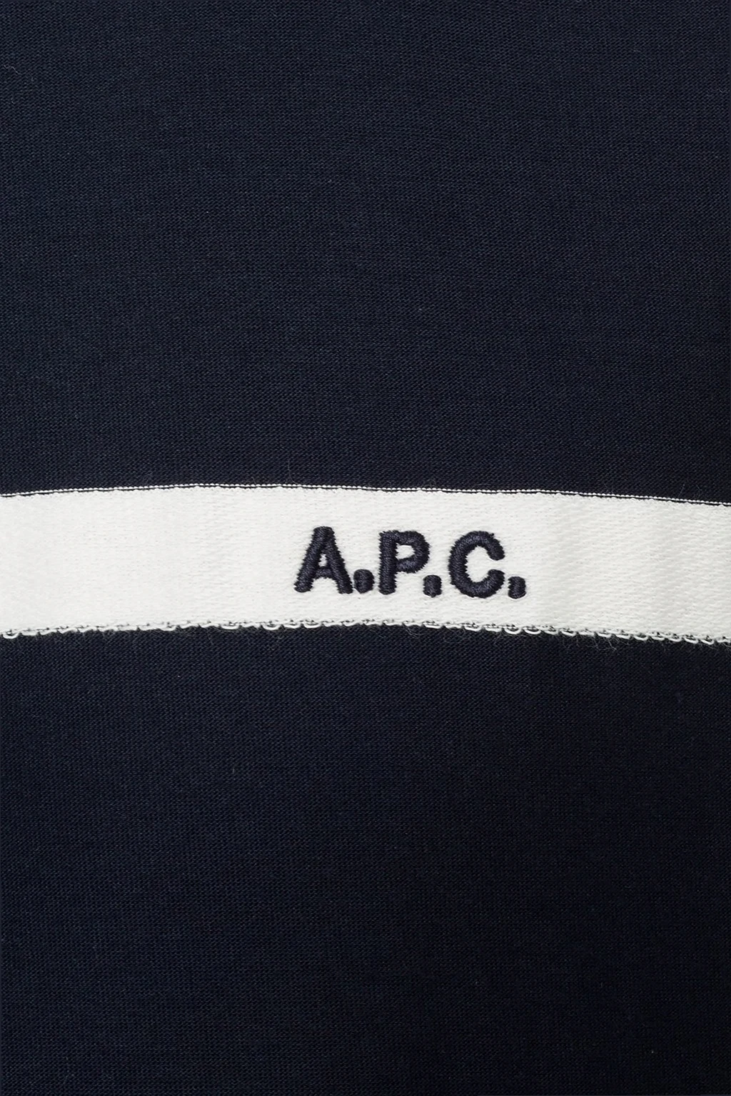 Navy T-shirt from A.P.C. Made of cotton. Front decorated with an embroidered stripe featuring a logo in white and navy. Round neck. Short sleeves.
