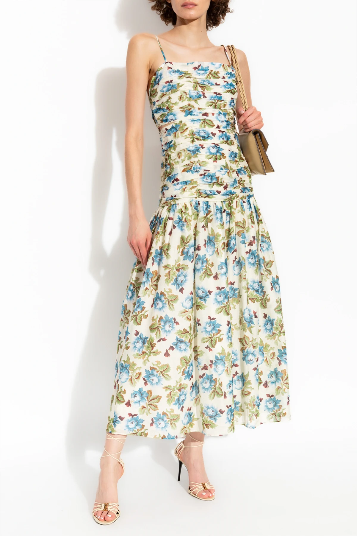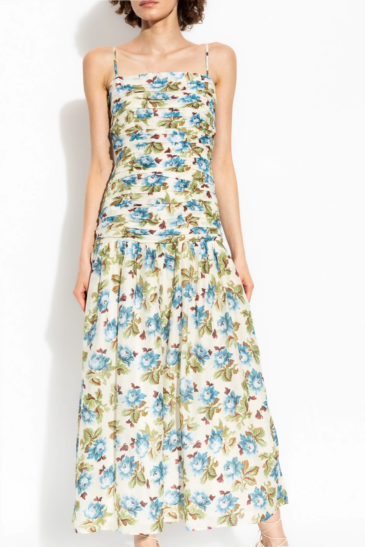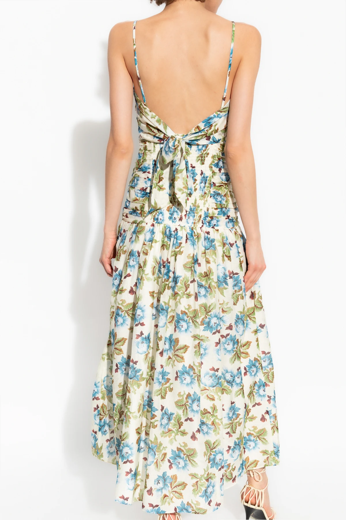 Introducing the exquisite Floral Motif Maxi Dress by the renowned Australian brand POSSE. This elegantly crafted dress epitomizes sophistication and timeless beauty, making it a quintessential addition to your wardrobe. Designed with meticulous attention to detail, this dress features a flattering maxi length that gracefully reaches the ankles, complemented by delicate thin straps and a fitted bodice adorned with intricate ruching. The voluminous, flared skirt cascades effortlessly, imbuing the dress with a sense of lightness and freedom. The dress showcases a captivating floral pattern in shades of blue, green, and brown on a luminous backdrop, offering a romantic and classic appeal. The lightweight blend of cotton and silk ensures breathability and comfort, ideal for warm summer occasions. Additional distinctive features include a dramatic V-shaped back cutout and an ornamental knot, enhancing the dress\'s elegance and uniqueness. The discreet side zipper ensures a seamless fit and polished look. Why You Should Buy This Product Timeless floral design suitable for various occasions. Luxurious blend of cotton and silk. Elegant maxi length with a flattering silhouette. Unique back details with a V-shaped cutout and decorative knot. Expert craftsmanship by the esteemed POSSE brand.