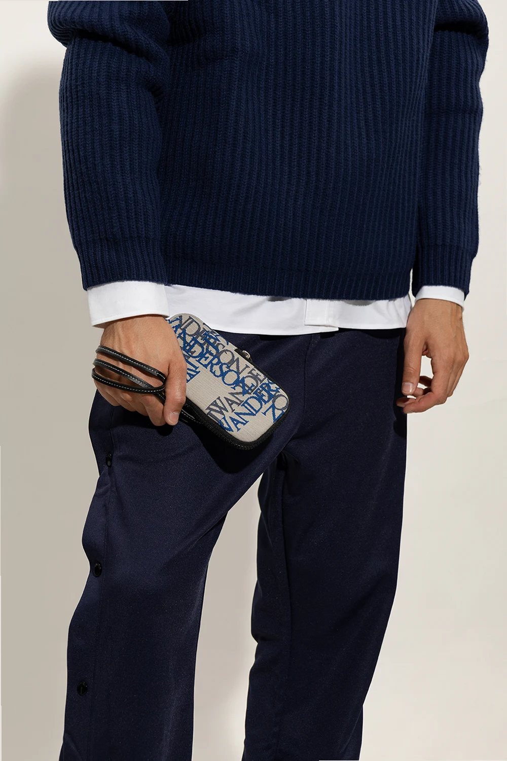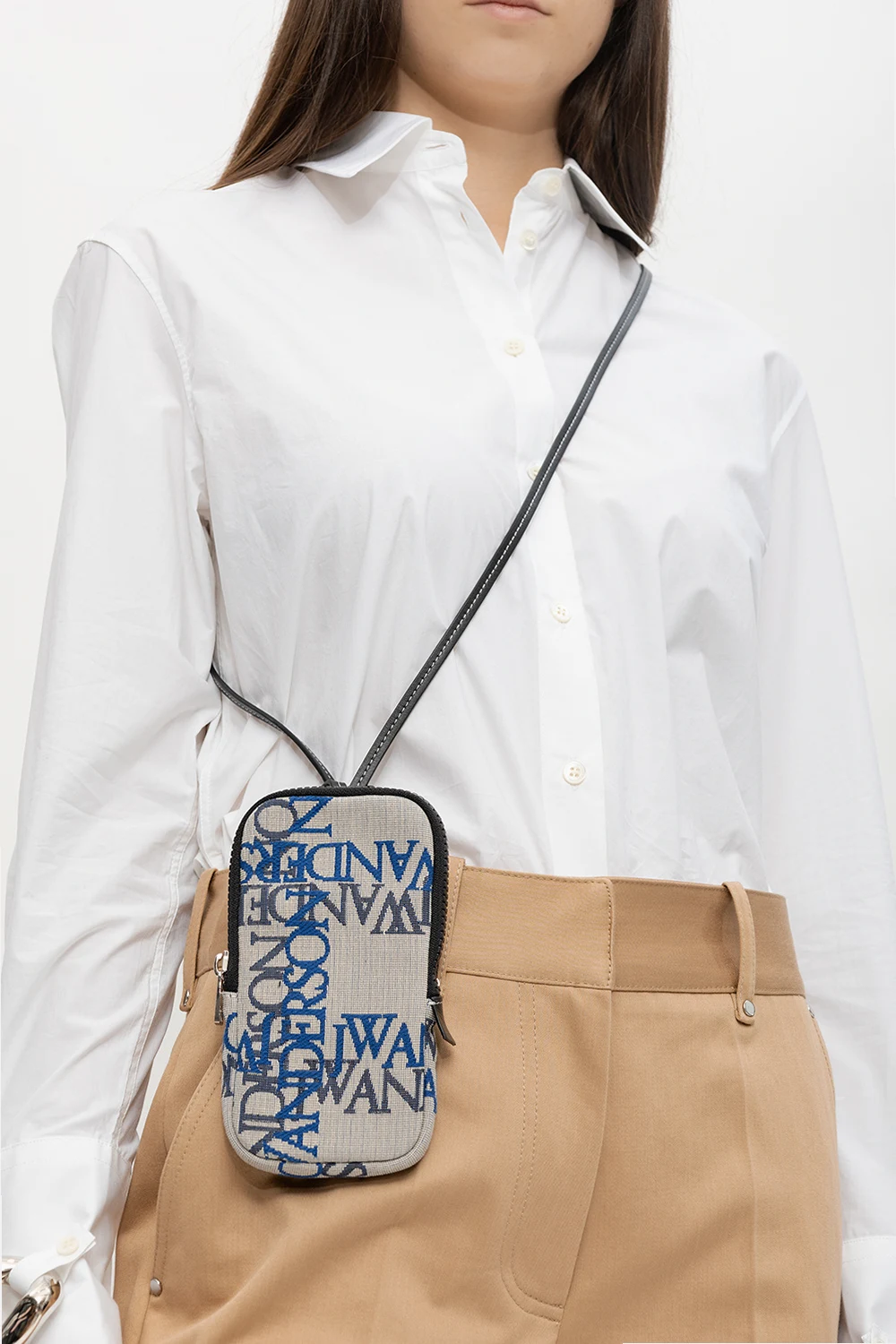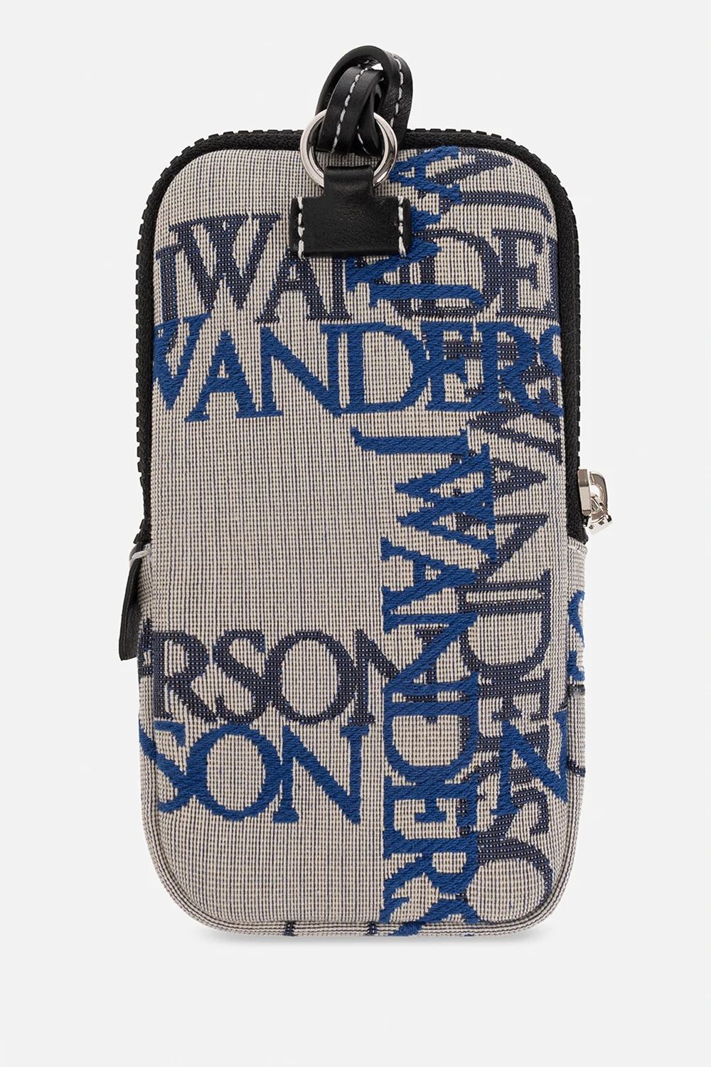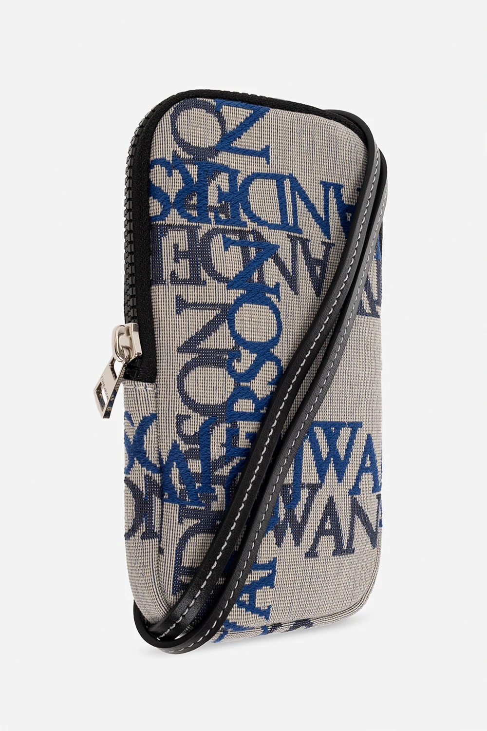 Grey, blue and black phone holder from JW Anderson. Crafted from organic cotton and fastened with a zipper, this item features a logo pattern, a detachable shoulder strap, silver-tone metal hardware and one internal compartment with two slip pockets.