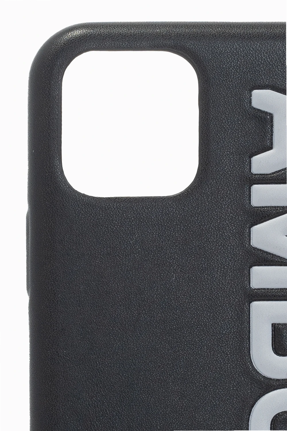 Black iPhone 11 Pro case from Ambush. Made of plastic, this item showcases a white tactile logo.