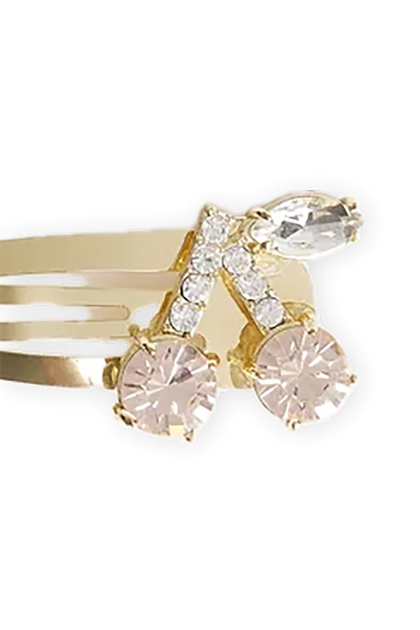 The captivating design highlights a stylized, cherry-inspired motif: two pale pink stones paired with sparkling accent crystals arranged gracefully in a V-shape, crowned by a shimmering, clear elliptical gem. The absence of overt branding speaks to understated sophistication, allowing the unique artistry and Parisian heritage of Bonpoint to shine.