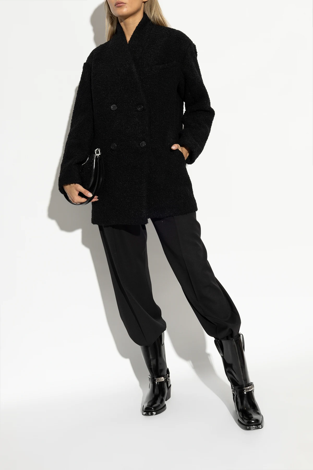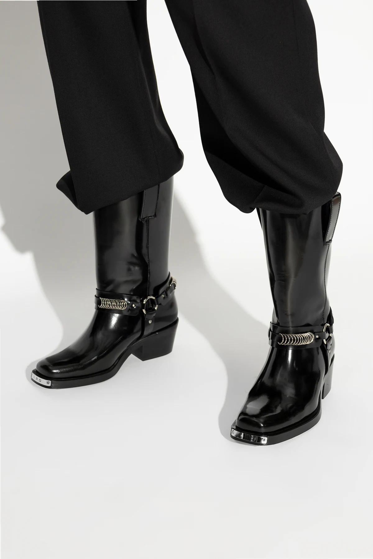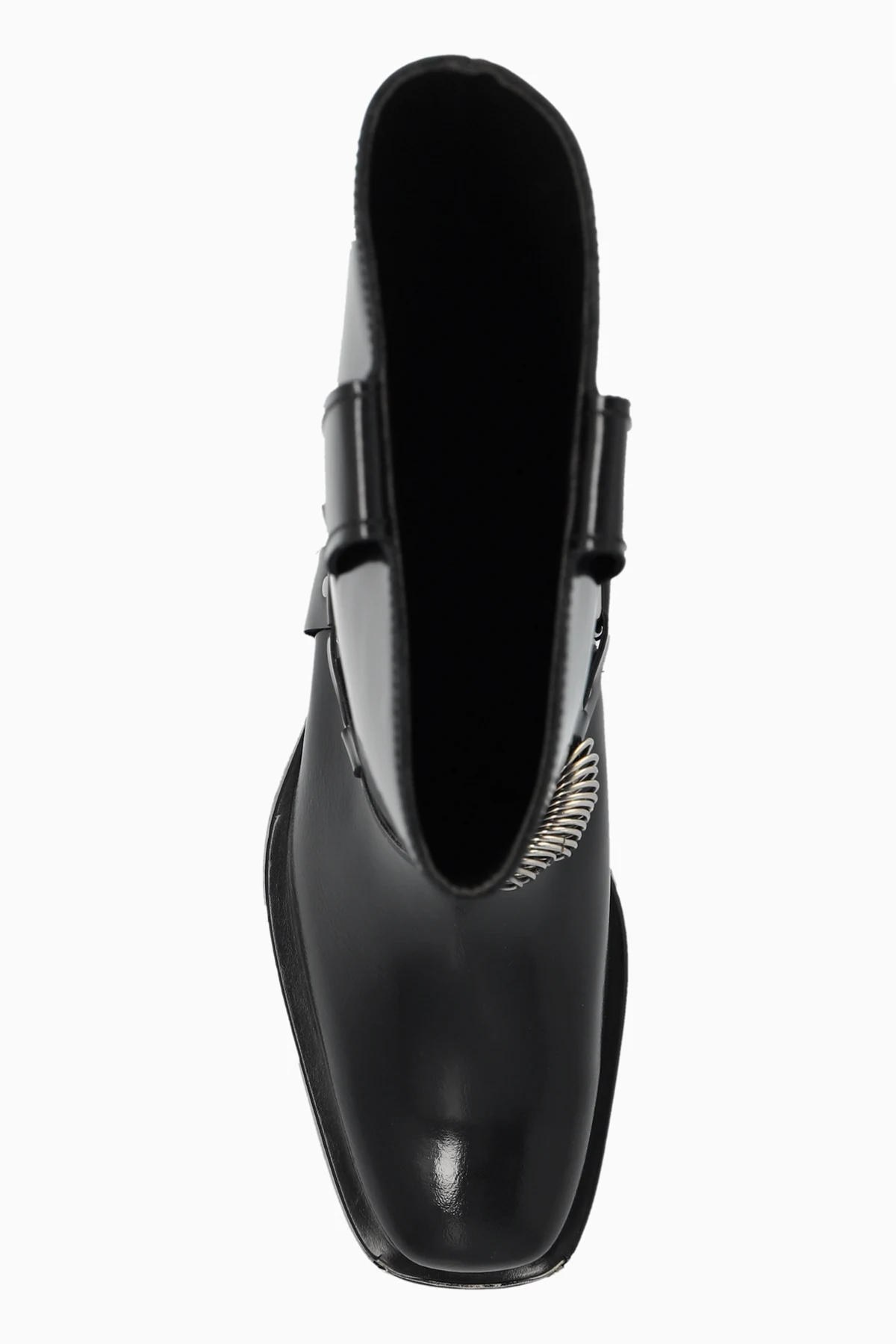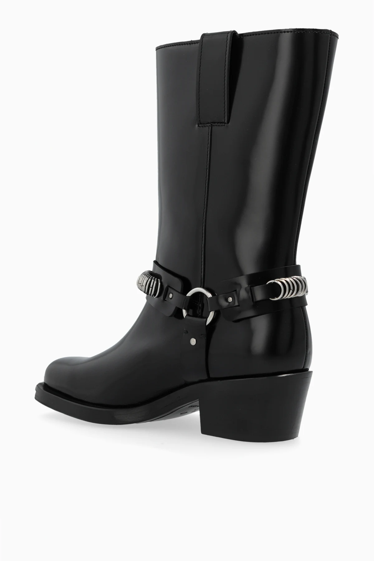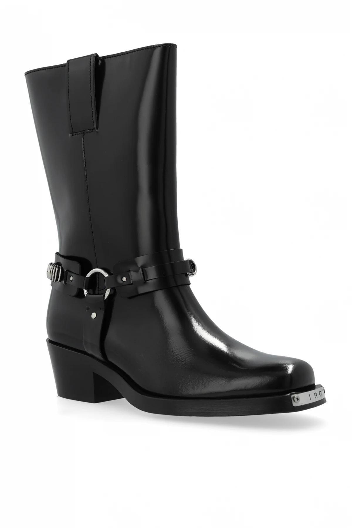 Introducing the exquisite Motty Ankle Boots by Iro, a paragon of elegance and minimalist sophistication. These boots are crafted from premium patent leather, offering a sleek and lustrous finish that exudes luxury. The Motty boots feature a classic, streamlined silhouette with a gently rounded shaft that reaches mid-calf. The medium-height, wide heel ensures both style and stability, making them perfect for any occasion. The boots are adorned with a distinctive strap, embellished with metallic elements that wrap around the ankle, fastened with metal rings, adding a touch of rock-inspired charm. A metal detail on the front of the sole further enhances their unique character. The Motty boots come in a versatile black hue, ensuring they complement a wide array of ensembles, from casual to formal. The robust, thick sole provides exceptional comfort, making them as practical as they are stylish. The meticulous craftsmanship and superior materials attest to the boots\' exclusive nature. Why Choose This Product? Crafted from high-quality patent leather for a glossy, sophisticated look. Unique metallic strap and detailing for a distinctive, chic appeal. Comfortable, wide heel and thick sole for all-day wear. Versatile black color for effortless pairing with various outfits. Designed by Iro, a brand synonymous with Parisian elegance and modern edge.