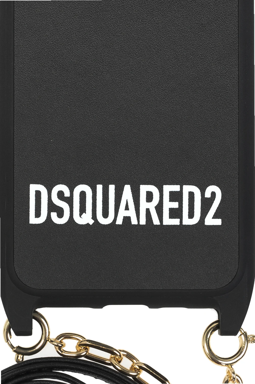 Black iPhone 11 Pro case from Dsquared2. Printed with the brand\'s logo in white, this item comes with an attached strap.
