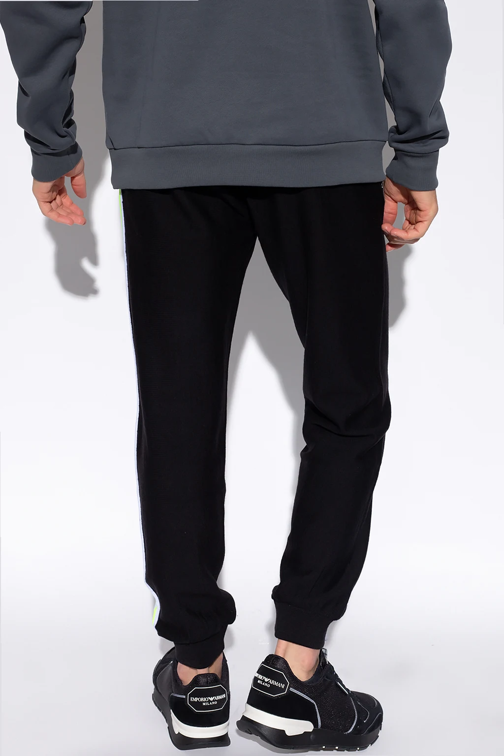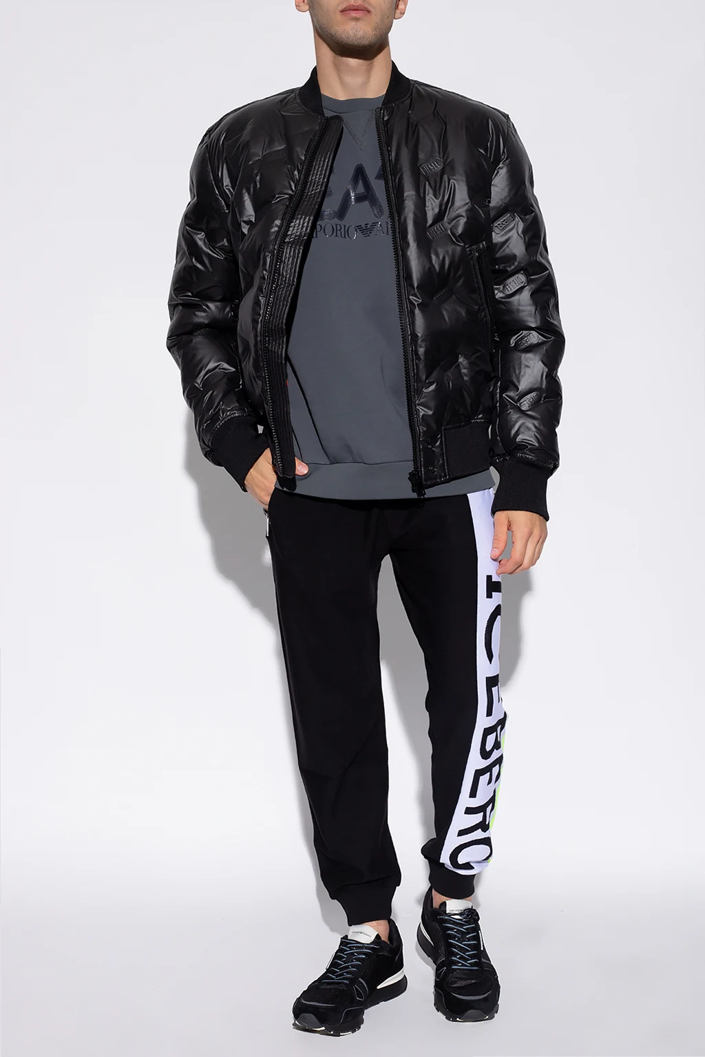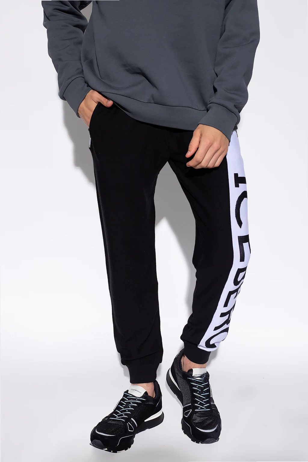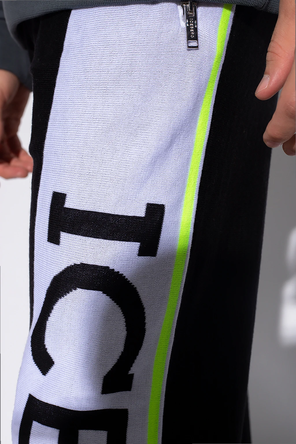 Black and white sweatpants from Iceberg. Crafted from wool, this pair features a drawstring waist, logo embroidery, neon yellow stripe, two zip pockets and ribbed trims.