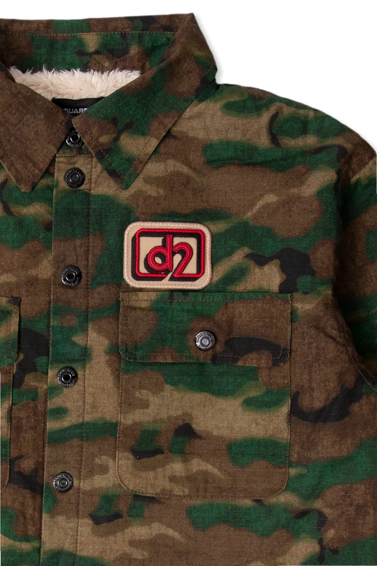 Green, beige and brown jacket from Dsquared2 Kids. Made of cotton, this garment features snap buttons, a camo pattern, multicolored logo patch, two buttoned flap pockets, long sleeves with snap-fastened cuffs as well as faux fur lining in cream.