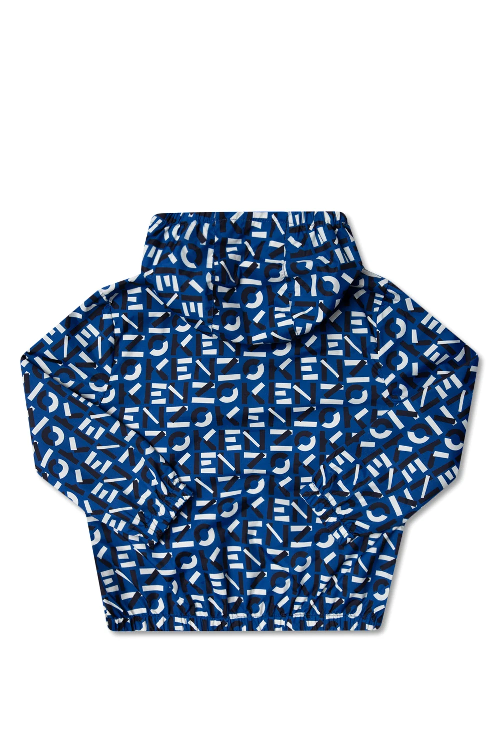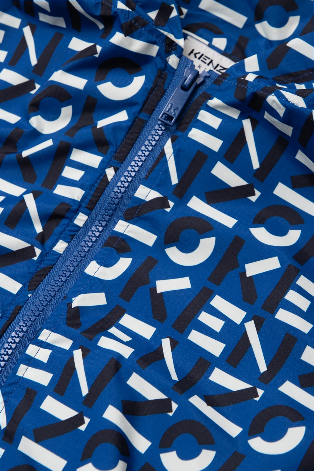 Navy blue, white and black rain jacket with a hood from Kenzo Kids. Embellished with a logo graphic pattern, this style features a zip fastening, two side zipped pockets and an elasticated bottom hem and cuffs.