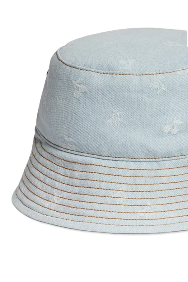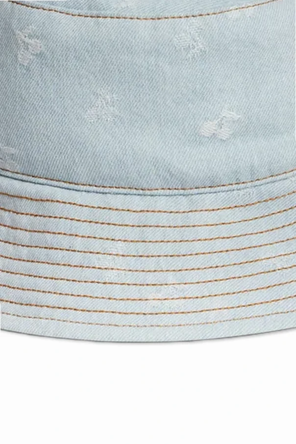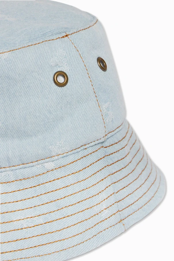 The Theana bucket hat by Bonpoint encapsulates timeless sophistication blended with a playful, youthful spirit. Rendered in a soft light blue denim -inspired cotton, it elevates casual style with a modern touch. The subtle distressed pattern and exquisite decorative stitching in contrasting gold or brown hues reflect true artisanal attention to detail.