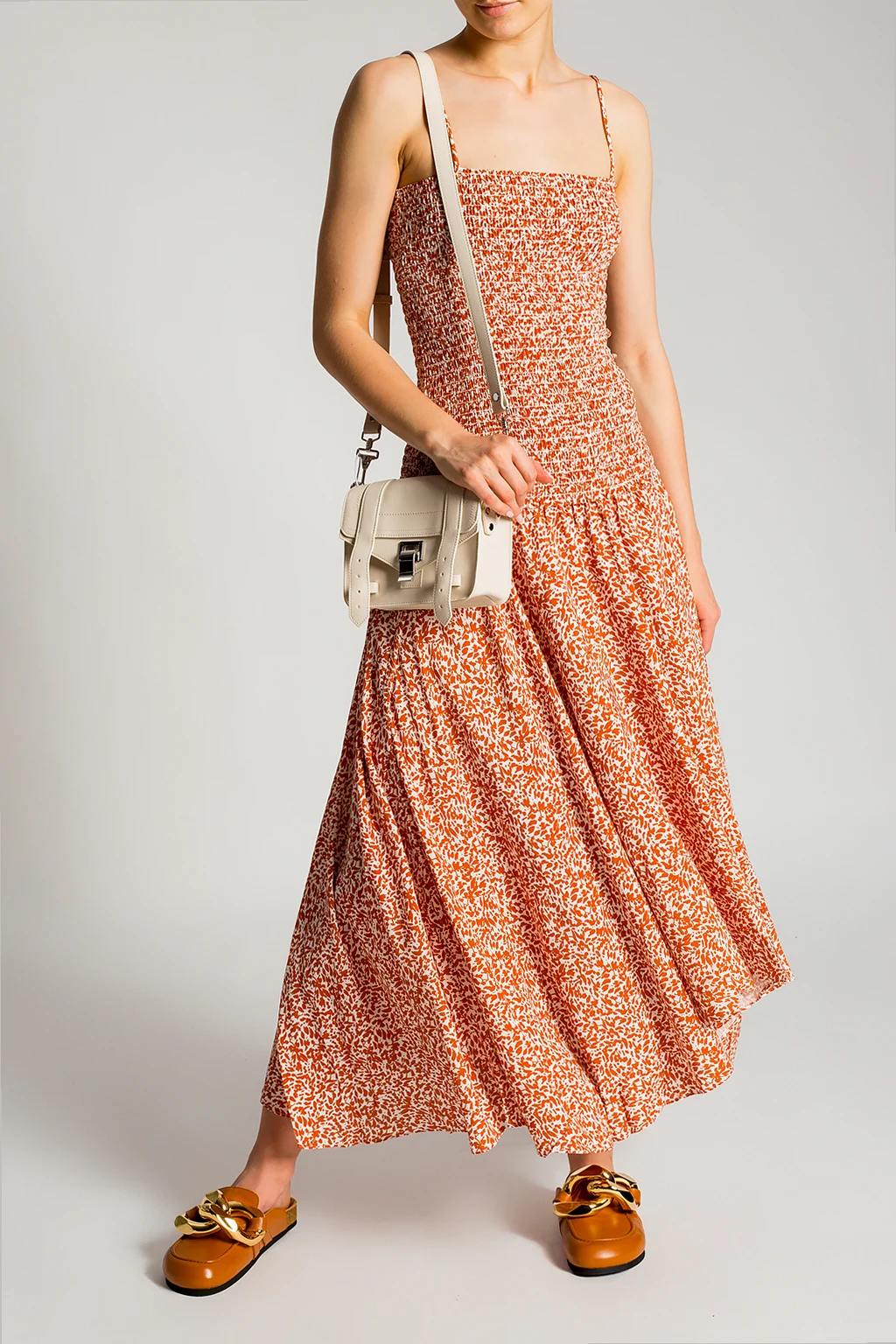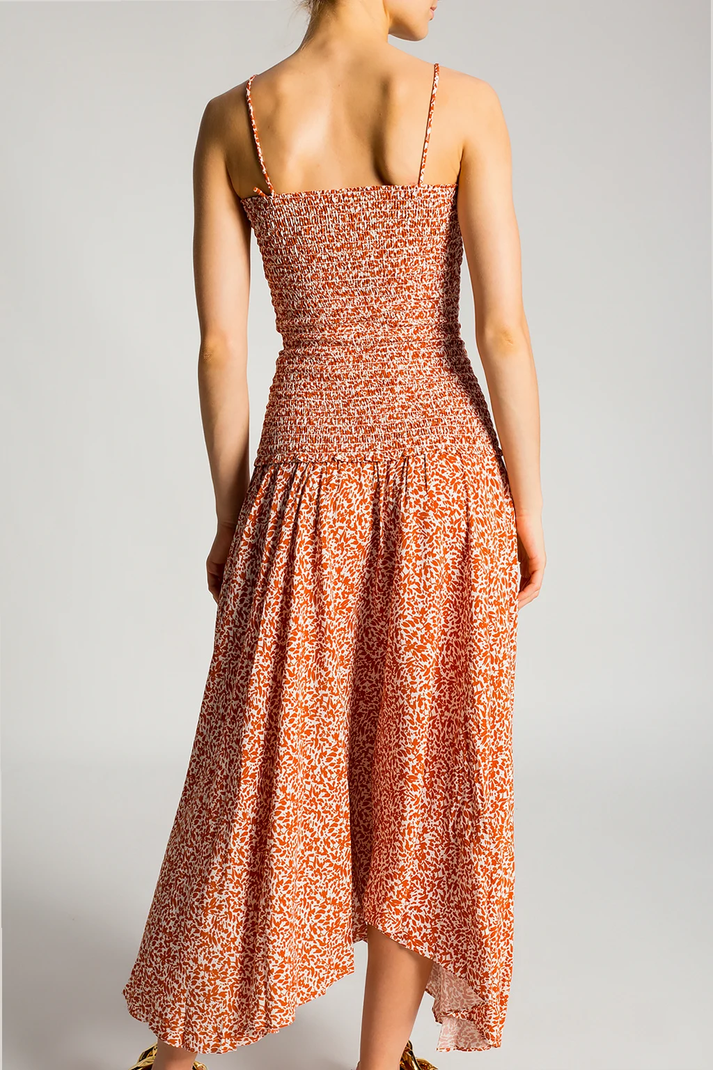 White and orange slip dress from Proenza Schouler White Label. Cut with an asymmetrical hemline, this style features smocked detailing at the waist.