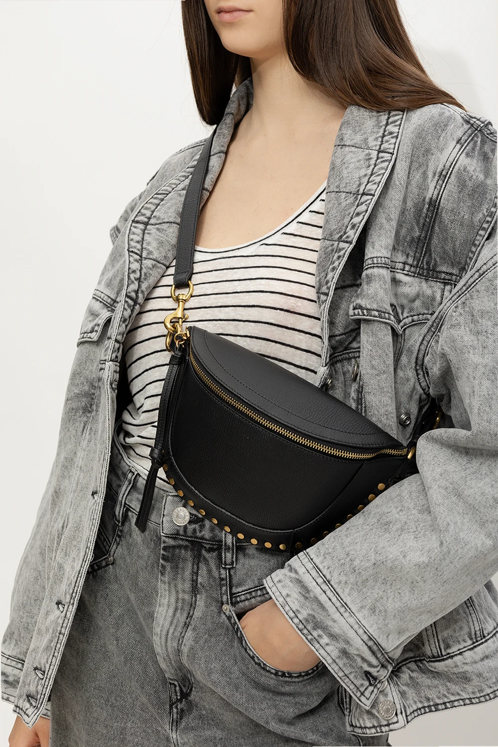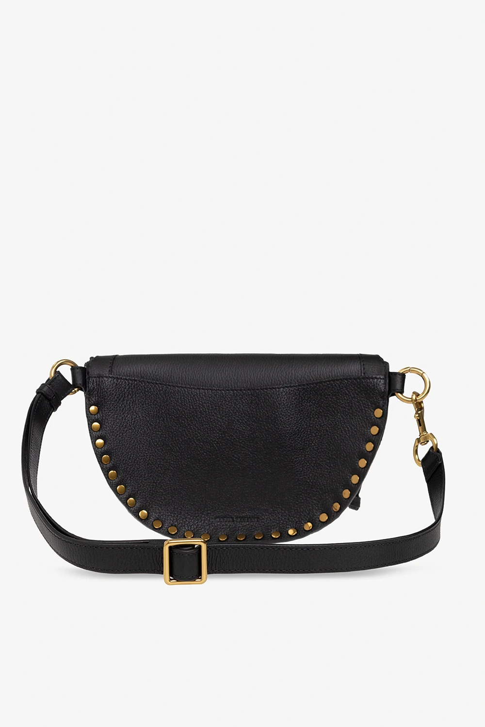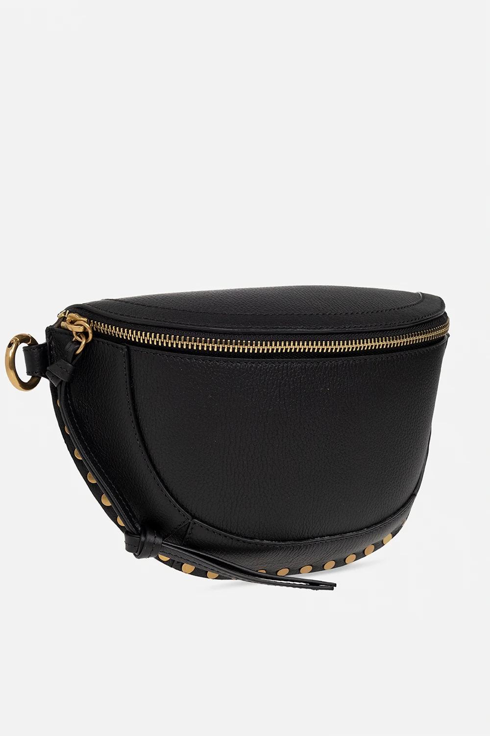 Black ‘Skano’ belt bag from Isabel Marant. Made of bovine leather, this model features a zip fastening with decorative tassels, metal studs, back pocket, embossed logo, detachable and adjustable shoulder strap, antique gold-tone metal hardware and one internal compartment with one card slot.