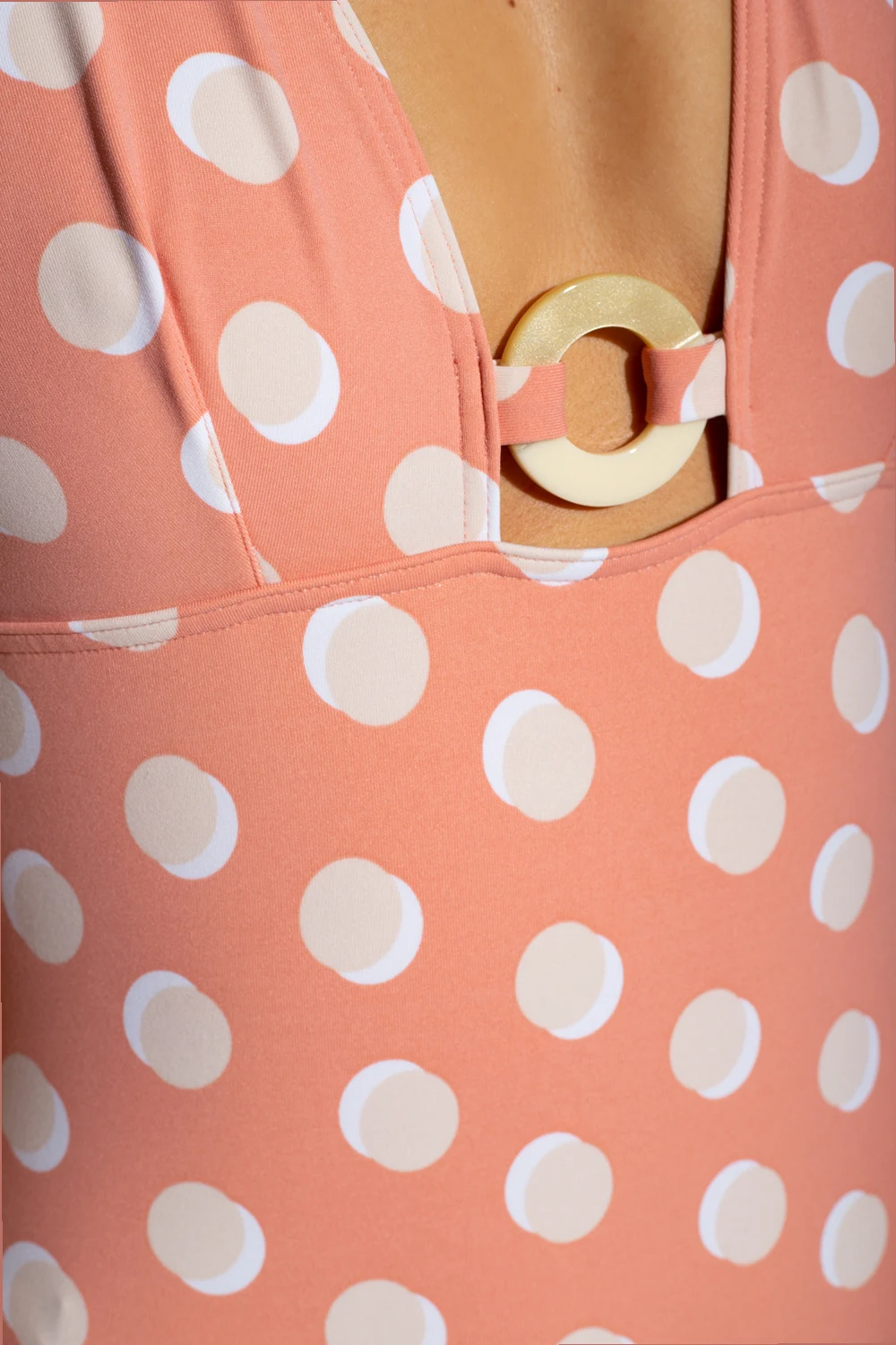 Pink ‘Sommeil Lune’ one-piece swimsuit from Eres. Embellished with a cream and white pattern with dots, this style features full cups, a distinctive ring embellishment on the front and slender straps to tie around the neck.