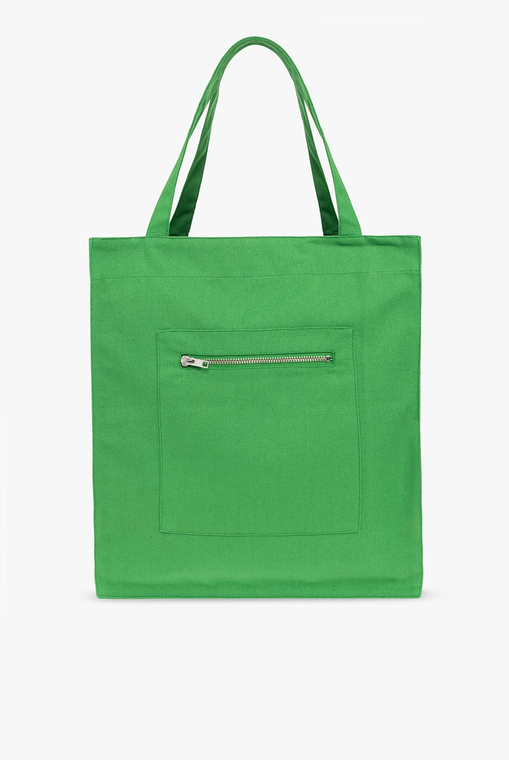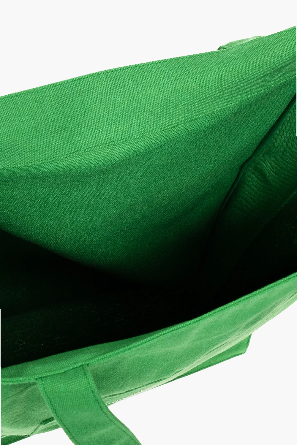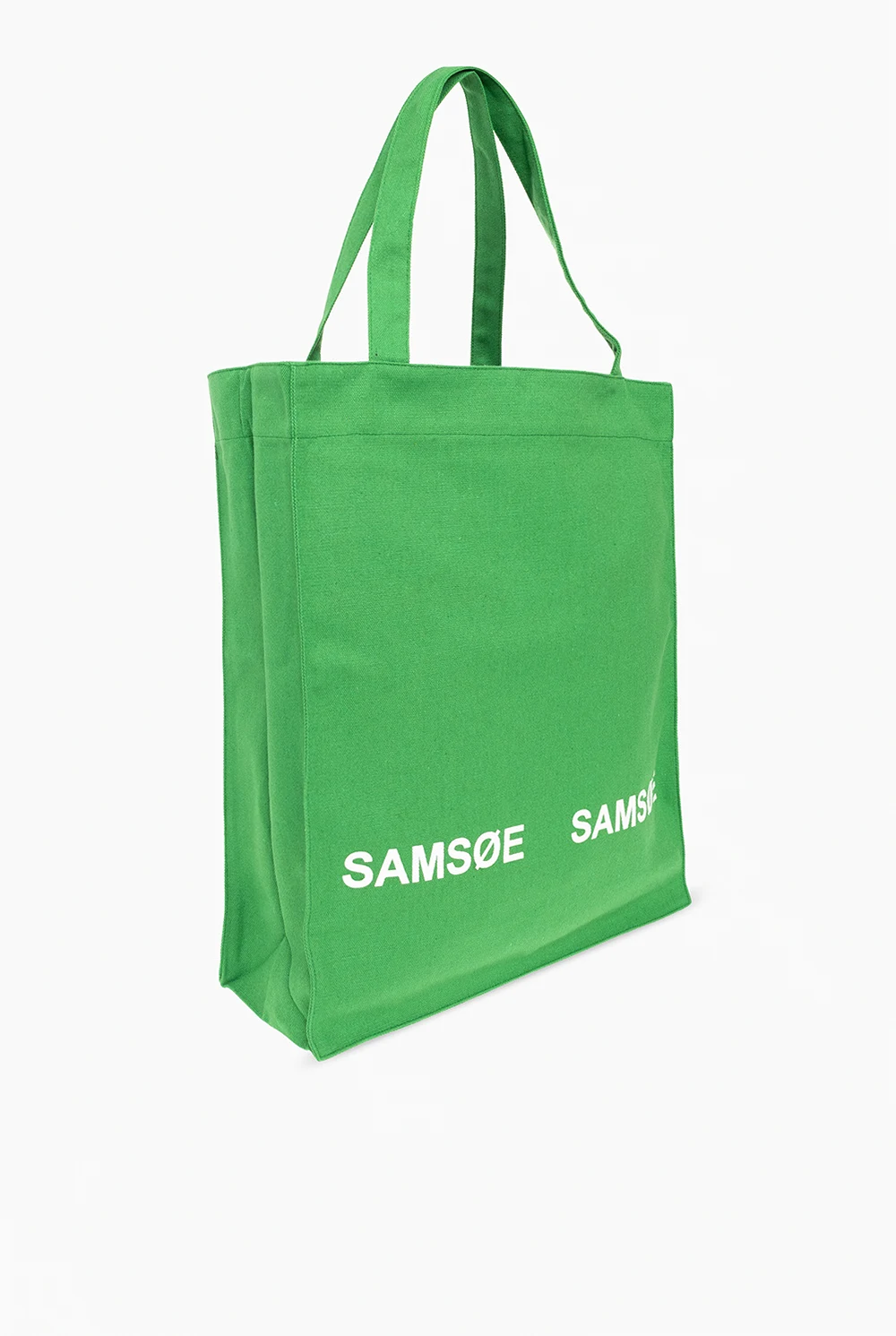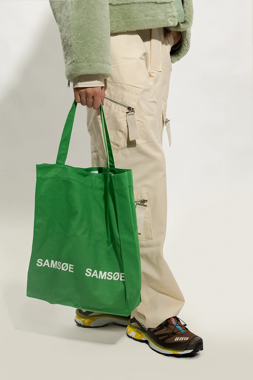 Green shopper bag from Samsoe Samsoe. Crafted from recycled cotton, this model features a white logo print, zipped back pocket, two half-round handles, one internal compartment and silver-tone metal hardware.