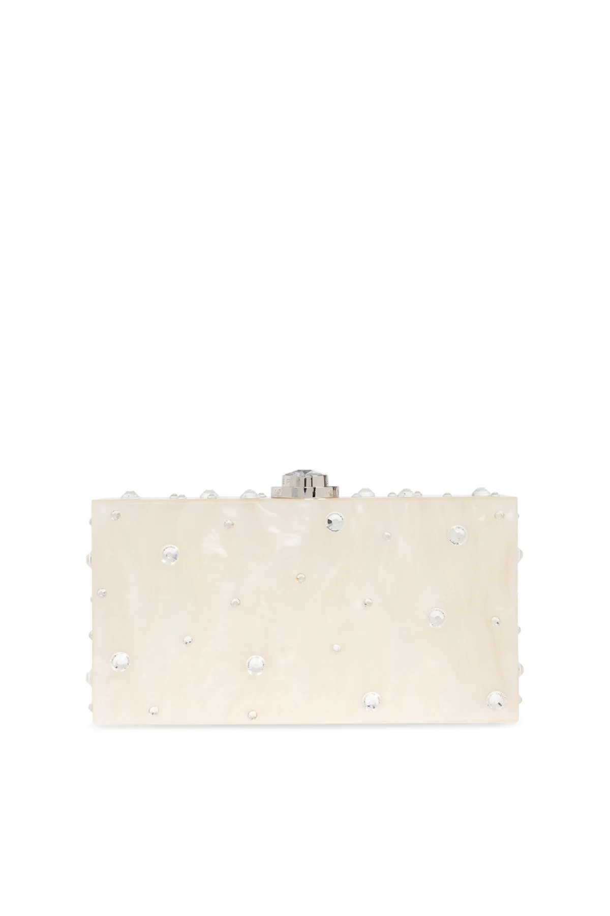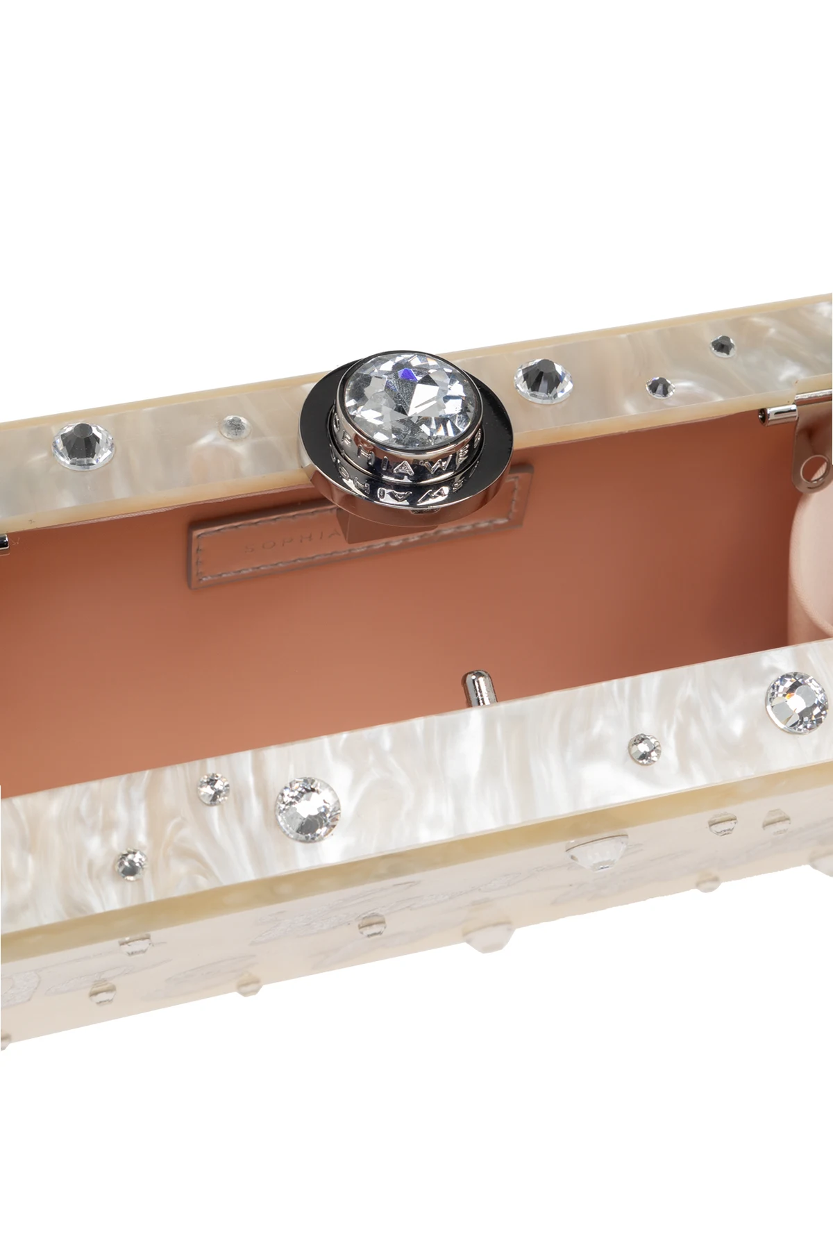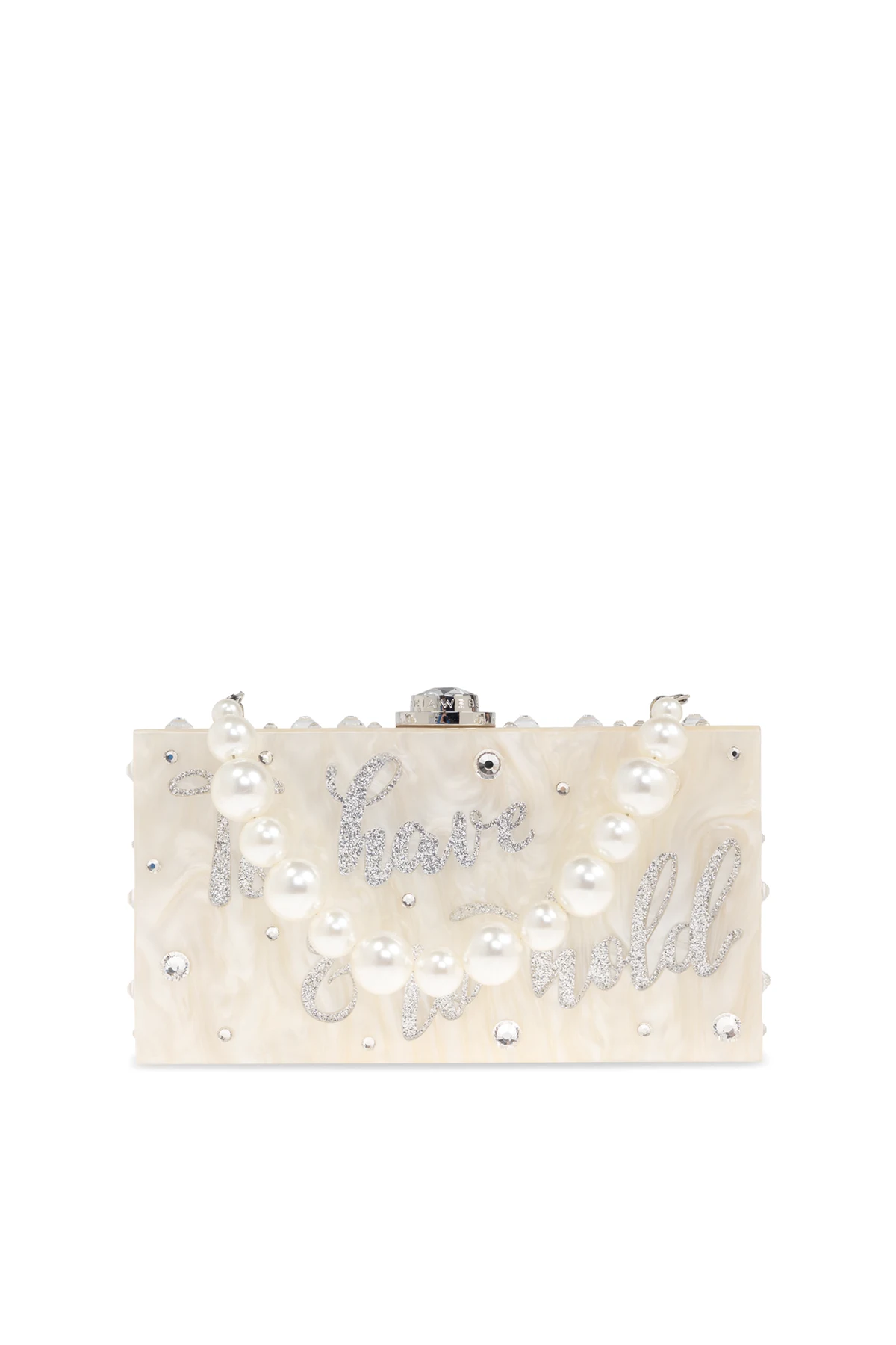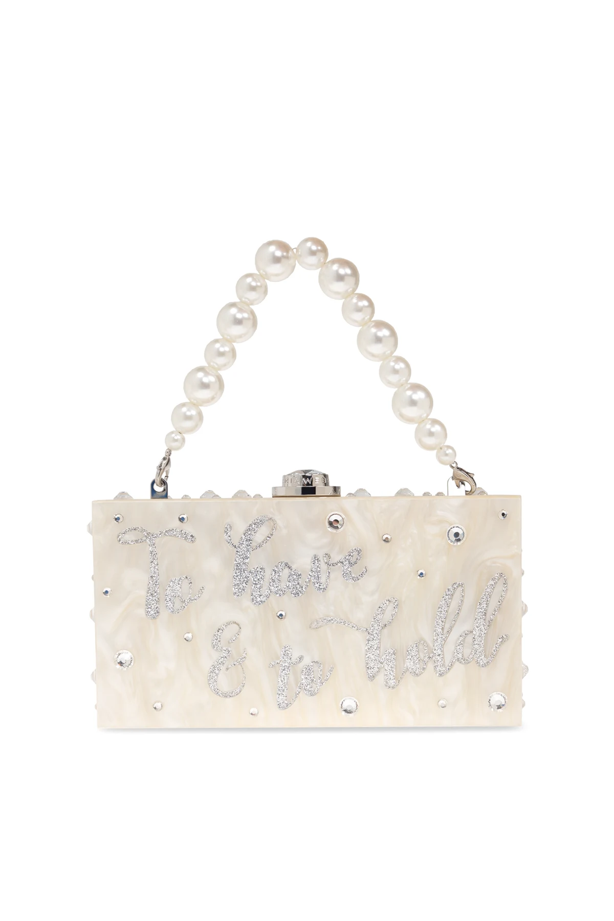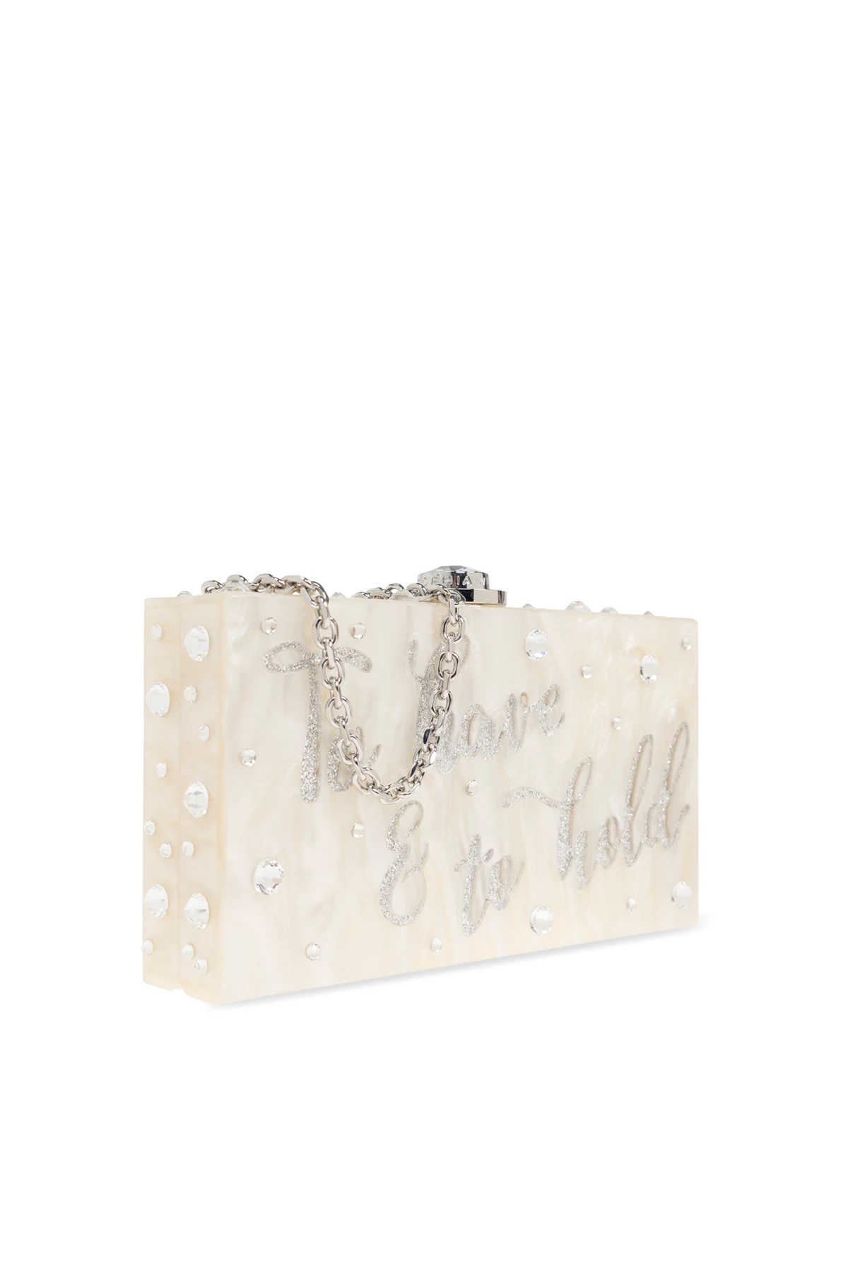 Introducing the Cleo clutch, a masterpiece of design by the renowned Sophia Webster. This elegant accessory, crafted from a rigid material that mimics the opulence of mother-of-pearl, boasts a refined rectangular silhouette in a dominant cream hue. The clutch is artfully adorned with the phrase \"To have & to hold\", emblazoned in shimmering accents, and embellished with transparent crystals that catch the light with every movement. Its handle, an exquisite chain interspersed with large pearls, adds a touch of sophistication to your ensemble. Equipped with a metallic clasp featuring a prominent, sparkling element, it ensures both security and style. The interior, lined in a soft shade of light brown, offers a singular compartment, perfectly sized for your essentials. Why Choose This Product? Exquisite design by Sophia Webster Luxurious mother-of-pearl appearance Elegant pearl chain handle Perfect for special occasions Secure metallic clasp