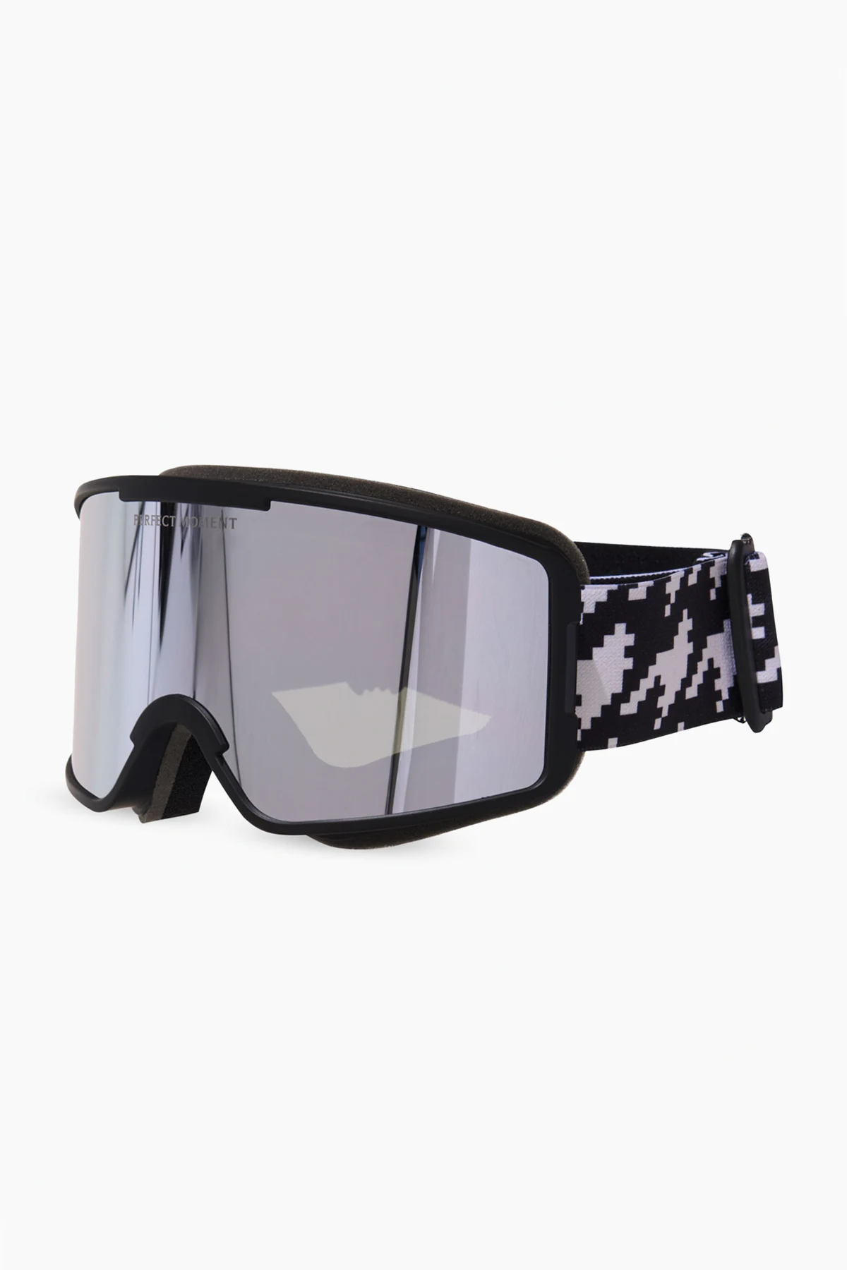 Introducing the Perfect Moment Ski Goggles, a paragon of modern elegance and functionality. Crafted with a contemporary rectangular shape, these goggles offer a wide field of vision, ensuring you never miss a moment on the slopes. The strap is adorned with a chic black-and-white geometric pattern reminiscent of pixels, adding a touch of avant-garde flair. The lenses are gently tinted and feature an anti-reflective coating, typical of ski eyewear, enhancing your visual clarity. Proudly emblazoned on the upper part of the goggles is the \"PERFECT MOMENT\" logo, a testament to its esteemed origin. Accompanied by a sleek black zippered case, these goggles promise protection and effortless storage. The dominant black color is elegantly contrasted with white elements on the strap, creating a striking visual impact. Tailored for women, these goggles are perfect for those who seek style and performance in equal measure. Why Choose This Product? Exclusive design with a modern rectangular shape Enhanced visual clarity with anti-reflective, mirrored lenses Signature Perfect Moment branding Convenient storage with included zippered case Ideal for active women on the ski slopes