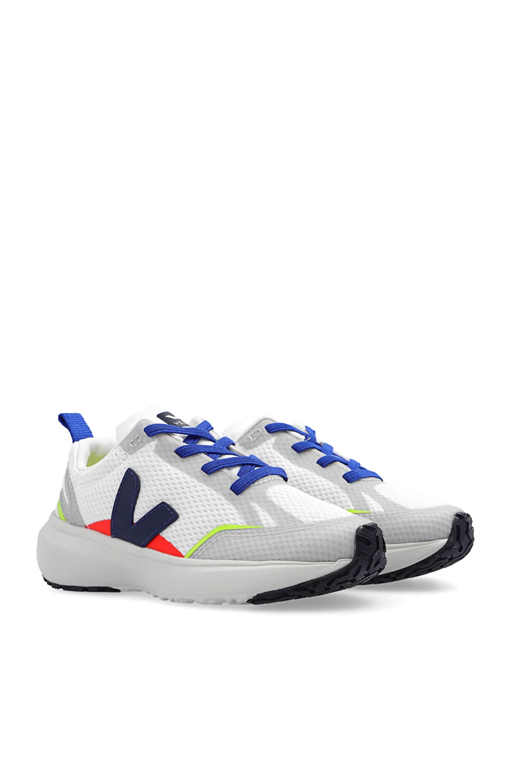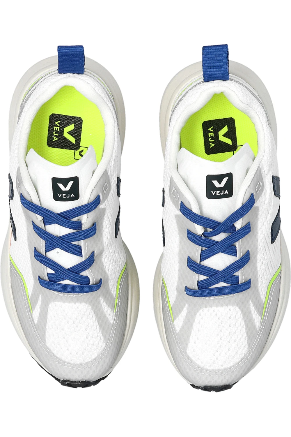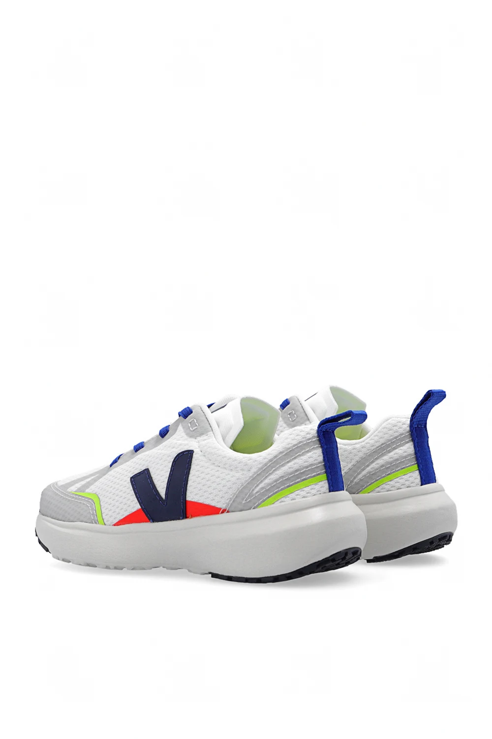 White and grey sneakers from Veja Kids. Resting on a grey and black rubber sole, this lace-up pair features a navy logo patch and decorative inserts in green and red.