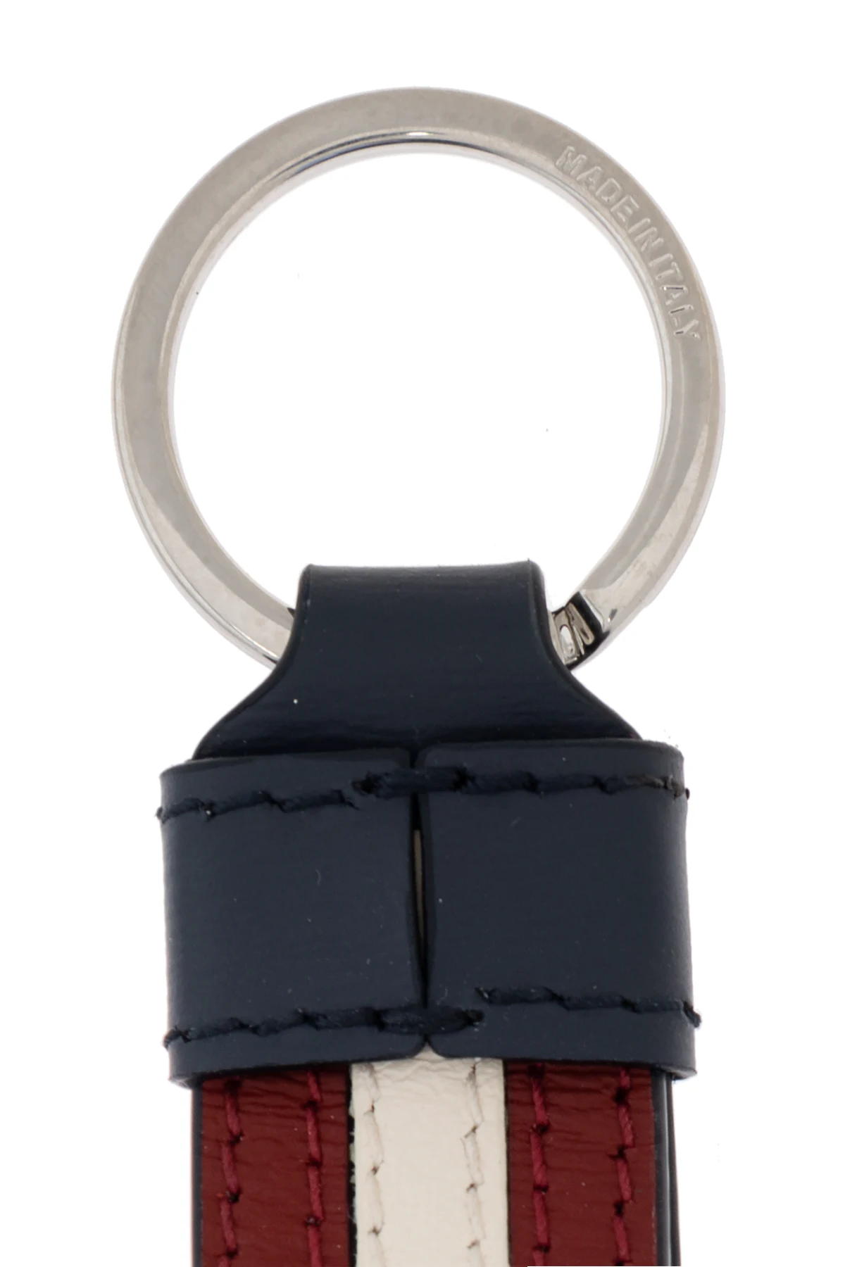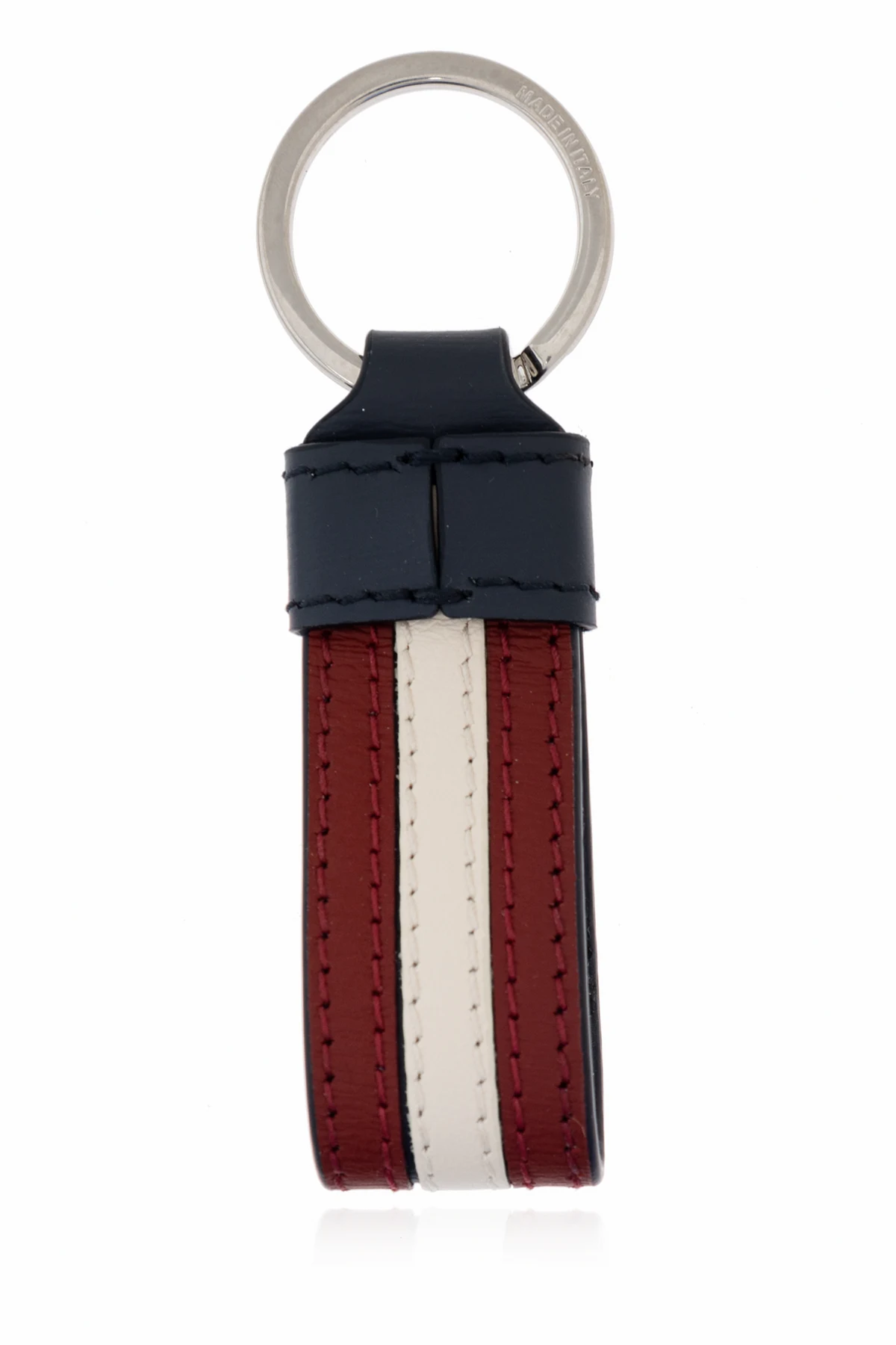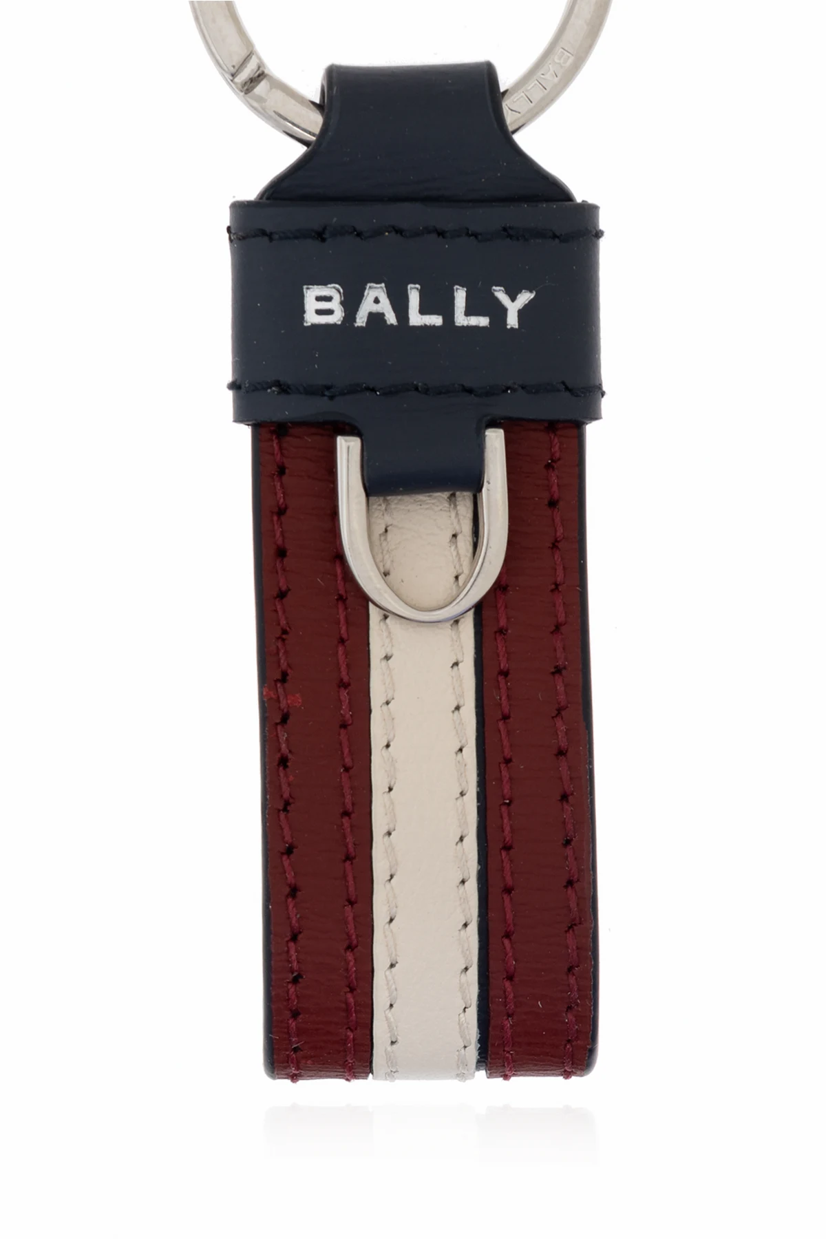 Introducing the Bally Key Fob, a symphony of craftsmanship and design that represents the pinnacle of luxury accessories. This exquisite piece features a strap adorned with three vertical stripes: a central cream band flanked by deep burgundy, accented with contrasting stitches that likely shimmer in white or light hues. The upper segment of the fob, crafted from what appears to be navy leather, boasts visible stitches that add to its premium feel. Proudly embossed on this segment is the name \"BALLY\", signifying its esteemed brand lineage. The key fob is equipped with a sturdy silver metal ring, perfect for attaching keys or other accessories, underscoring its functionality without sacrificing style. Notably, an engraving that reads \"MADE IN ITALY\" attests to its origins, promising craftsmanship of the highest order. Additionally, a metal feature at the bottom likely serves as both a decorative and a secure element, further elevating its design. The dominant navy hue, complemented by the burgundy and cream, encapsulates elegance, making it a statement piece for any ensemble. Why Purchase This Product? Exquisite Craftsmanship: Reflecting Bally\'s commitment to quality, with attention to detail and finishing. Luxurious Materials: Made from premium leather and metal, ensuring durability and a sophisticated aesthetic. Iconic Branding: The raised \"BALLY\" inscription and \"MADE IN ITALY\" engraving serve as hallmarks of luxury and authenticity. Versatile Functionality: Designed not just for style but for practical use, featuring a solid metal ring for holding keys or accessories. Elegant Color Scheme: The navy, burgundy, and cream palette offers a timeless elegance that complements any accessory collection.