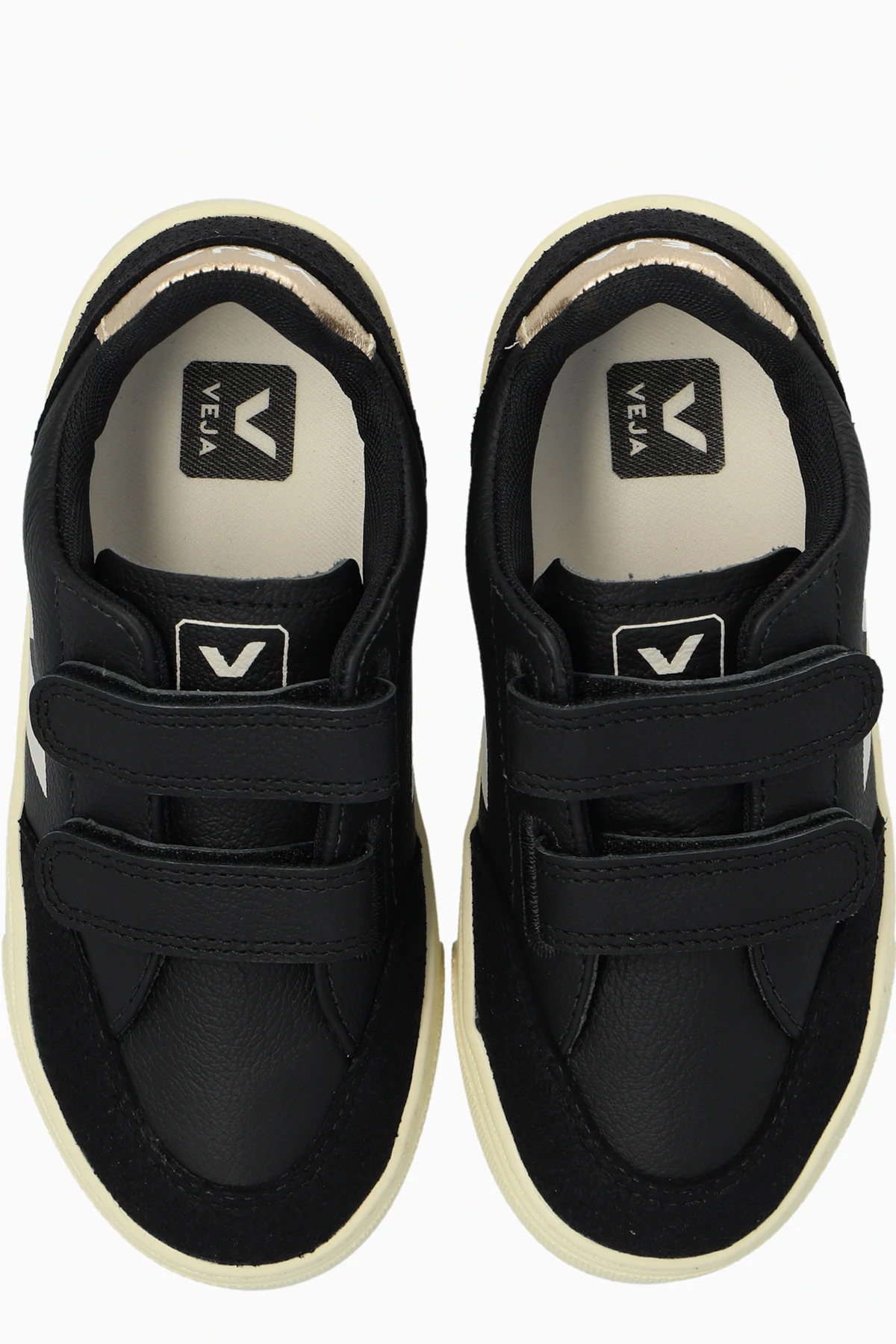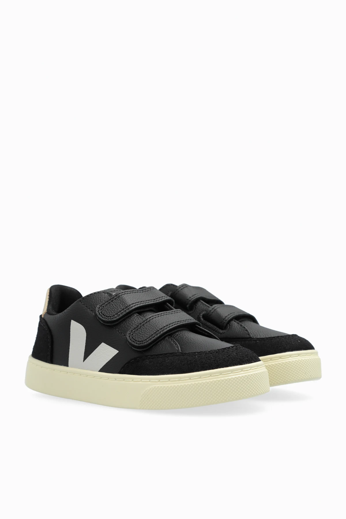 We present children\'s sports shoes from the exclusive Veja collection, model \"V-10\". These exceptional sneakers combine classic design with modern craftsmanship, meeting the demands of even the most discerning young fashion enthusiasts. Material: The shoes are made of black suede and smooth leather, giving them an elegant and sporty appearance. The interior of the shoes is lined with material that ensures wearing comfort. Closure: Two Velcro straps make it easy to put on and take off the shoes, which is especially important for children. A large white \"V\" logo is featured on the sides of the shoes, and the word \"VEJA\" is printed in white on the heel tab. Sole: The stylish sole made of cream-colored rubber not only adds an exceptional contrast to the shoes but also provides excellent grip on various surfaces. Why should you buy this product? Elegant look thanks to the combination of suede and smooth leather. Ease of use thanks to Velcro straps. Unique logo and details distinguishing the Veja brand. Stylish contrasting sole design. High quality craftsmanship from eco-friendly materials.