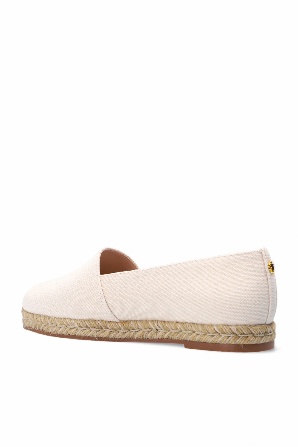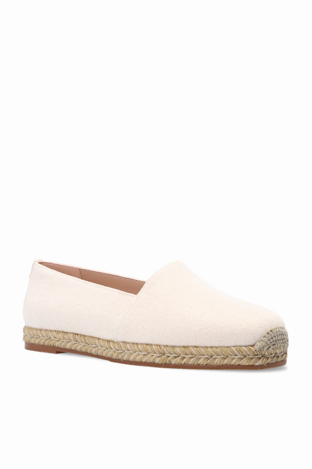 Beige ‘Dree’ espadrilles from Stuart Weitzman. Enriched by gold-tone metal details, this pair boasts a slip-on silhouette set on a brown rubber sole.