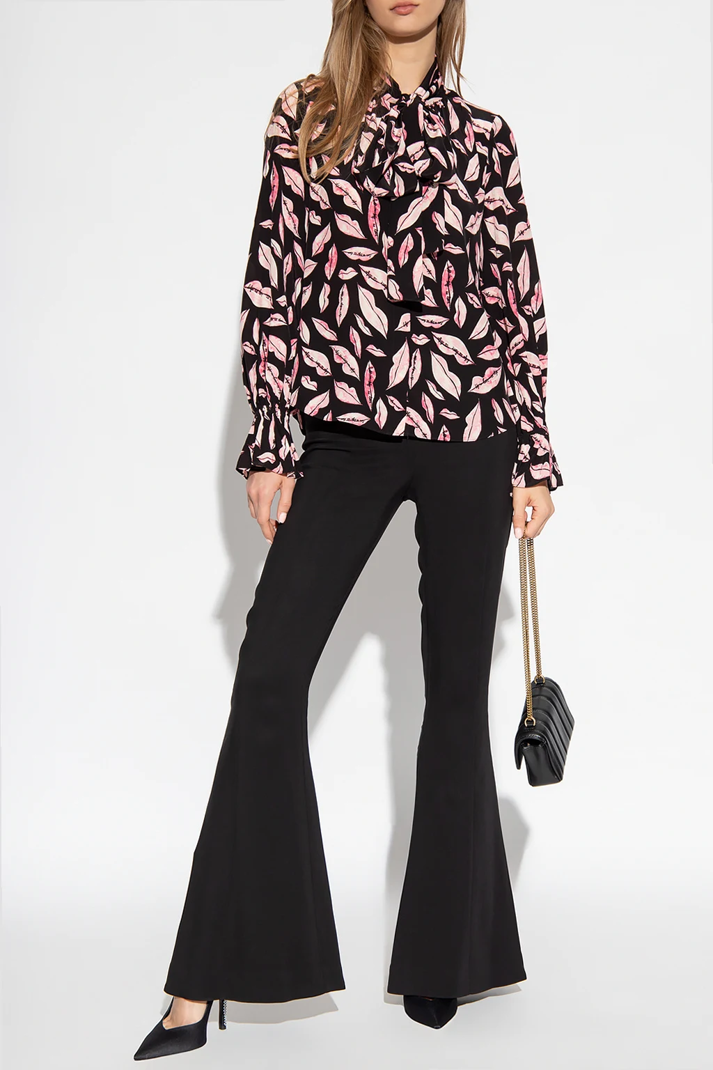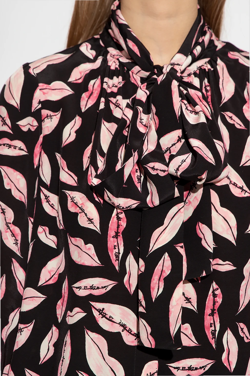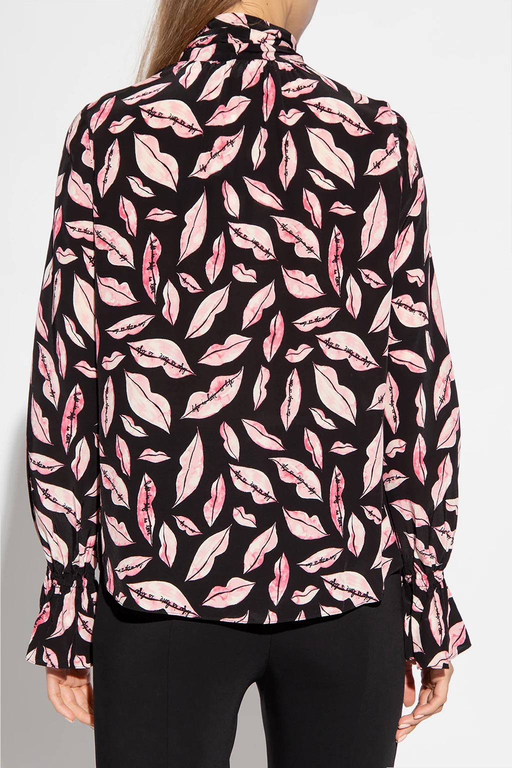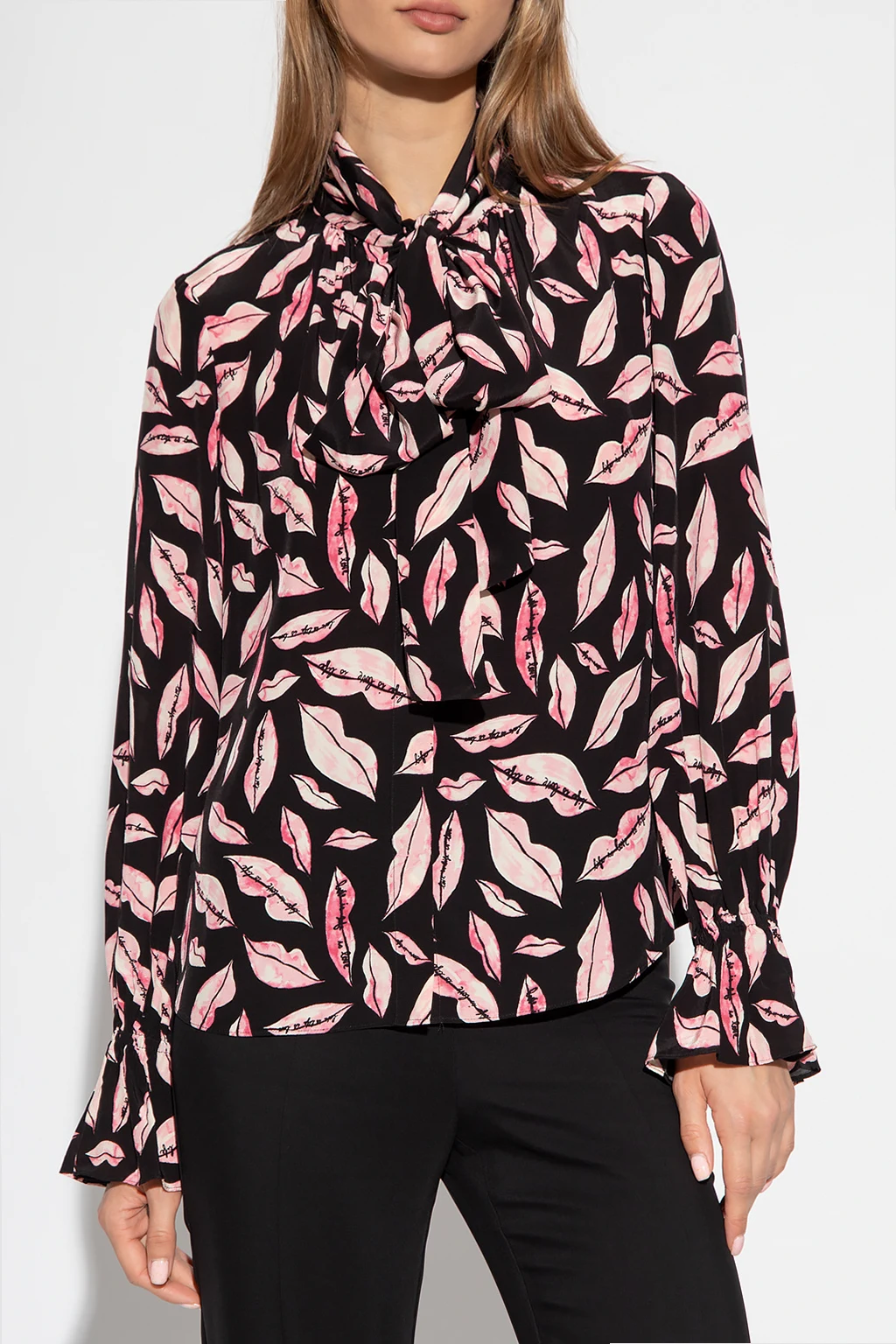 Black and pink ‘Tina’ shirt from Diane Von Furstenberg. Embellished with a lips and logo print, this style features button fastenings, a tie neckline and long blouson sleeves with elasticated cuffs and ruffles.