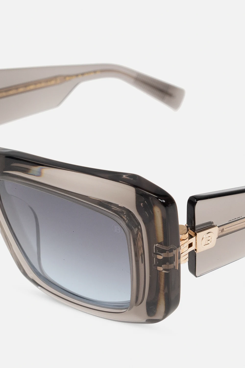 Black, transparent ‘Envie’ sunglasses from Balmain. This pair has rectangular acetate lenses with gold-tone elements and matte finish, wide temples with decorative hinges and black lenses with 100% UV protection. Comes with a case.