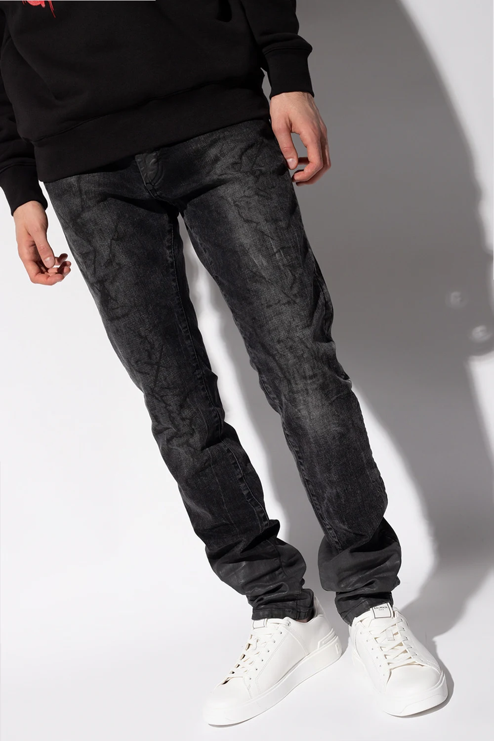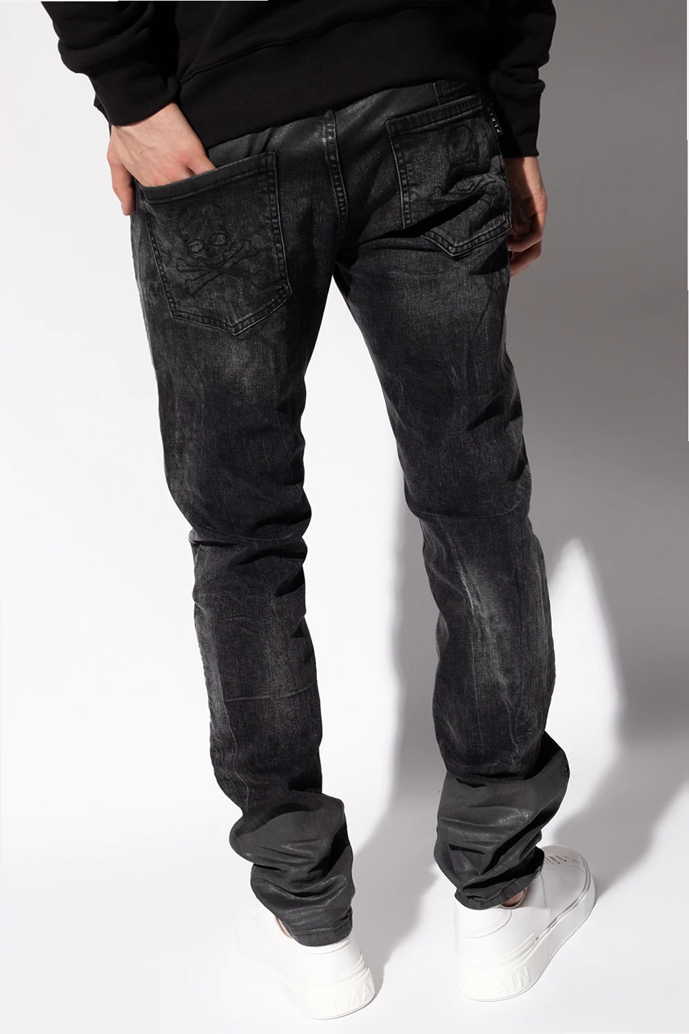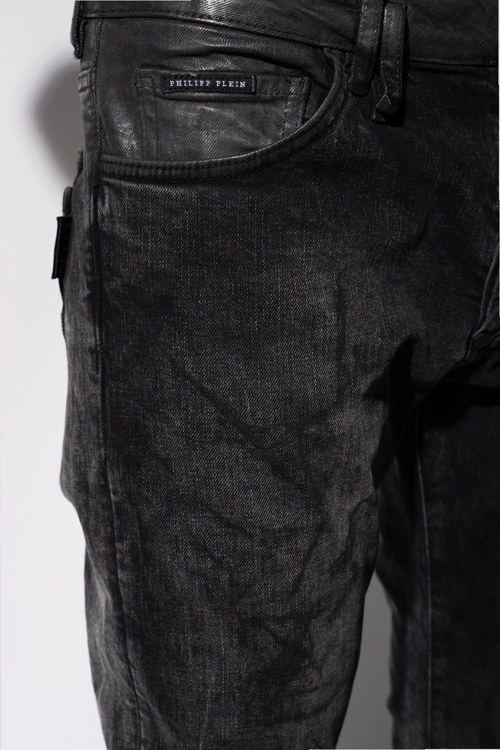 Dark grey jeans from Philipp Plein. Made of cotton, this pair features a waxed effect, button fastening, embroidered pattern, six slip pockets, black logo-embossed patch at the back and tapered legs.