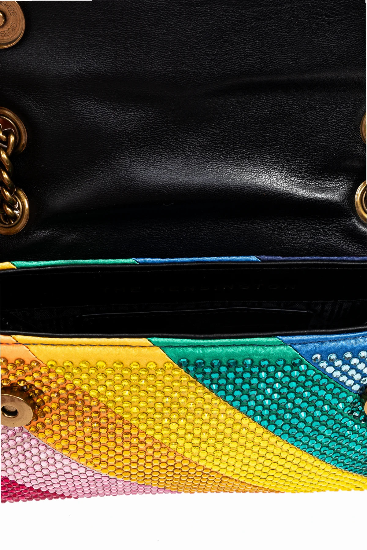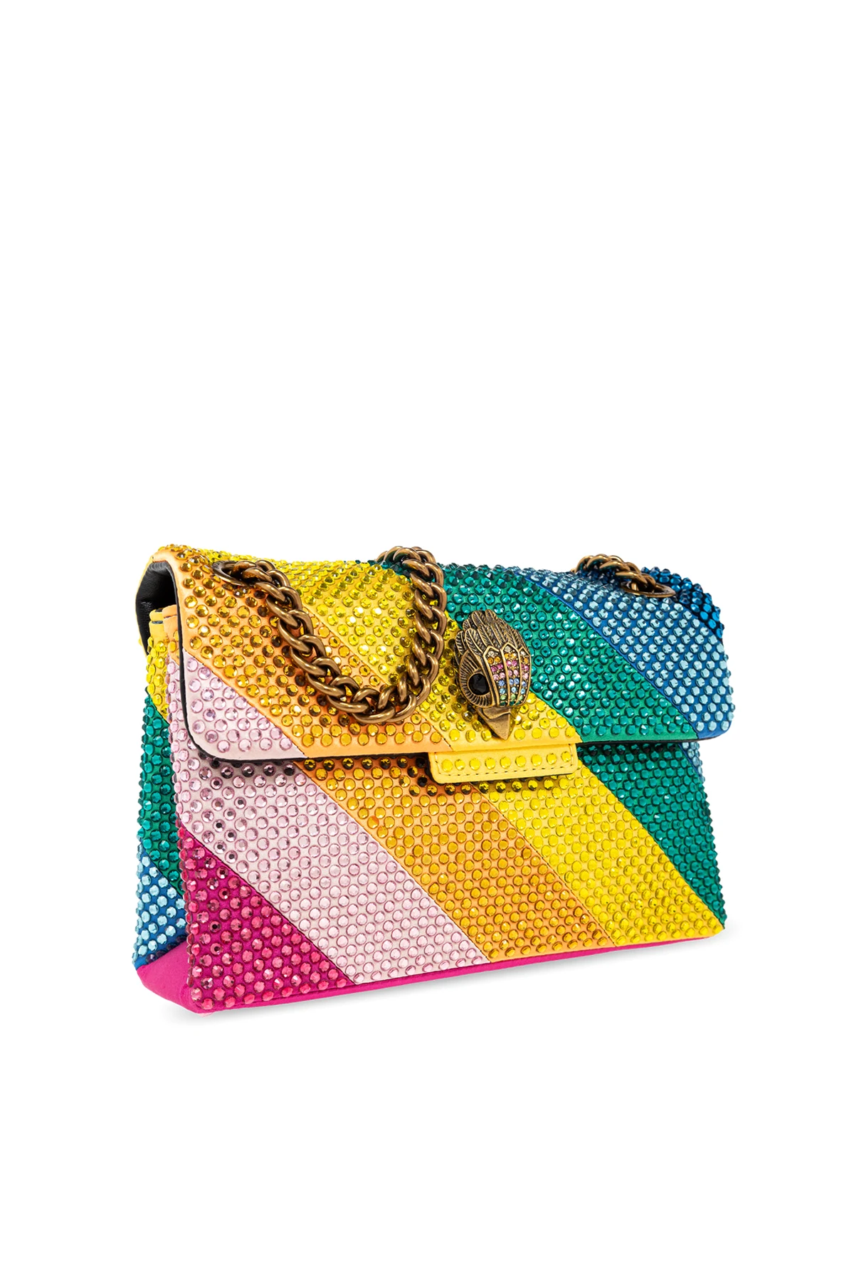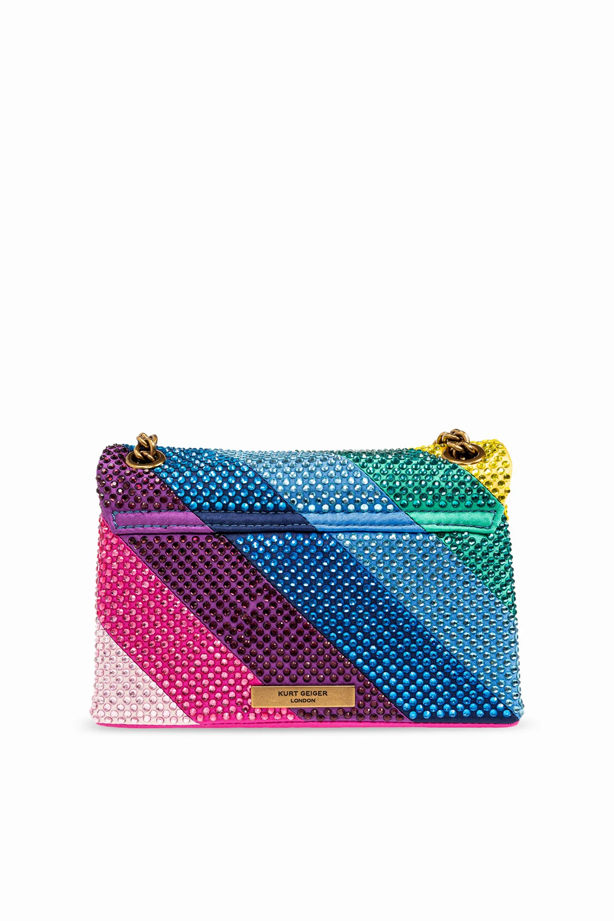 Introducing the Fabric Nini Kensington Shoulder Bag by renowned designer Kurt Geiger. This exquisite piece is a testament to the enchanting allure of vibrant colors and meticulous craftsmanship. The bag\'s surface boasts a kaleidoscopic arrangement of diagonal stripes in a myriad of hues, including striking shades of blue, green, yellow, and pink. Each stripe is embellished with delicate, round protrusions, adding a textured sparkle that captivates and dazzles. The elegance of this accessory is further enhanced by its gold chain shoulder strap, a chic addition that promises both style and comfort. The flap of the bag features a unique shield-shaped clasp, ornately decorated with colorful elements resembling precious stones or crystals, making it a piece of wearable art. Below the clasp, a branded plate confirms the authenticity and prestigious origins of this exquisite item. Designed for the discerning woman, the Fabric Nini Kensington Shoulder Bag is classified as a small-sized accessory, perfect for adding a pop of color and sophistication to any ensemble. The interior reveals a contrast black lining, a magnetic snap closure for security, a main compartment, and a card slot, blending functionality with finesse. Why Purchase This Product? Exclusive Design: Stand out with a piece from the exclusive collection of Kurt Geiger. Vibrant and Unique: The multi-colored, textured surface makes it a central point of any outfit. Elegance Redefined: Gold chain strap and decorative clasp add a touch of luxury. Practical Elegance: Compact size with an interior compartment and card slot for essentials.