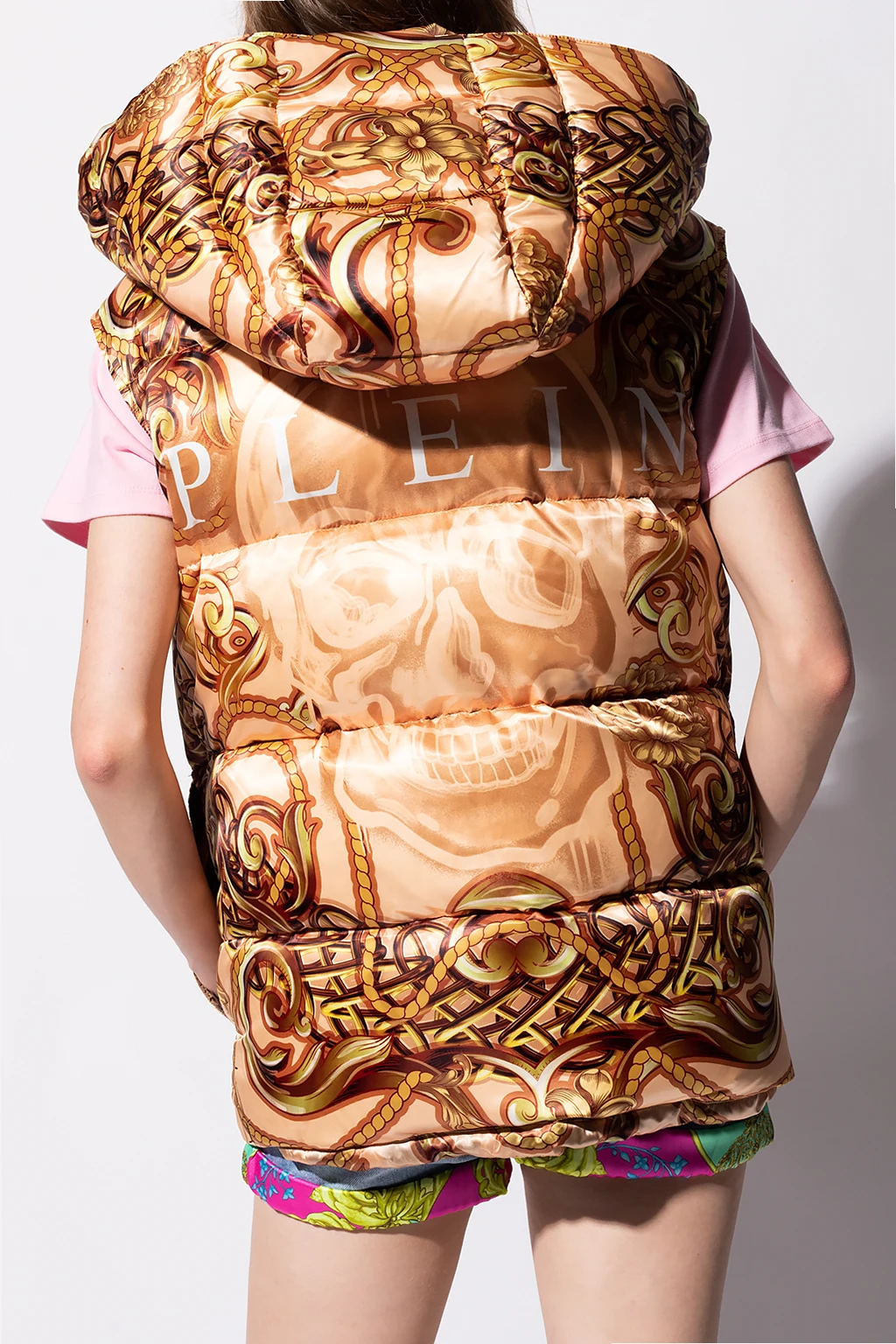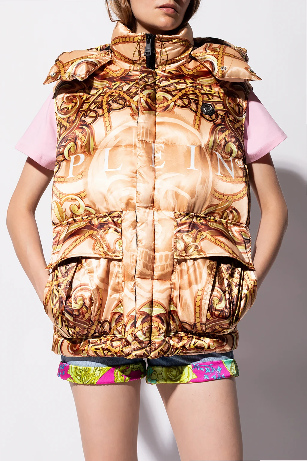 Orange, brown and yellow quilted vest from Philipp Plein. This garment features a white logo pattern, zip and snap fastenings, drawstring hood, two slip pockets and two buttoned flap pockets.