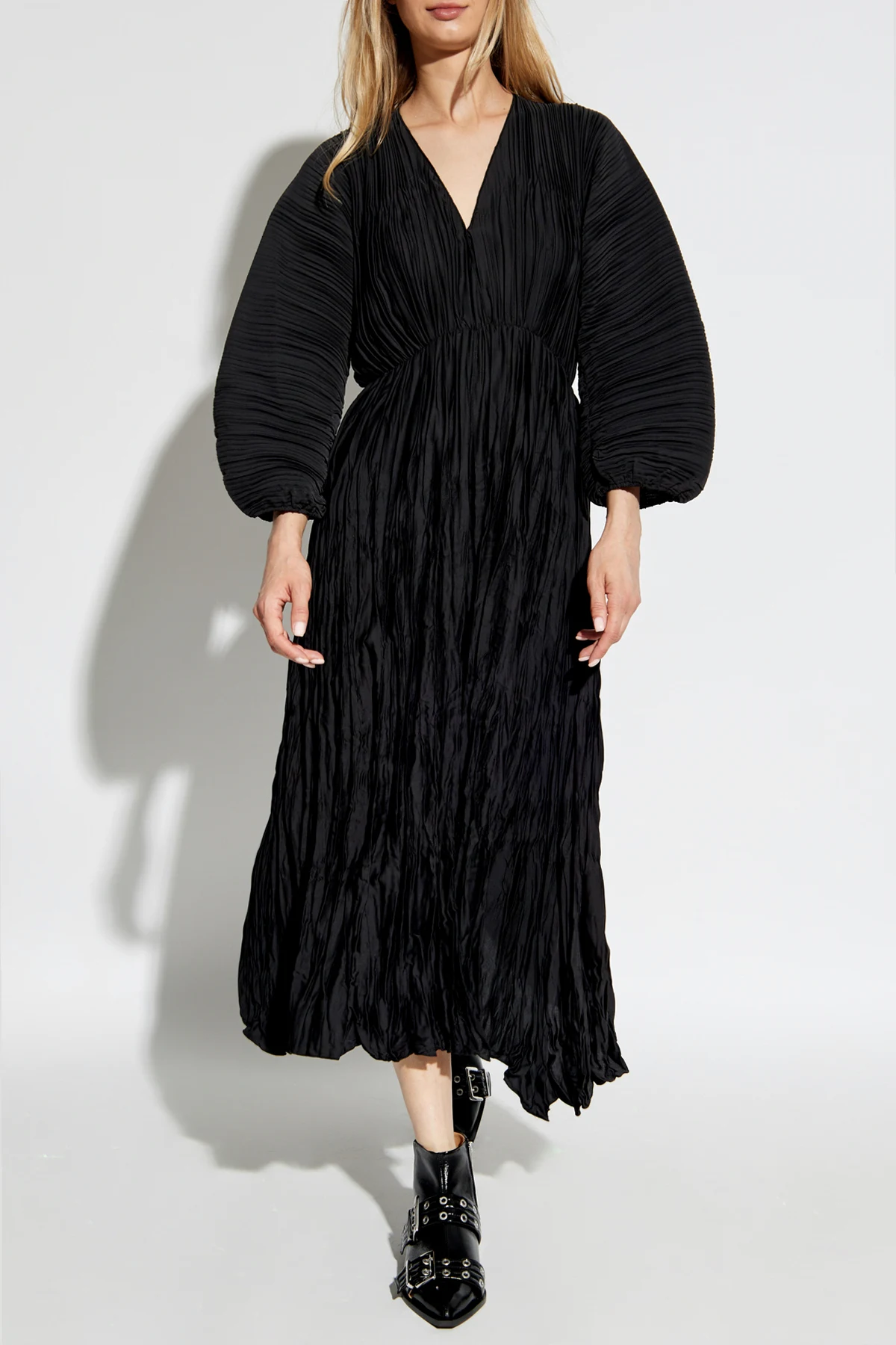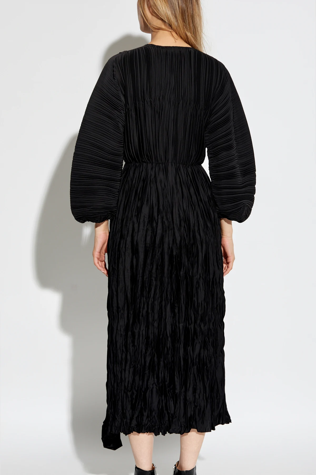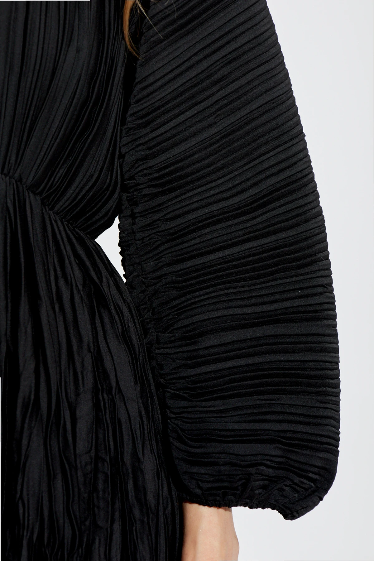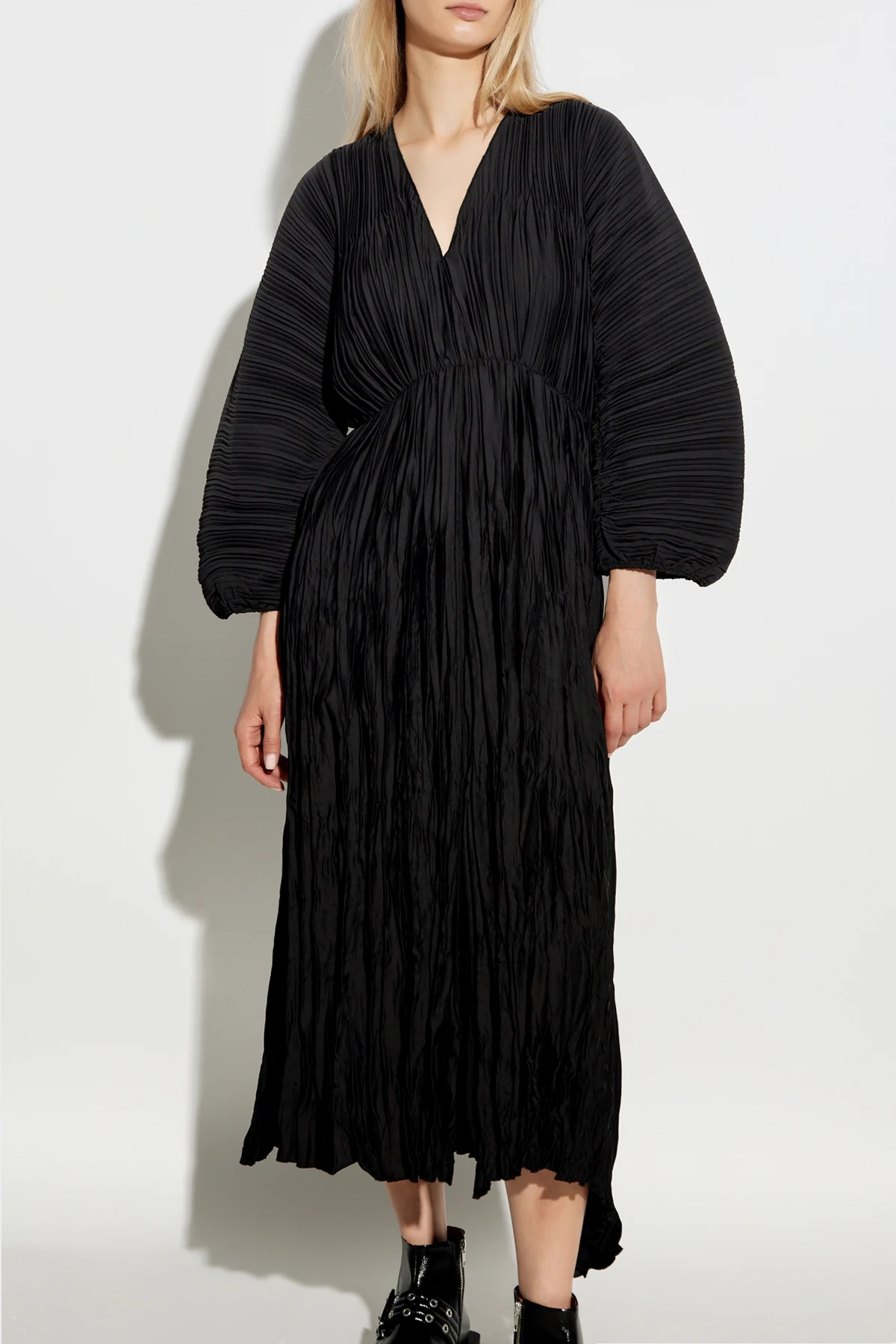Introducing the epitome of sophistication from the exclusive collection by forte_forte - the Black Crinkle-Effect Dress. This masterpiece features a long, flowing silhouette that gracefully extends to the ankles, embodying both elegance and modernity. The dress is crafted from lightweight, synthetic fabric, ensuring it holds its unique crinkle texture impeccably. The deep V-neckline adds a touch of allure, complemented by long, billowing sleeves that taper gracefully at the wrists, maintaining the crinkle effect. Designed with a subtle cinch at the waist, accentuated by an integrated elastic band, this dress beautifully highlights the natural contours of the body. The hemline is straightforward yet finished with the same distinctive crinkling, maintaining a cohesive and refined look. Exclusivity is underscored by the designer\'s logo discreetly placed on the inner label, signaling the garment\'s prestigious origin. The monochromatic black hue enhances its versatility, making it an ideal choice for evening soirees or formal events. Why Choose This Product? Exquisite crinkle texture for a unique appearance. Lightweight synthetic material for all-day comfort. Deep V-neckline and cinched waist for a flattering fit. Elegant and versatile black color. Exclusive designer piece with a prestigious label.