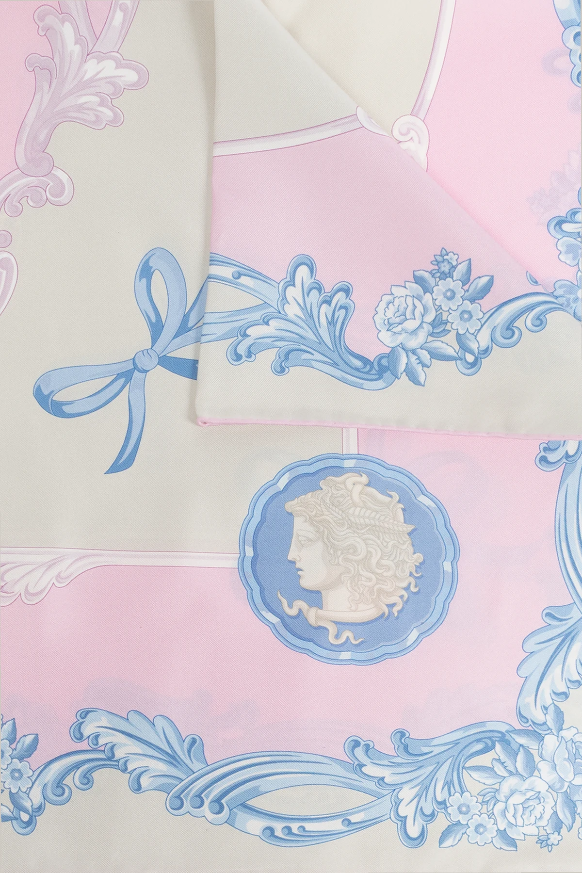 Introducing the Medusa Cameo Silk Scarf from the exclusive Versace collection, a masterpiece of elegance and luxury. This exquisite accessory is crafted from the finest silk, offering a sumptuous texture and a refined aesthetic. The scarf features a distinguished Medusa motif adorned with decorative elements such as bows and floral ornaments. Its color palette is a gentle symphony of pastel pinks and blues, accentuated by creamy undertones. Each intricate print on the fabric is meticulously executed, bestowing the scarf with a unique and captivating character. As a versatile accessory, it can be styled in myriad ways, making it an essential addition to any wardrobe. Why Choose This Product? Exemplary craftsmanship by the iconic Versace brand. Luxurious silk material for a superior feel. Unique design with the iconic Medusa motif. Versatile styling options for any occasion.