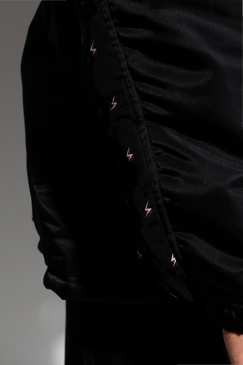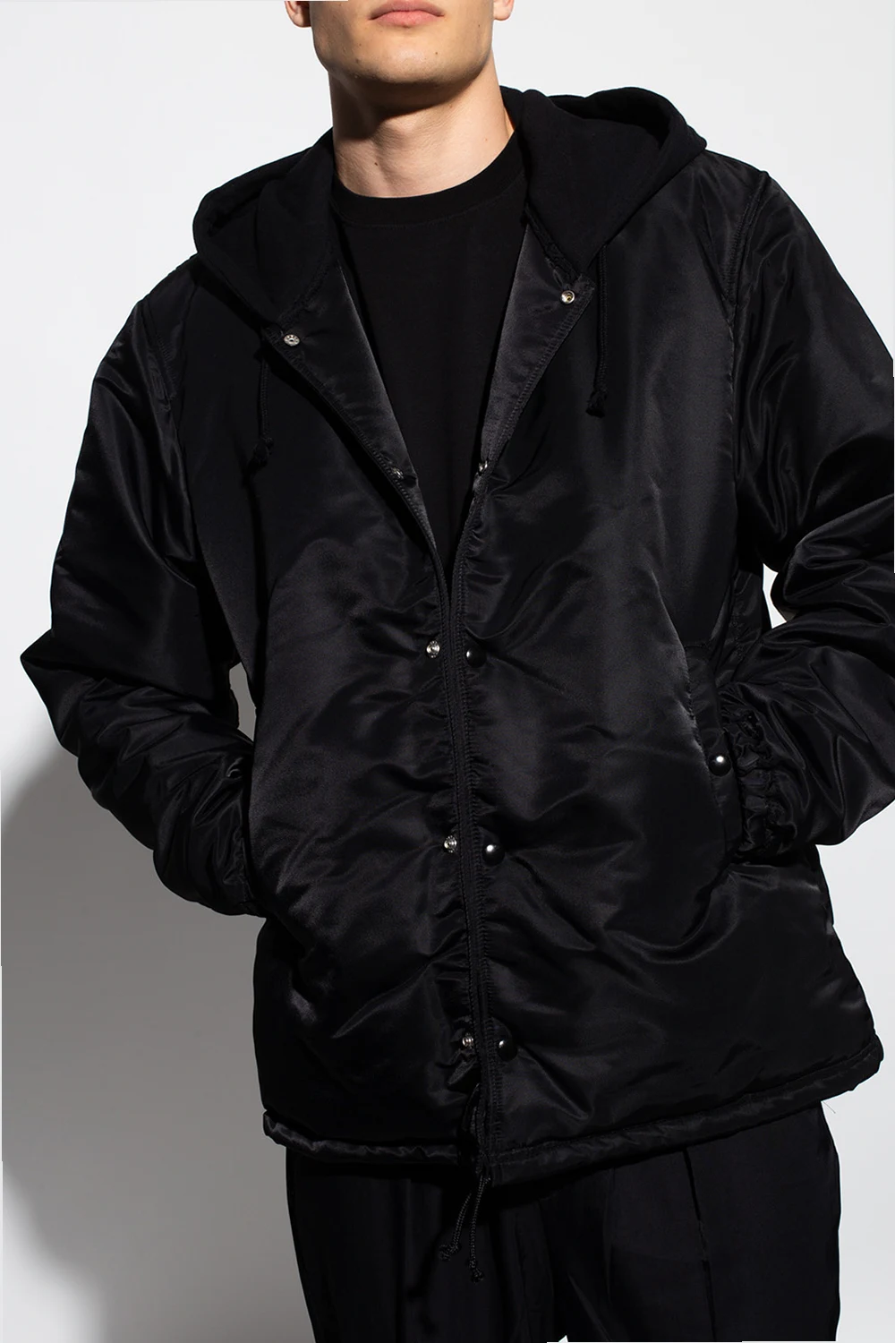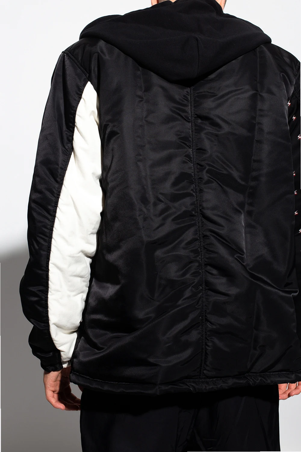 Black jacket from Undercover. Fastened with snaps, this garment features a drawstring hood, one sleeve with a red and white pattern, white insert on the other sleeve, two snap-fastened pockets, ribbed cuffs and a drawstring hem.