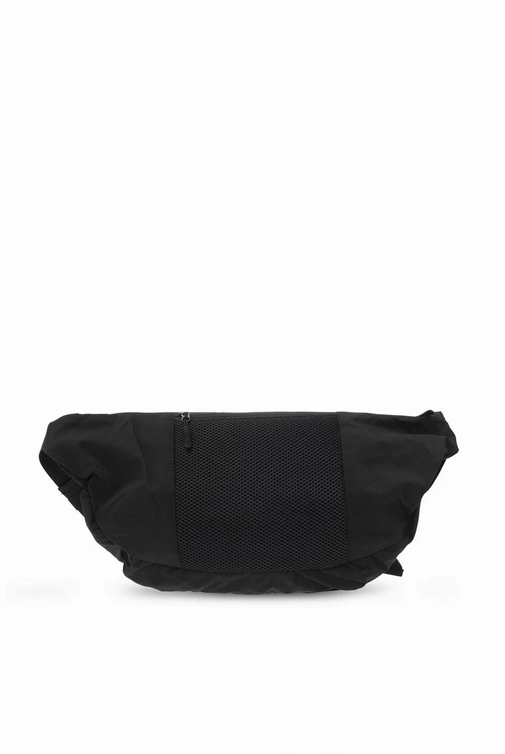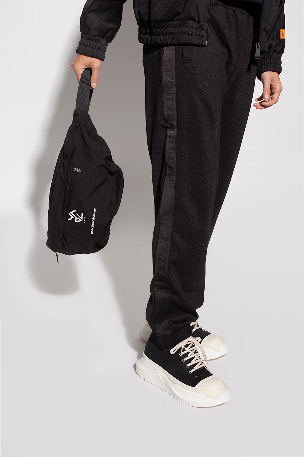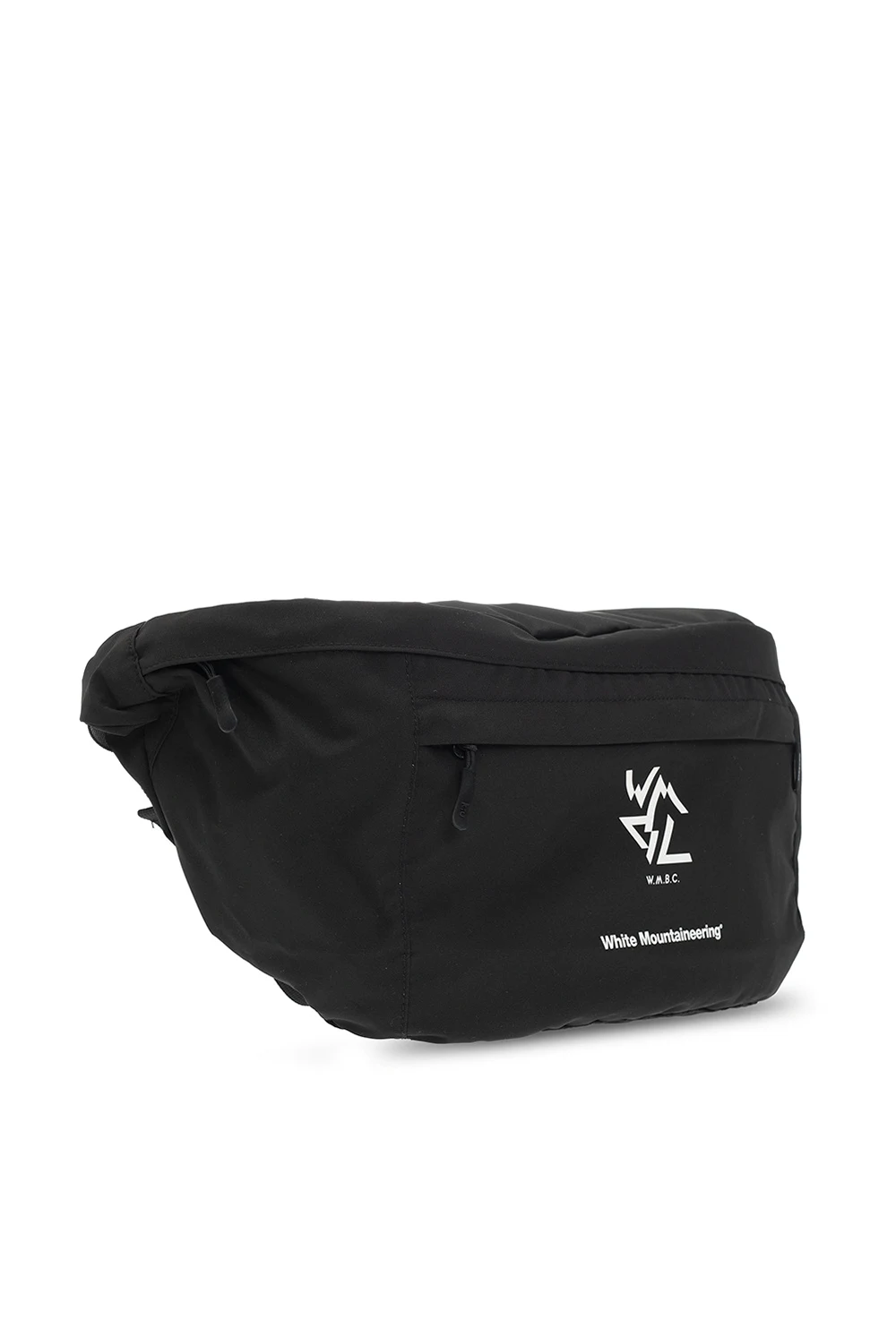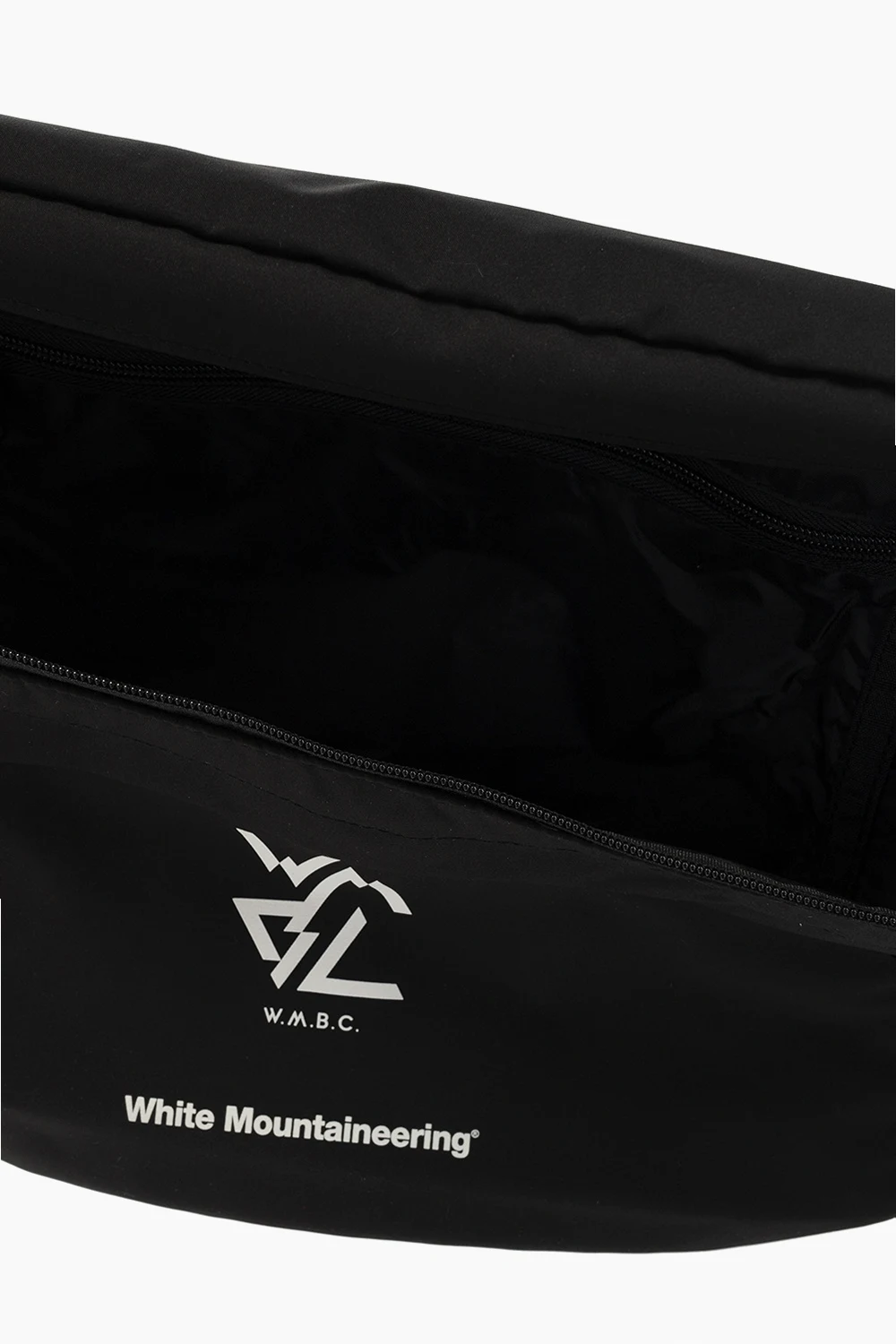Black belt bag from White Mountaineering. Decorated with a white logo pattern, this model fastens with a zip and is complete with an adjustable belt, front and back zip pocket, black metal hardware and one internal compartment and one zip pocket.