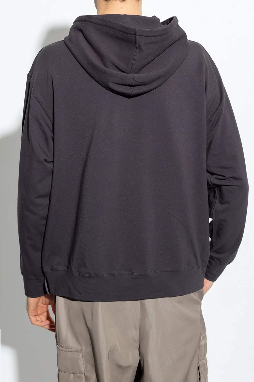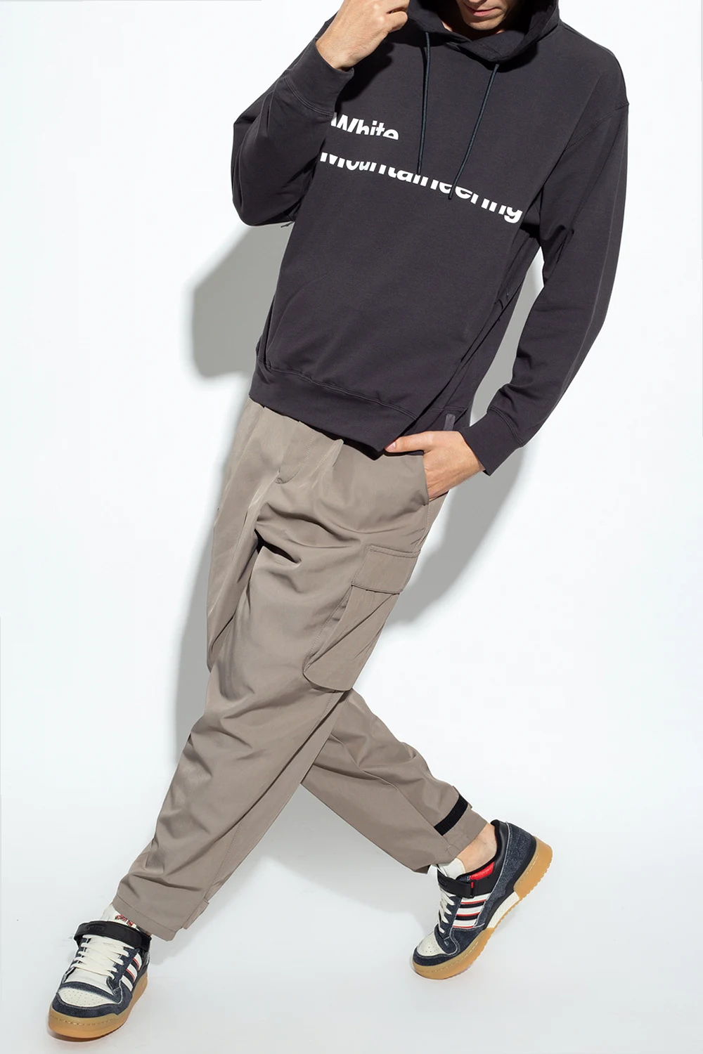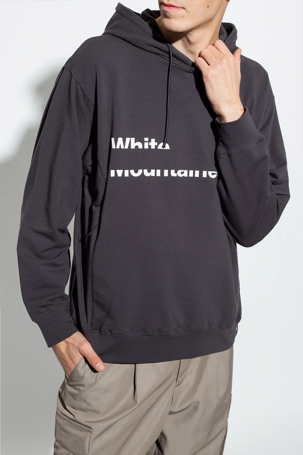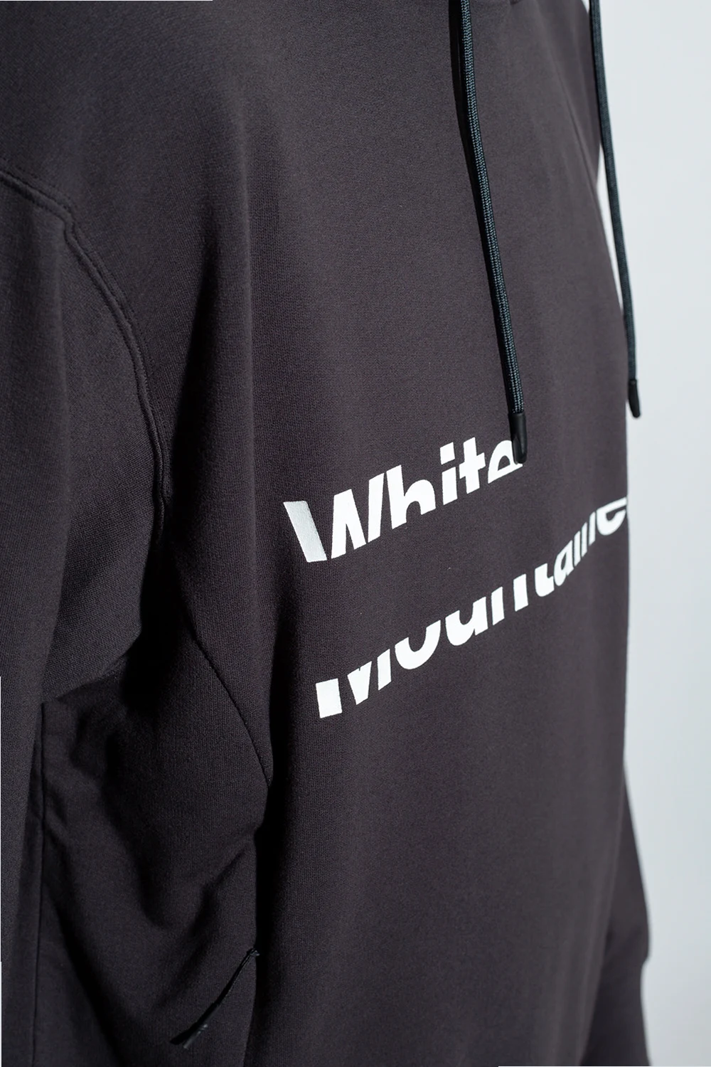 Dark grey hoodie from White Mountaineering. Made of cotton, this garment features a drawstring hood, white logo print, pocket with concealed zips and ribbed trims at the hem and cuffs.