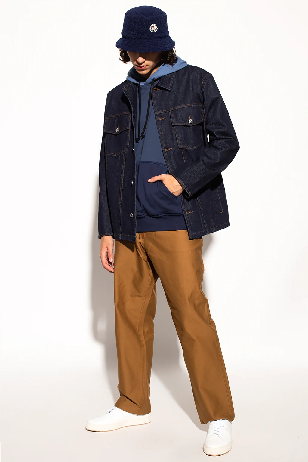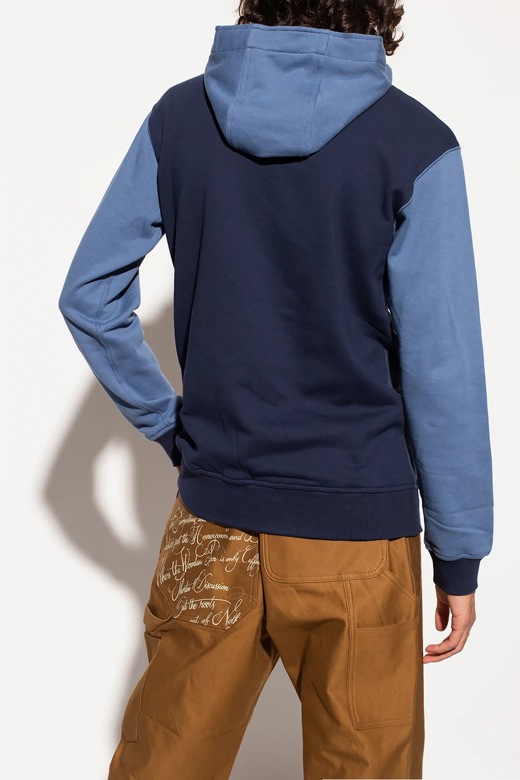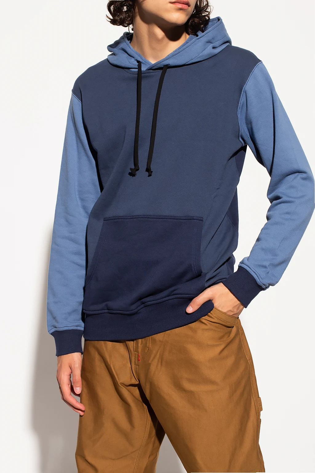 Navy blue and blue sweatshirt with a drawcord-adjustable hood from Comme des Garçons Shirt. Crafted from cotton jersey, this hoodie features a kangaroo pocket and a ribbed bottom hem and cuffs.