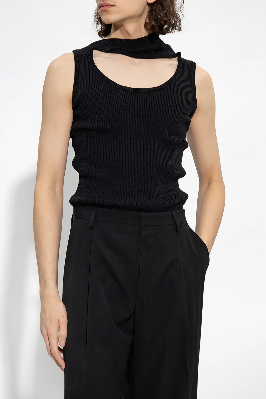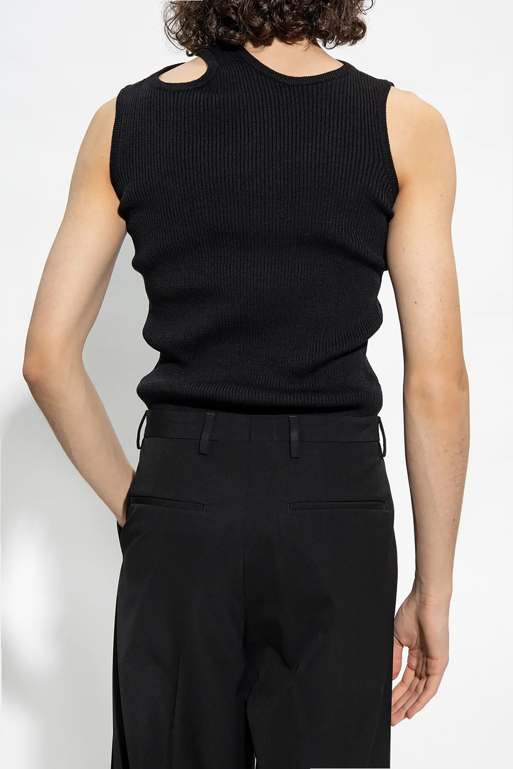 Black ribbed sleeveless T-shirt from Y Project, the ‘Evergreen’ collection. Made from sustainable materials, this garment has an asymmetric neckline with cut-outs.