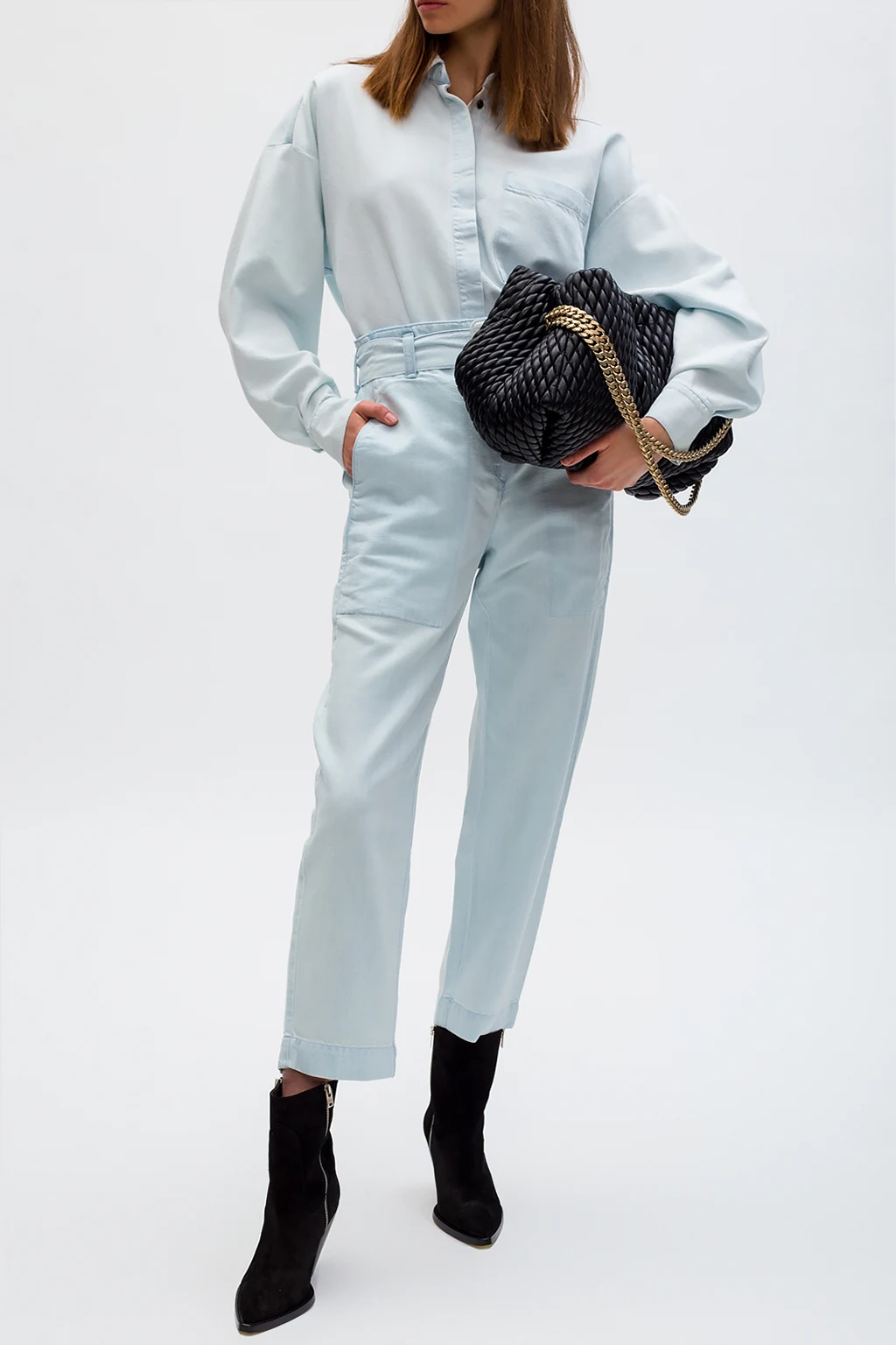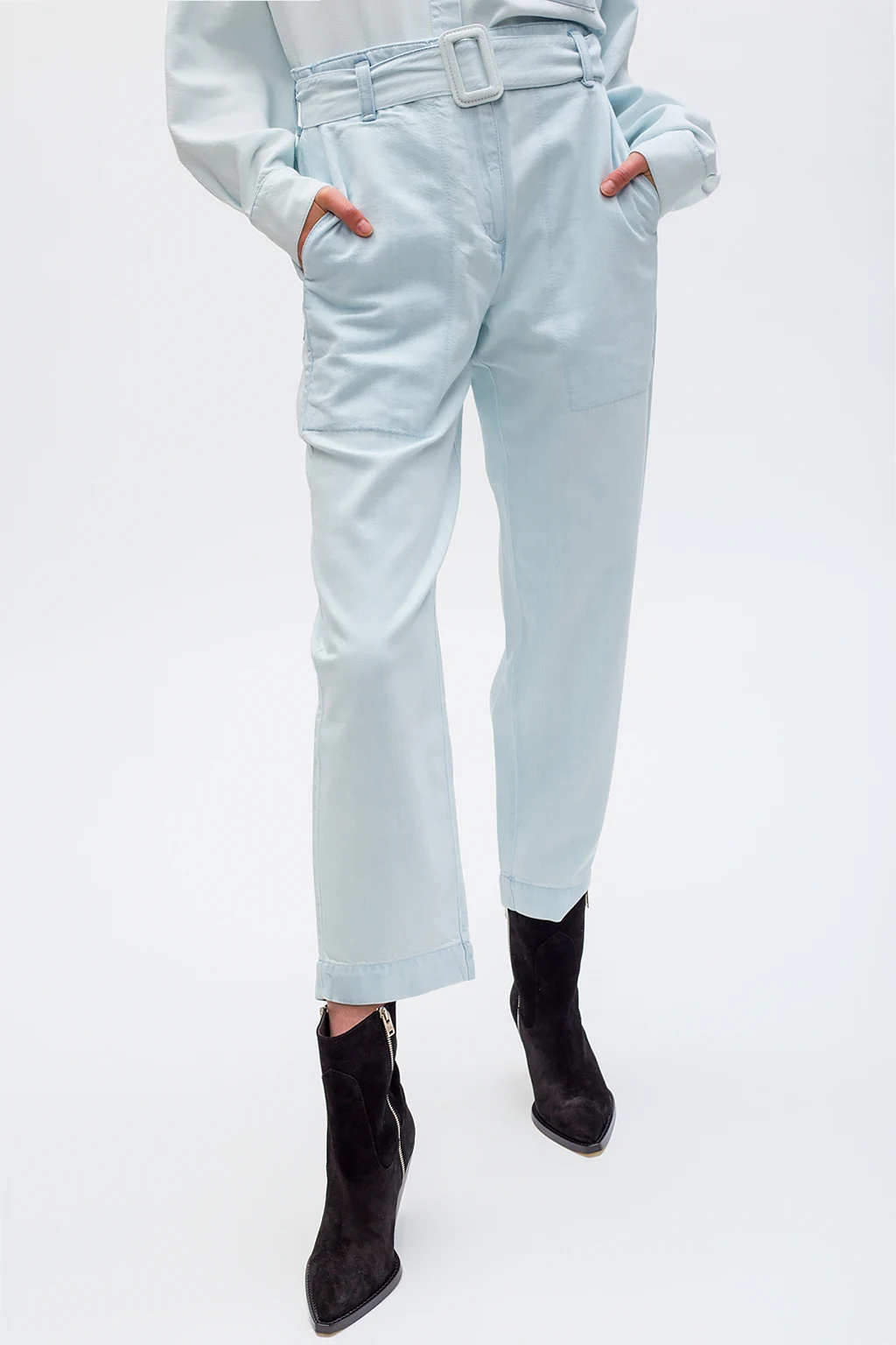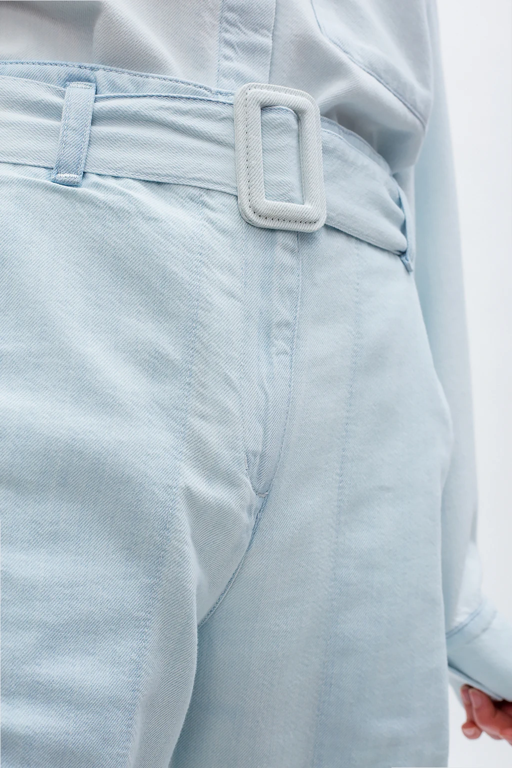 Light blue jeans from Proenza Schouler, the ‘White Label’ collection. Fastened with a zip and button, this pair falls down with straight legs and features a denim buckle belt, two front pockets and two back pockets.