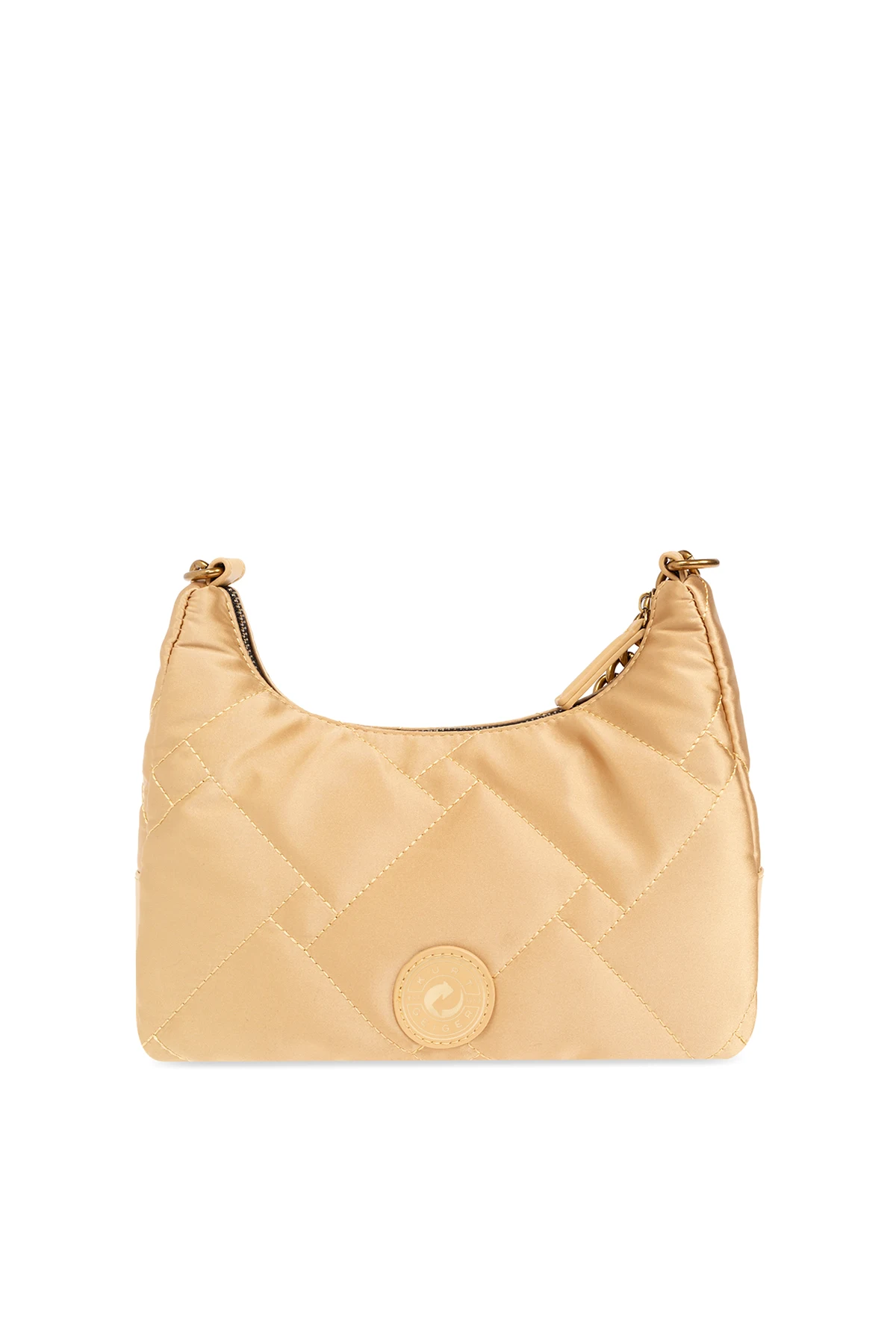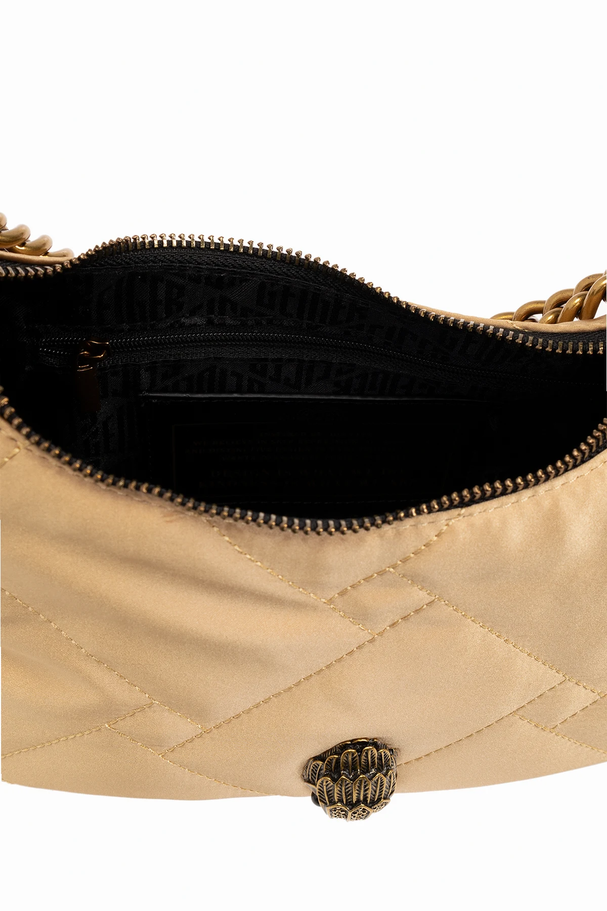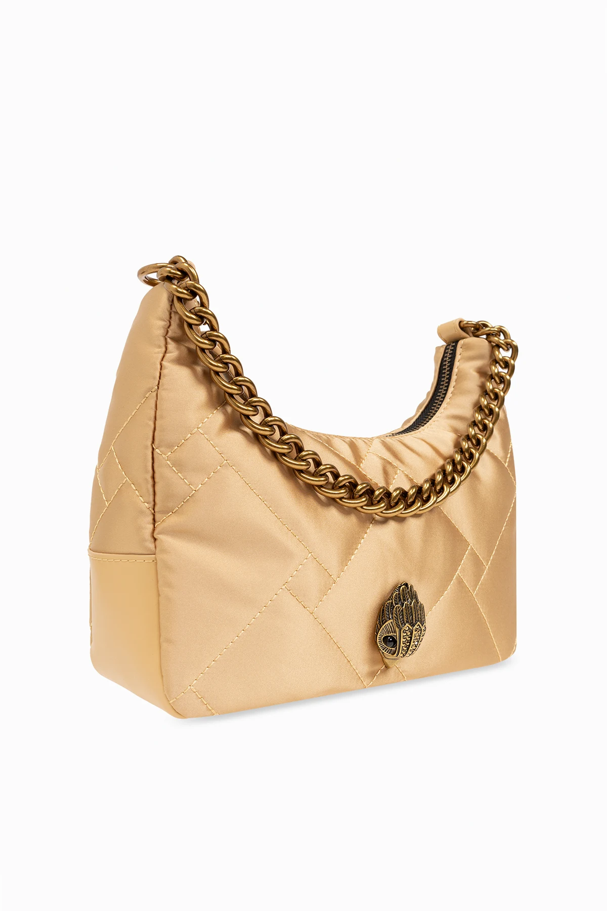 Beige ‘Southbank XS’ quilted shoulder bag from Kurt Geiger. Made of recycled fabric, this model fastens with a zip and is decorated with the brand\'s signature eagle detail embellished with crystals on the front and a logo patch at the back. It is complete with a half-round chain handle, antique gold-tone metal hardware, detachable zipped pouch and one internal compartment with one zip pocket and one slip pocket.