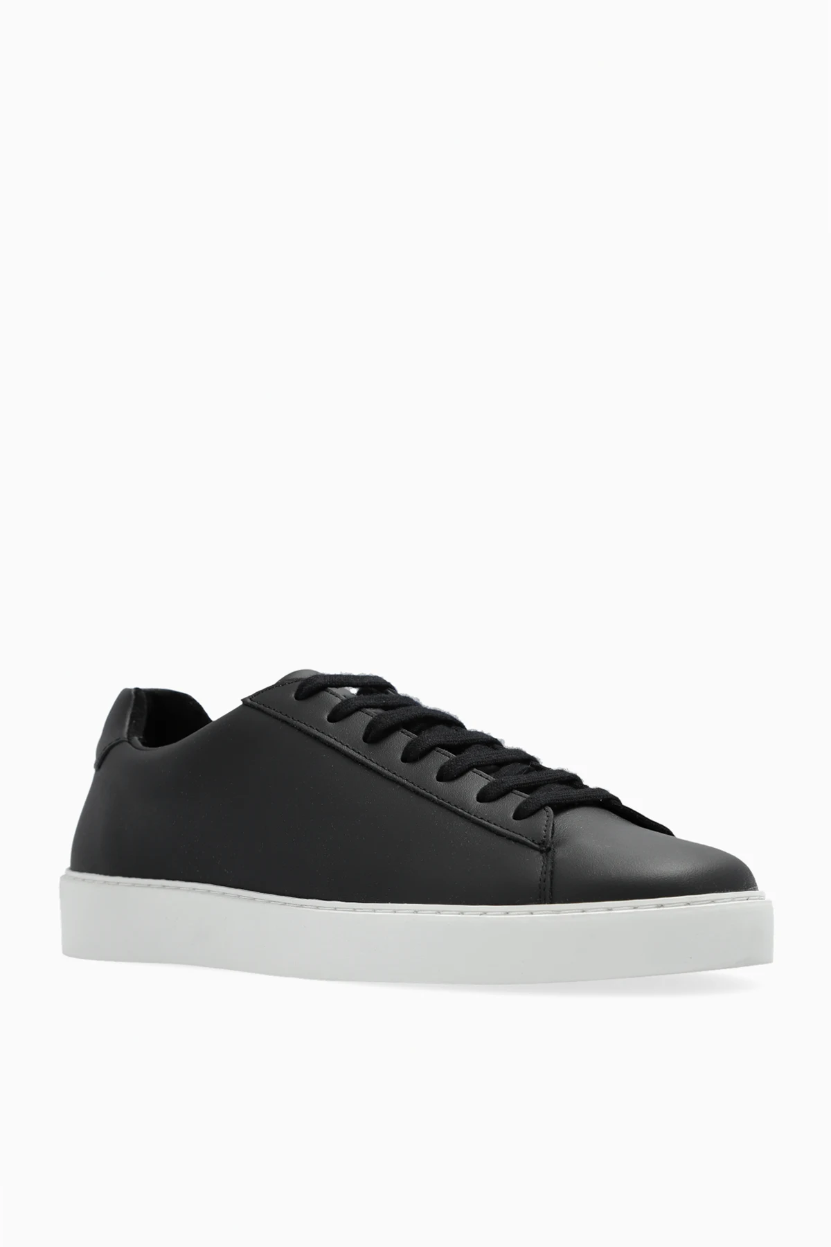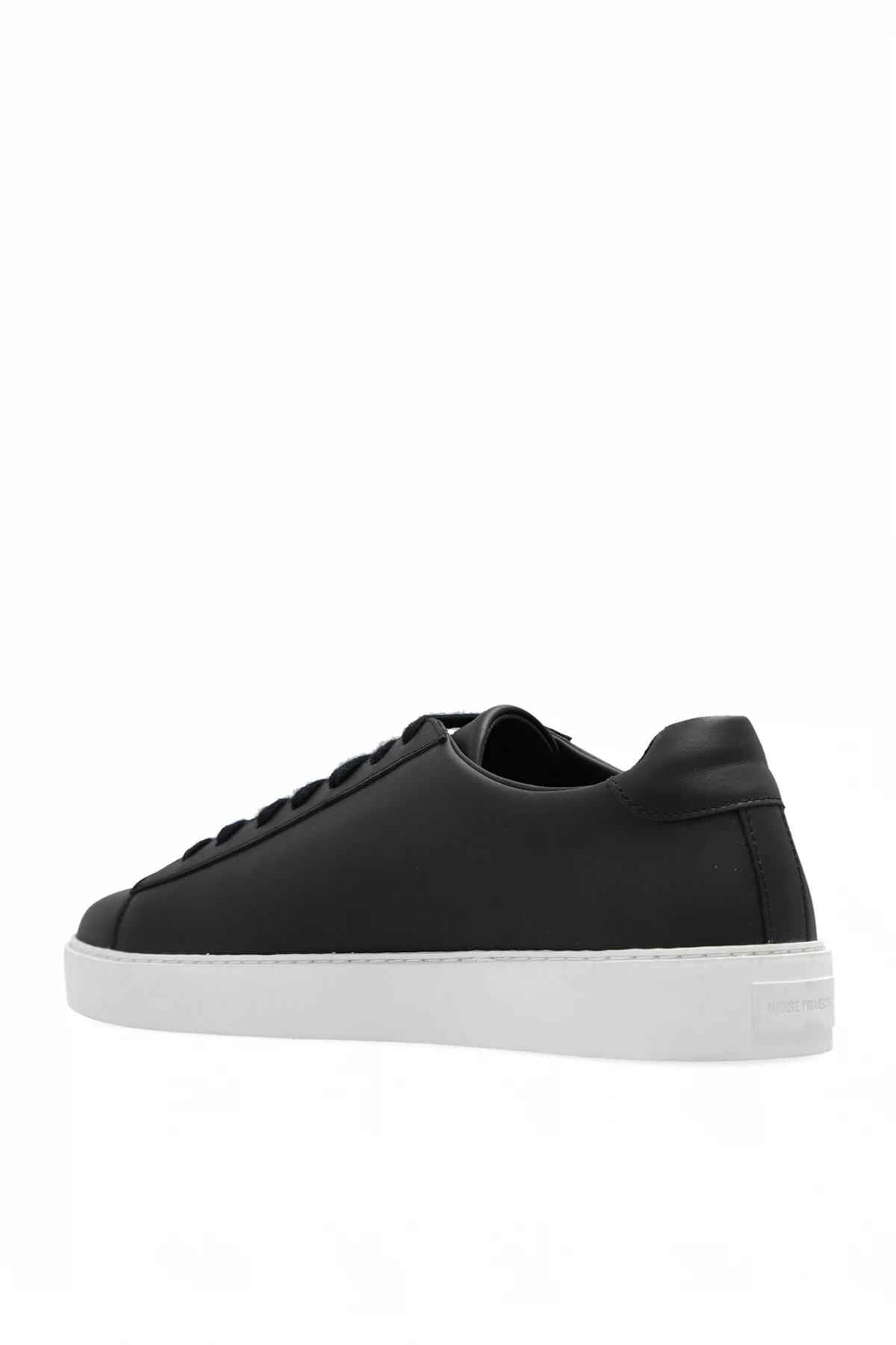 Black ‘Court’ sneakers from Norse Projects. Made from leather, this lace-up model sits on a white rubber sole and showcases an embossed logo on the back.