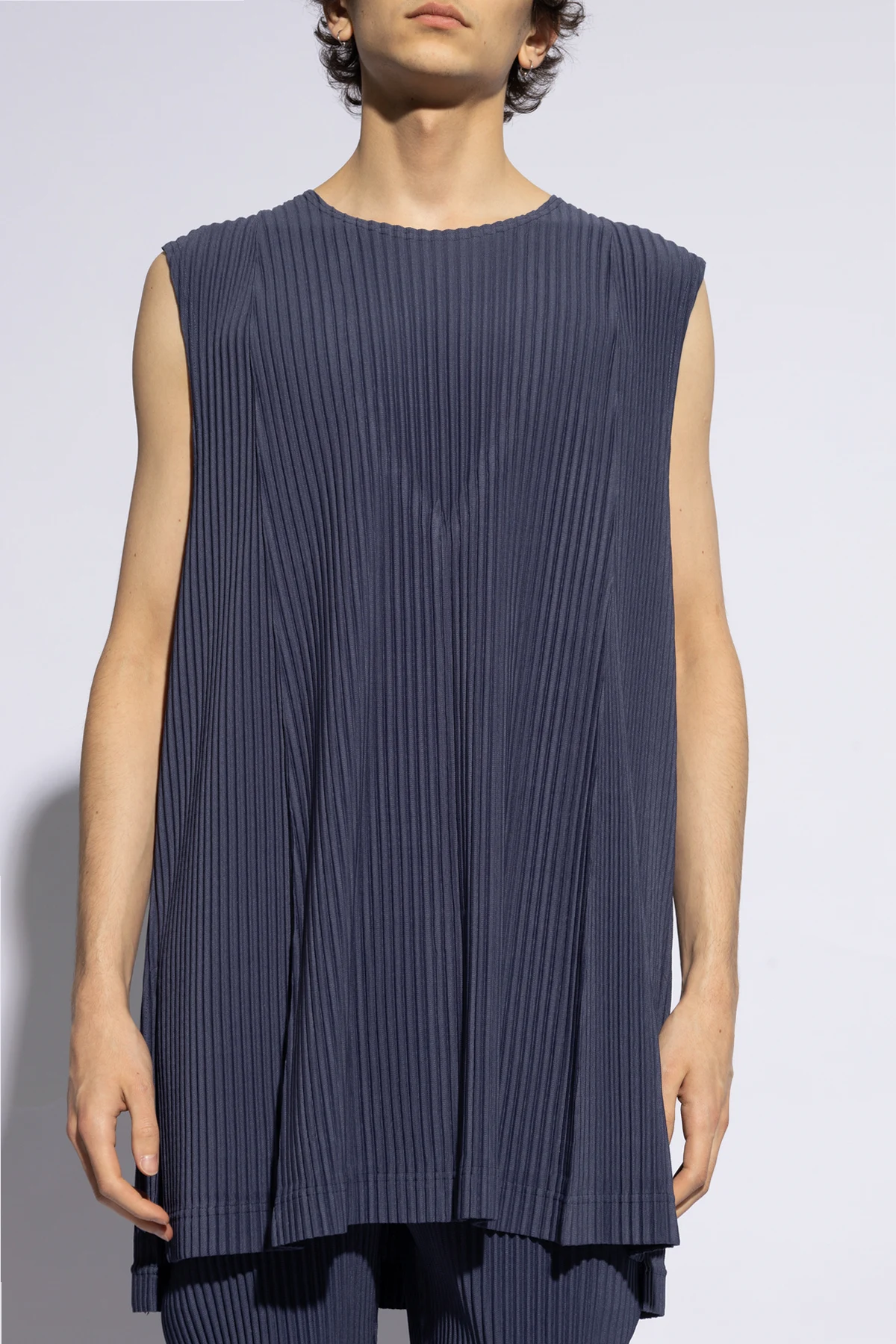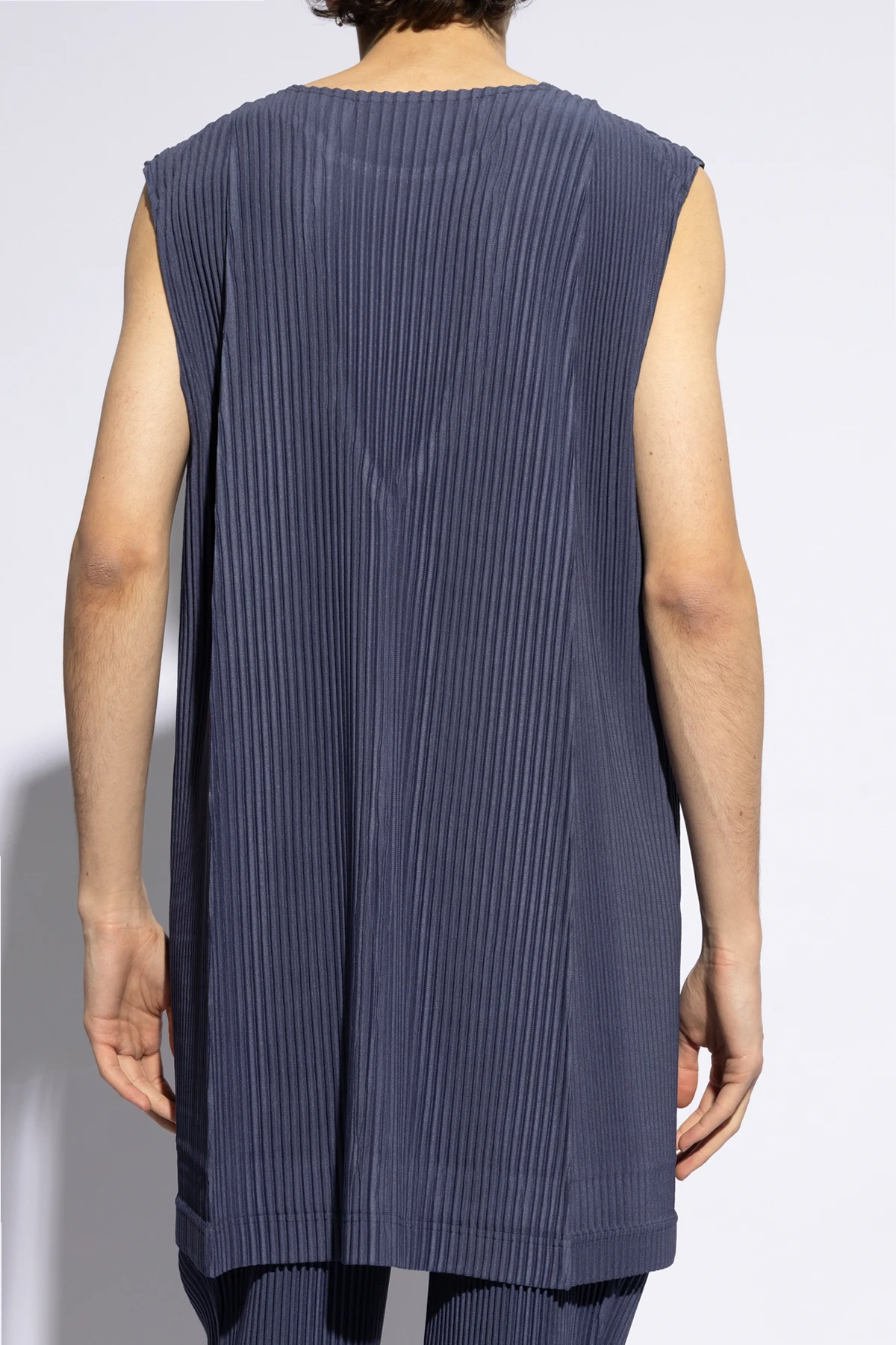 Navy blue sleeveless T-shirt from Issey Miyake Homme Plisse. Crafted using the pleating technique, this style features a relaxed fit, side slits and a round neck.