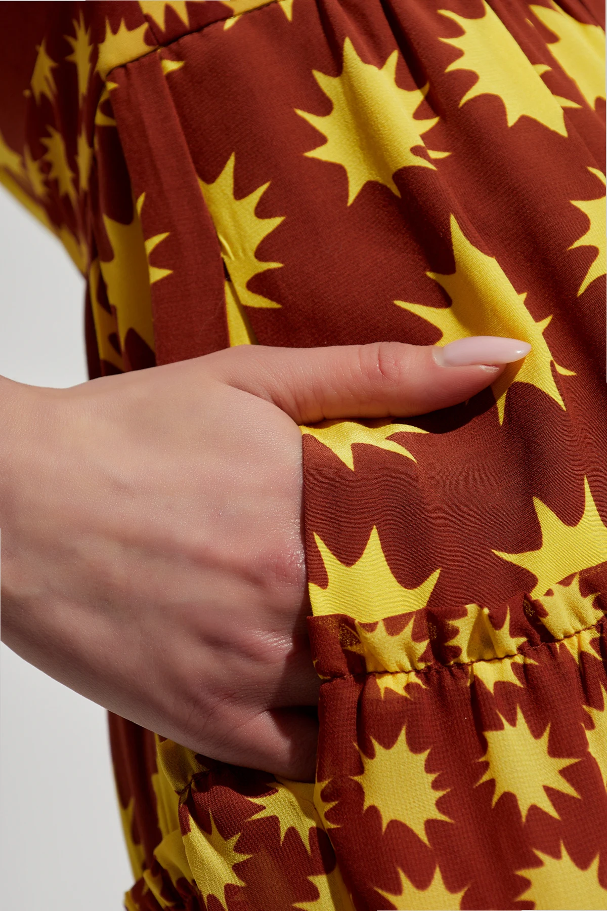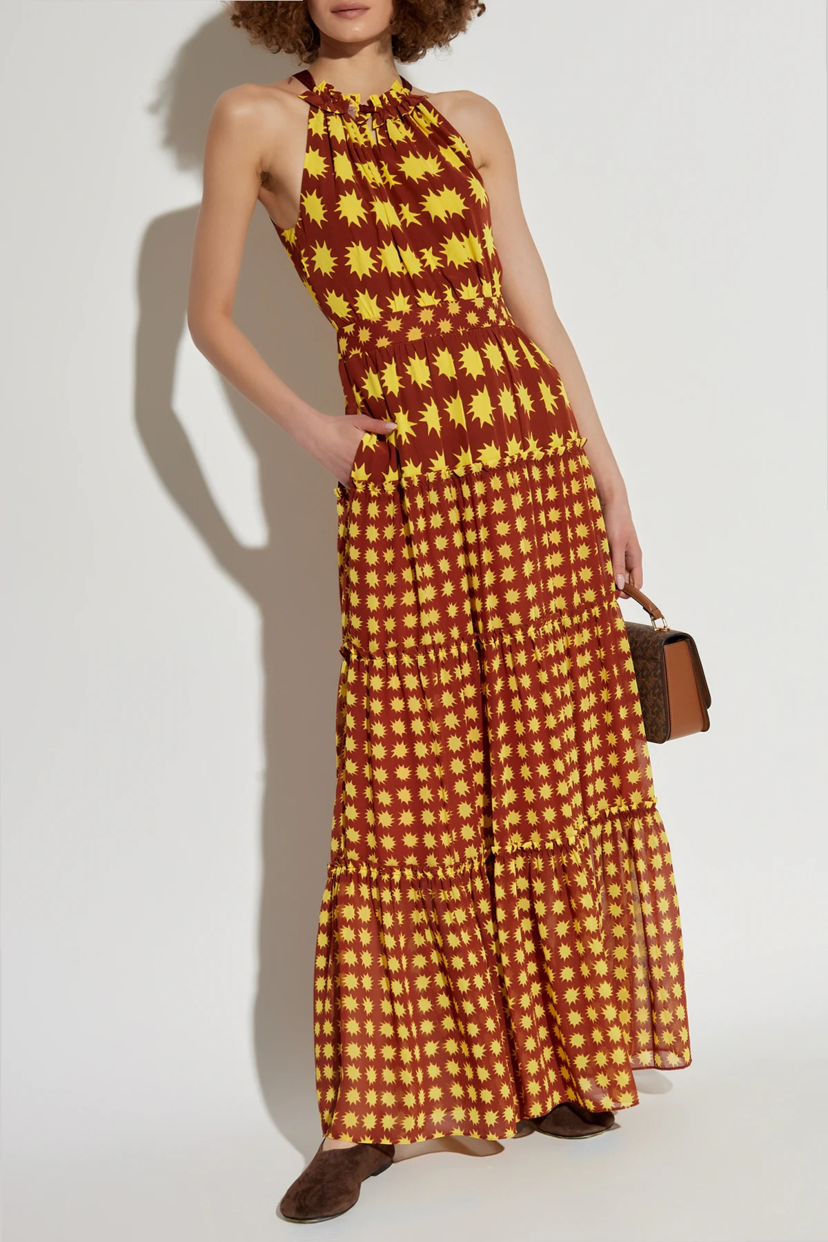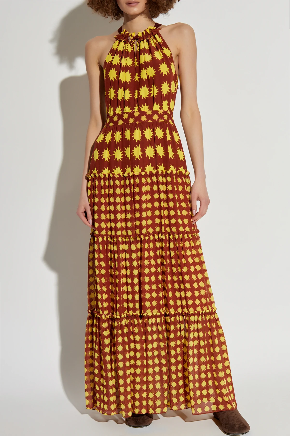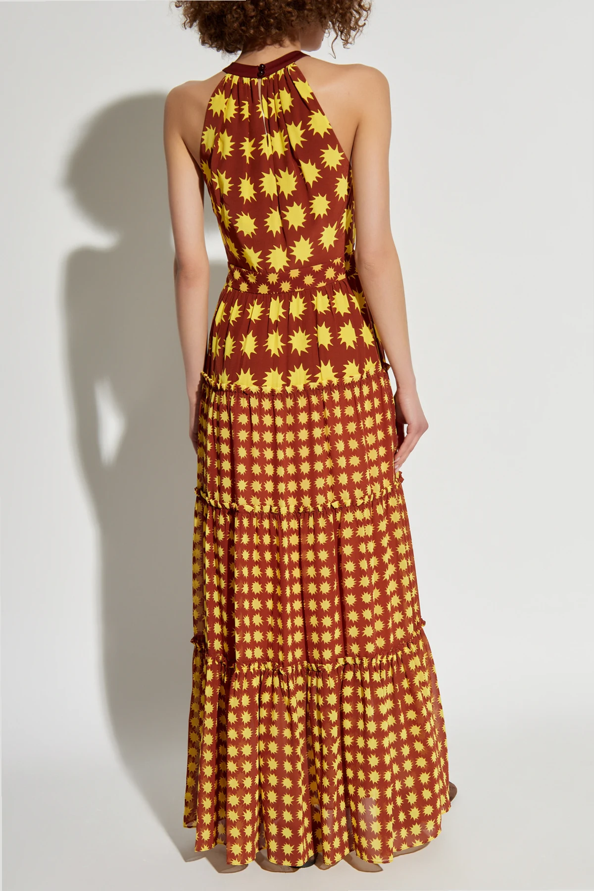 Introducing the exquisite \'Jack\' Long Dress by renowned designer Diane Von Furstenberg, a masterpiece that encapsulates the essence of summer elegance. Crafted from 100% viscose, this dress promises a lightweight and breezy experience, ideal for the warmer seasons. The dominant brown hue, adorned with charming sunflower patterns in a subtle yellow, lends a unique character to this piece. The \'Jack\' dress boasts a floor-length design that gracefully sweeps the ground. A high halter neckline, tied at the back, reveals a tasteful glimpse of the back, enhancing the dress\'s allure. The fitted top transitions into a gently flared skirt, adorned with additional layers of fabric that introduce playful ruffles at the hem. Notably, this dress cleverly marries style with practicality, featuring pockets discreetly placed at the hips for an element of functionality. Further distinguishing this garment are its meticulous details: a button closure at the back, complemented by a concealed side zipper, ensuring a seamless look. This design choice speaks to a commitment to maintaining a sleek and elegant silhouette, free of overt branding or logos. Why Purchase This Product? Unique Design: The sunflower pattern set against a brown background makes for an eye-catching and distinctive look. High-Quality Material: Made entirely of viscose, the dress is not only luxurious but also light and comfortable for summer wear. Functional Elegance: The inclusion of pockets adds a modern, practical touch to a timeless silhouette. Exclusivity: With Diane Von Furstenberg\'s signature design, owning this dress means wearing a piece of high fashion artistry.