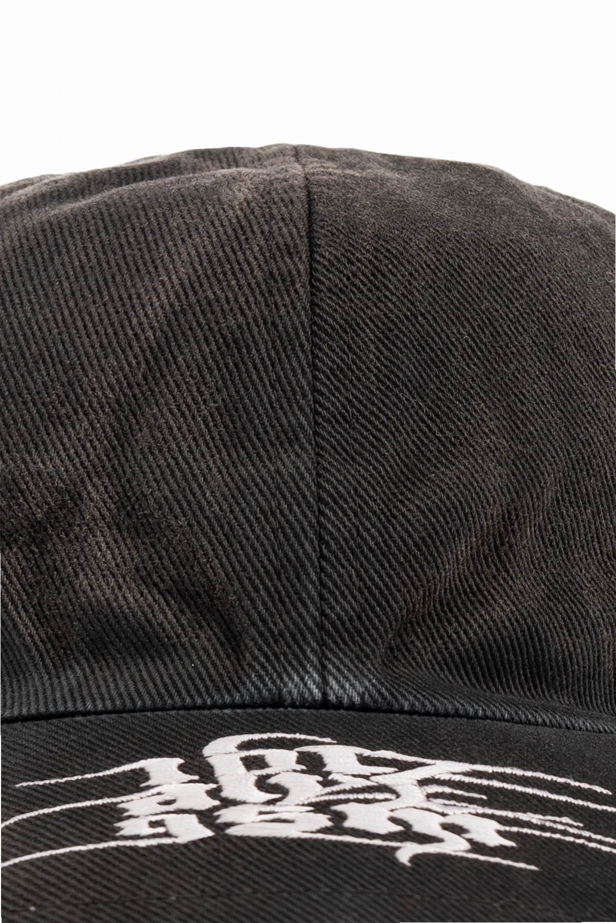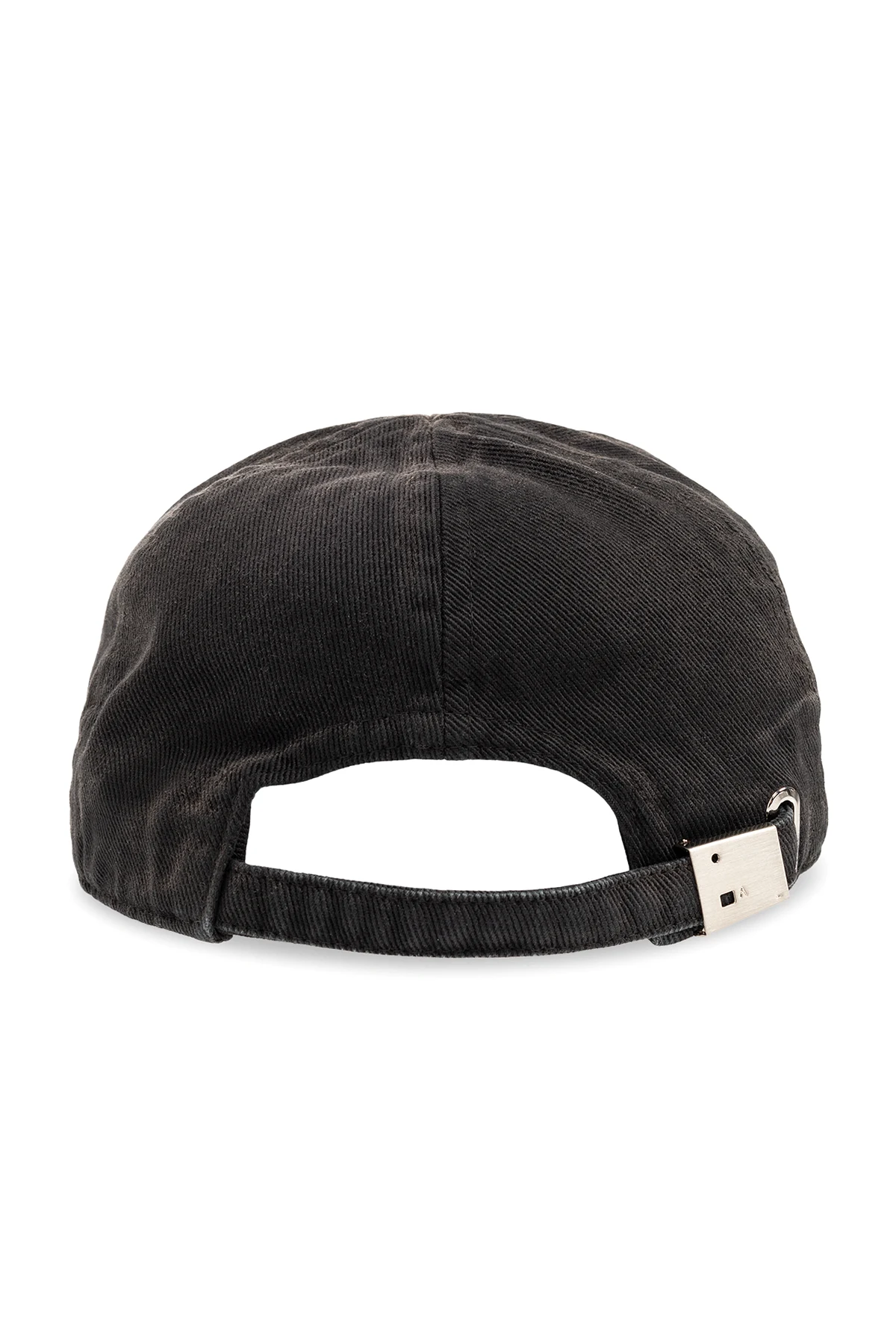 Black baseball cap from 1017 ALYX 95SM. Made from cotton denim with a washed effect, this design features a light grey logo embroidery and adjustable strap with a logo buckle to the back.
