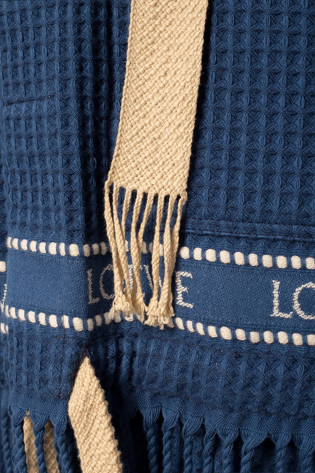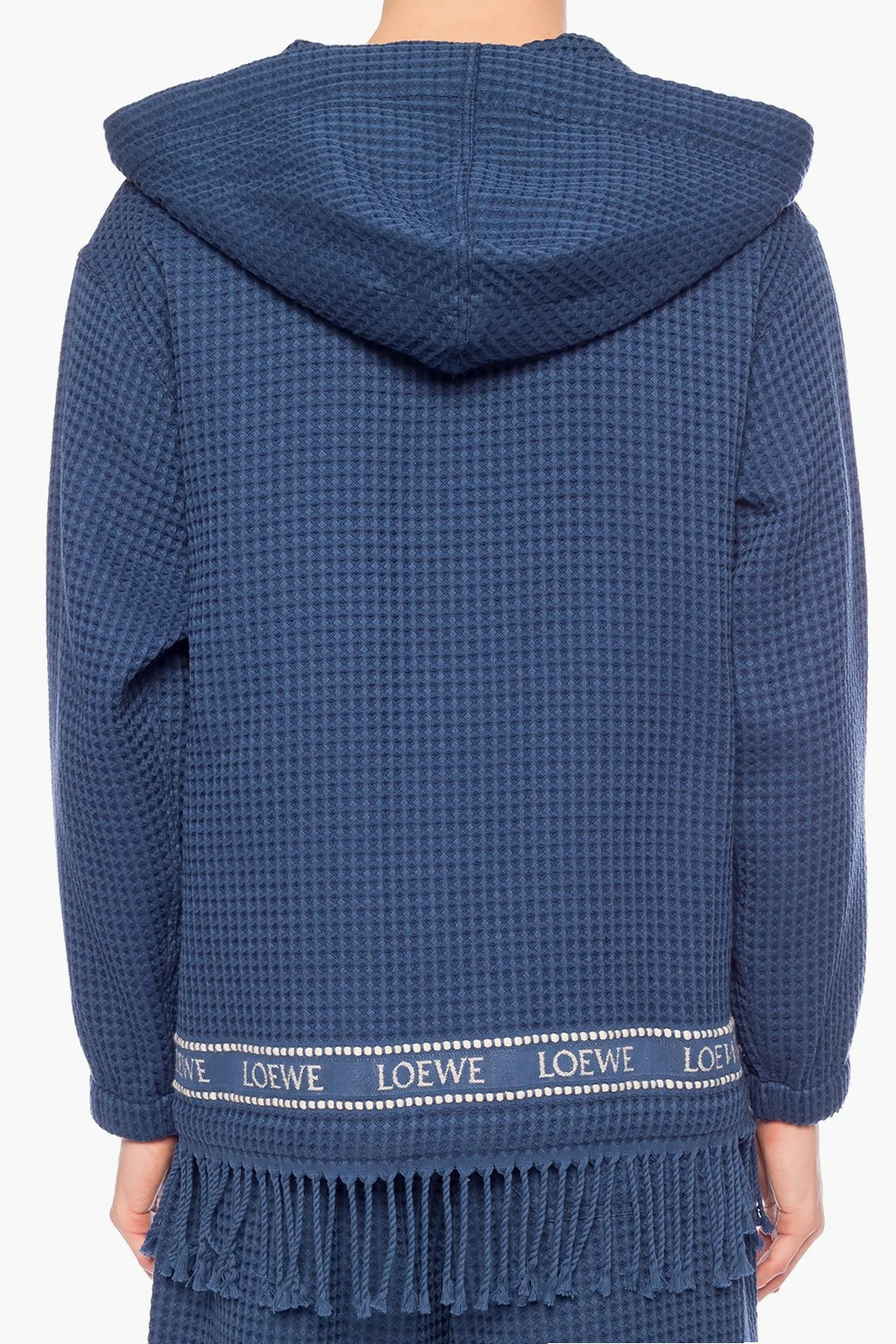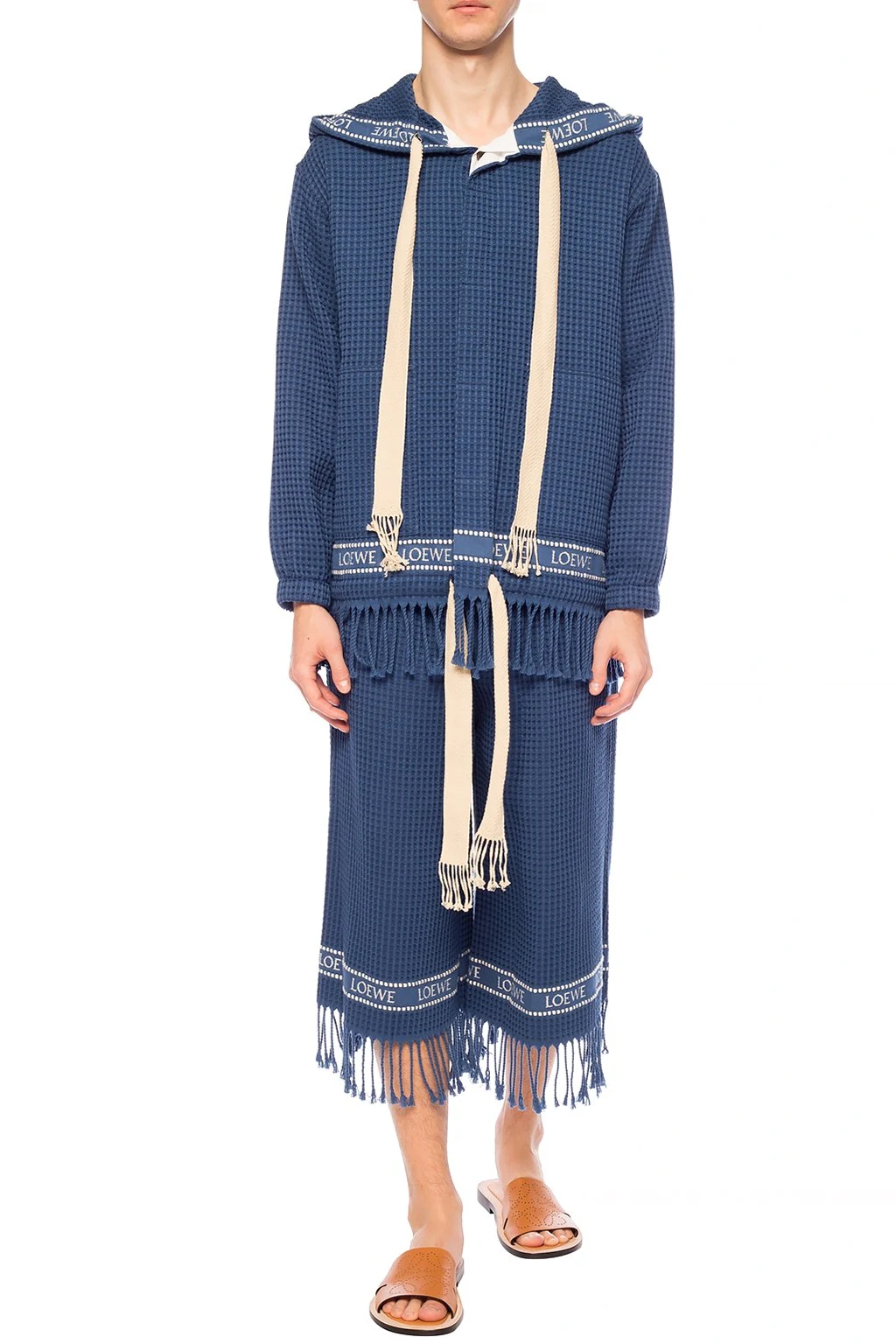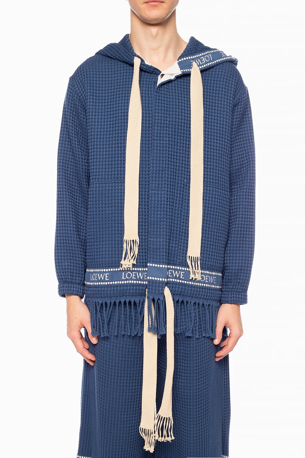 Blue hooded jacket from Loewe. Made of cotton. Fastened with buttons and drawstrings. Decorated with fringes, an embroidered pattern and a logo.