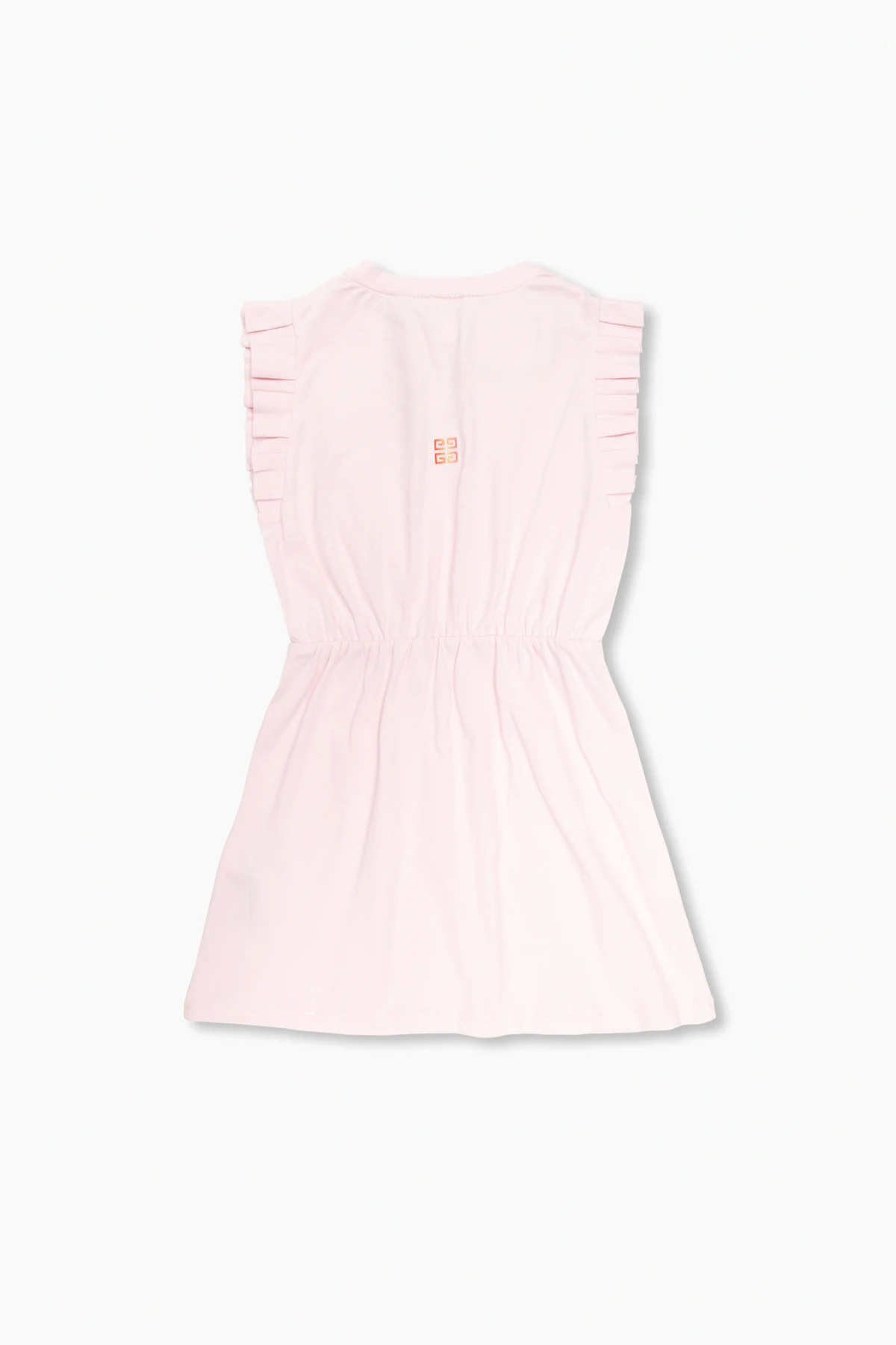 Pink dress from Givenchy Kids. Made of cotton, this design features an embroidered logo pattern and ruffles at the sleeves.