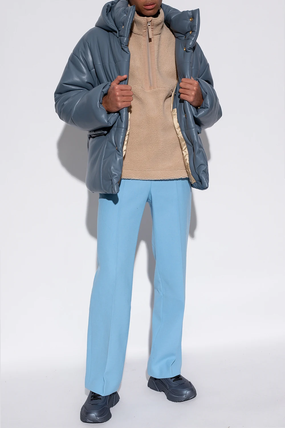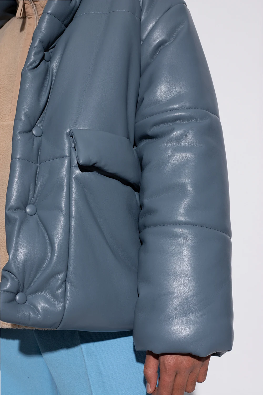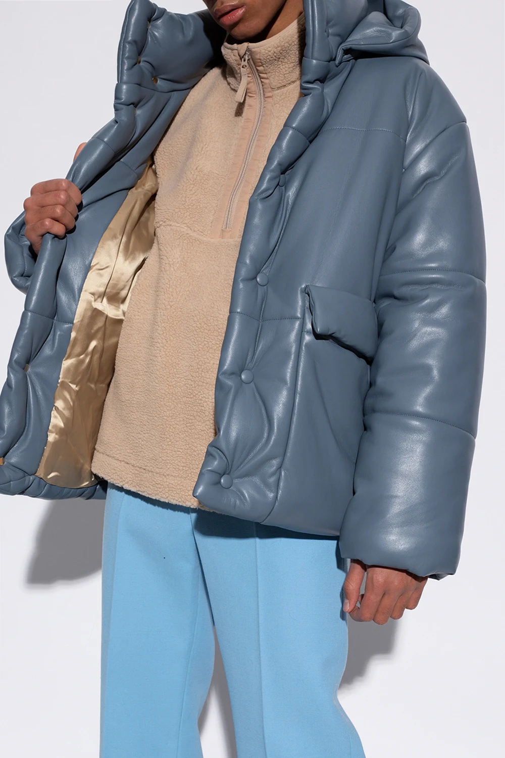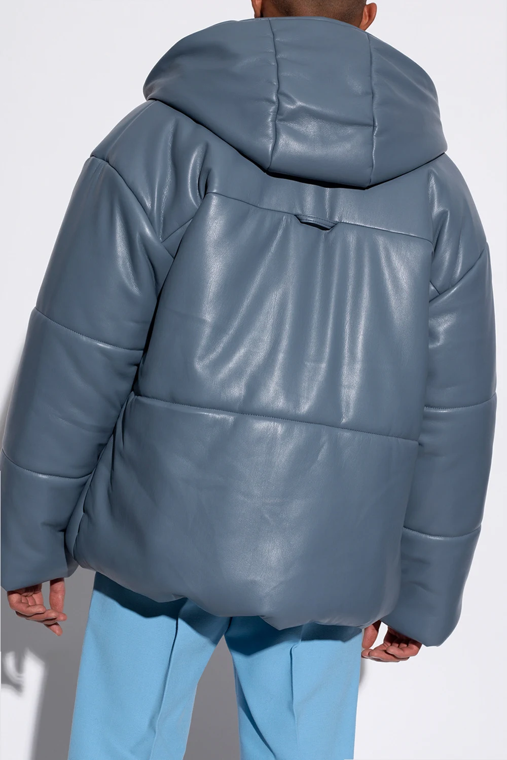 Blue and grey quilted jacket from Nanushka. Crafted from vegan leather, this style fastens via snaps and features a detachable hood, two snap-fastened pockets with flaps on the front and long sleeves with elasticated cuffs.